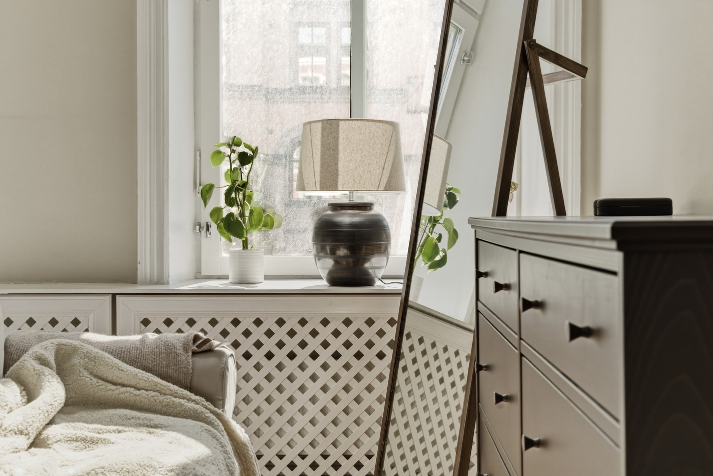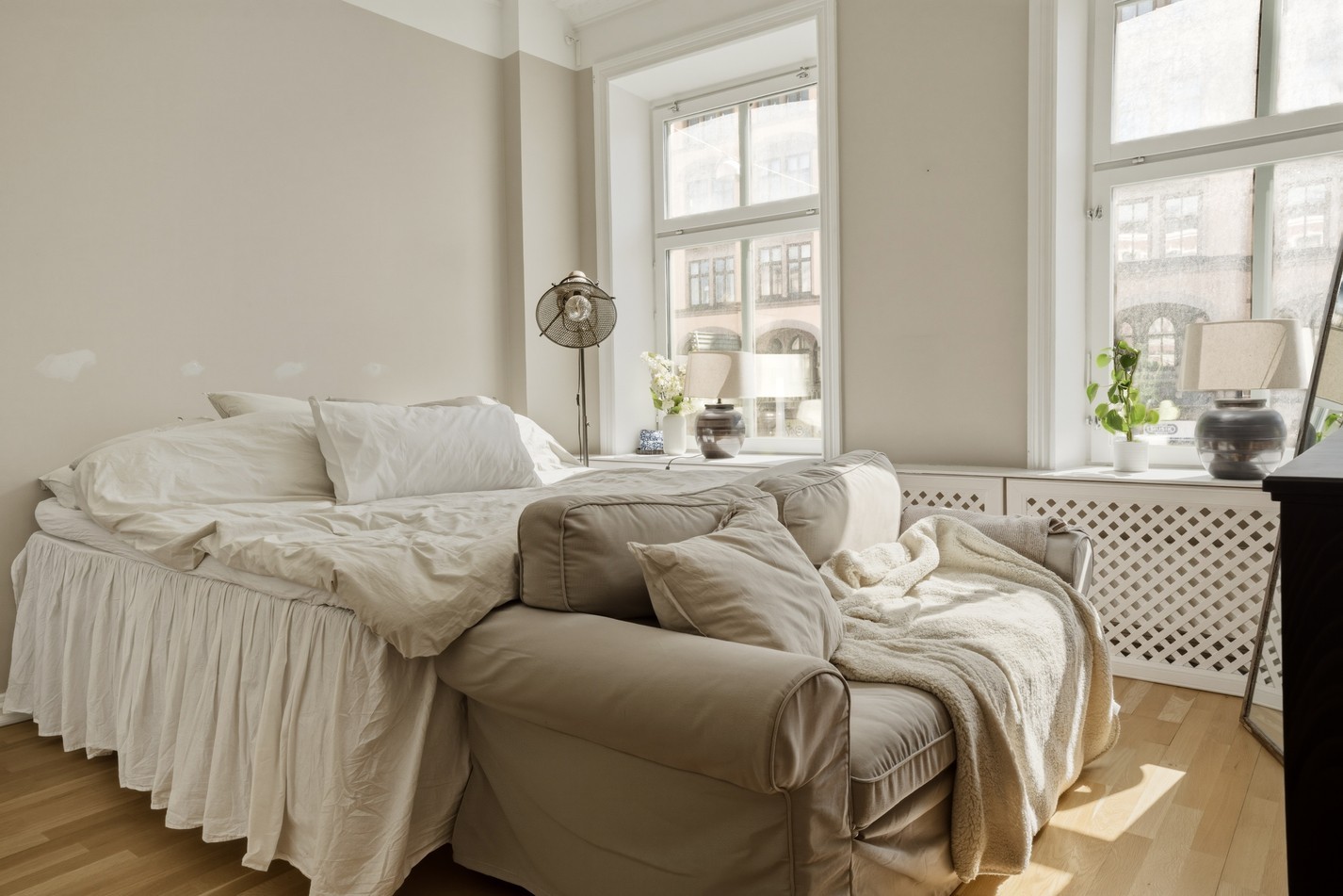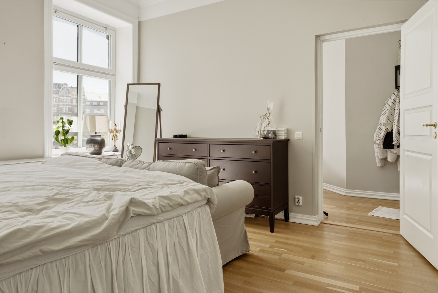 Rofyllt och harmoniskt sovrum med fint ljusinsläpp samt plats för större säng och förvaring.