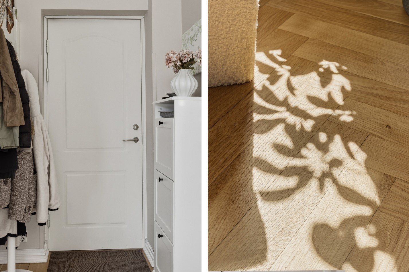 Välkomnande hall med god avhängningsmöjlighet och plats för förvaring. Ljusa ytskikt skapar ett trevligt första intryck.