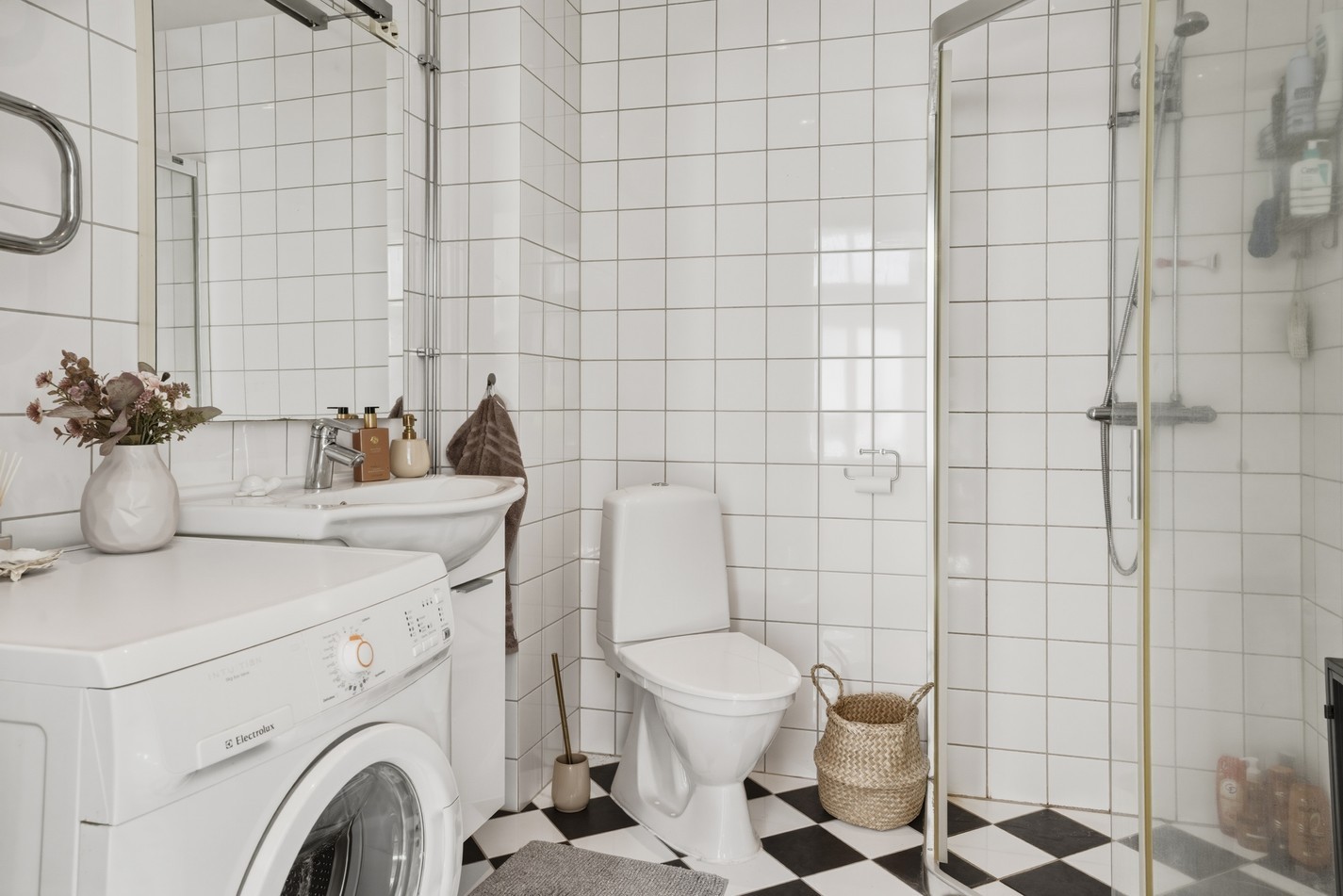 Fräscht badrum med kaklade väggar och klinkergolv. Utrustat med dusch, kommod, wc samt tvättmaskin för extra bekvämlighet.