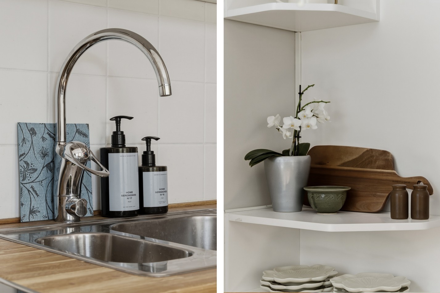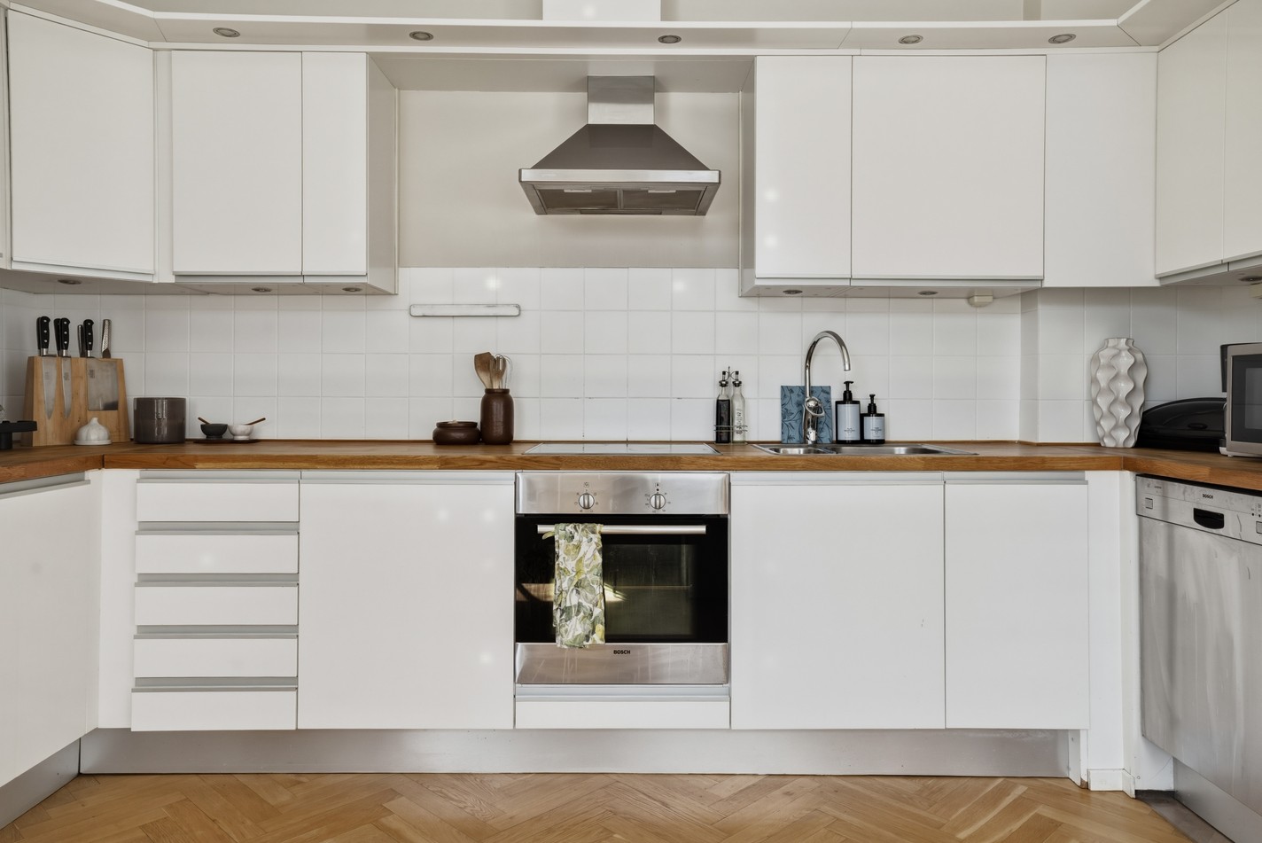 Stilrent och funktionellt kök med goda arbetsytor, bra förvaring och vacker fiskbensparkett som ger karaktär och charm.