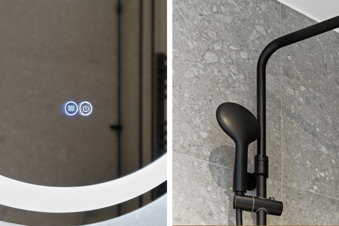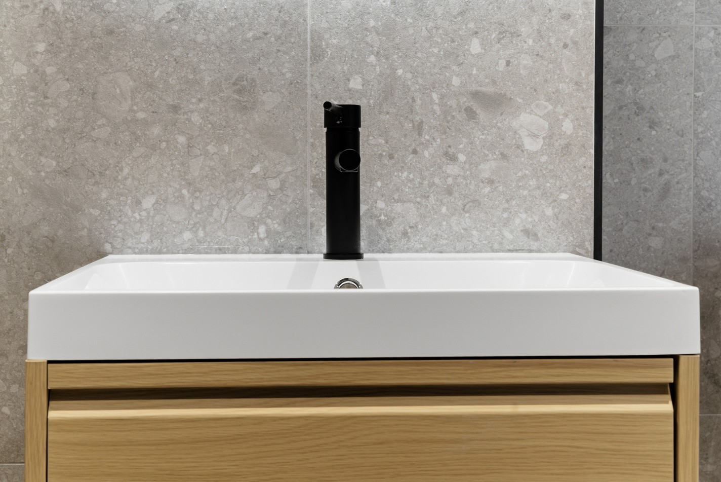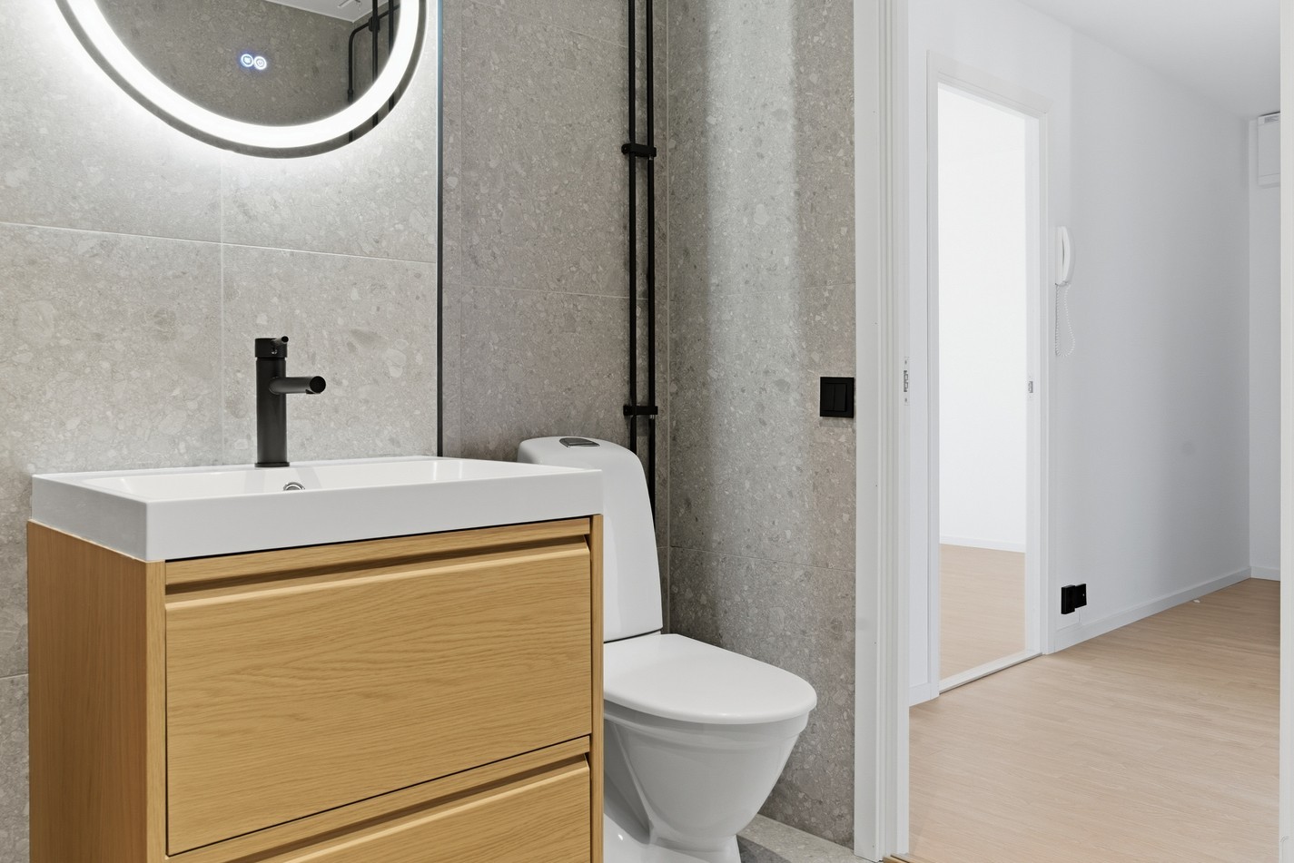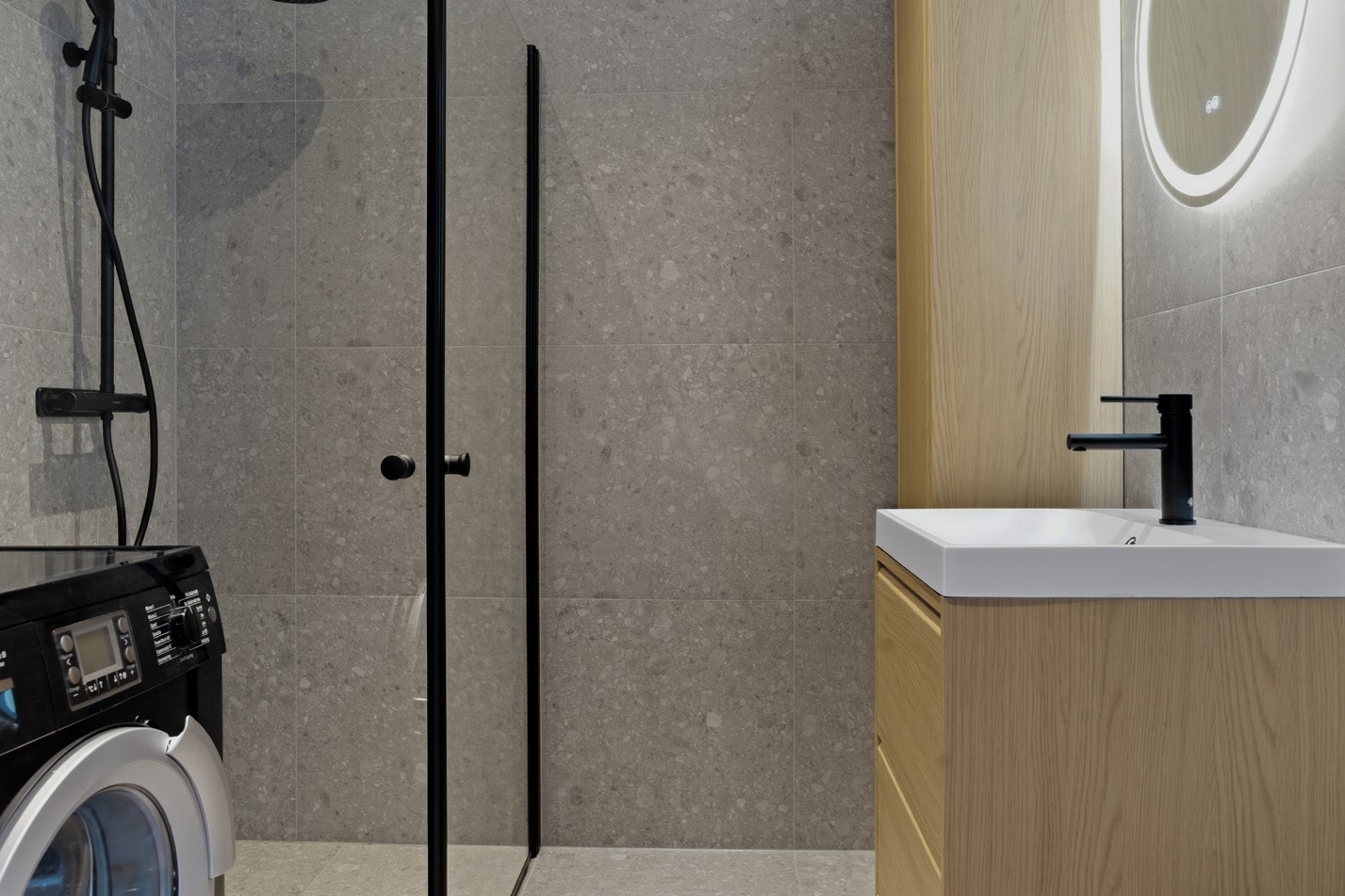 Stilrent och modernt badrum med genomtänkta materialval. Elegant grå stenlook möter varm träkommod och svarta detaljer som ger en exklusiv känsla. Smart planlösning med duschhörna i glas och plats för tvättmaskin – både praktiskt och snyggt. Här får du ett badrum som kombinerar design, funktion och komfort i perfekt harmoni.