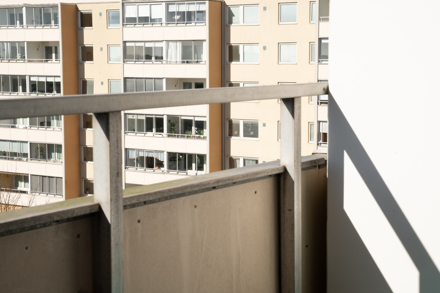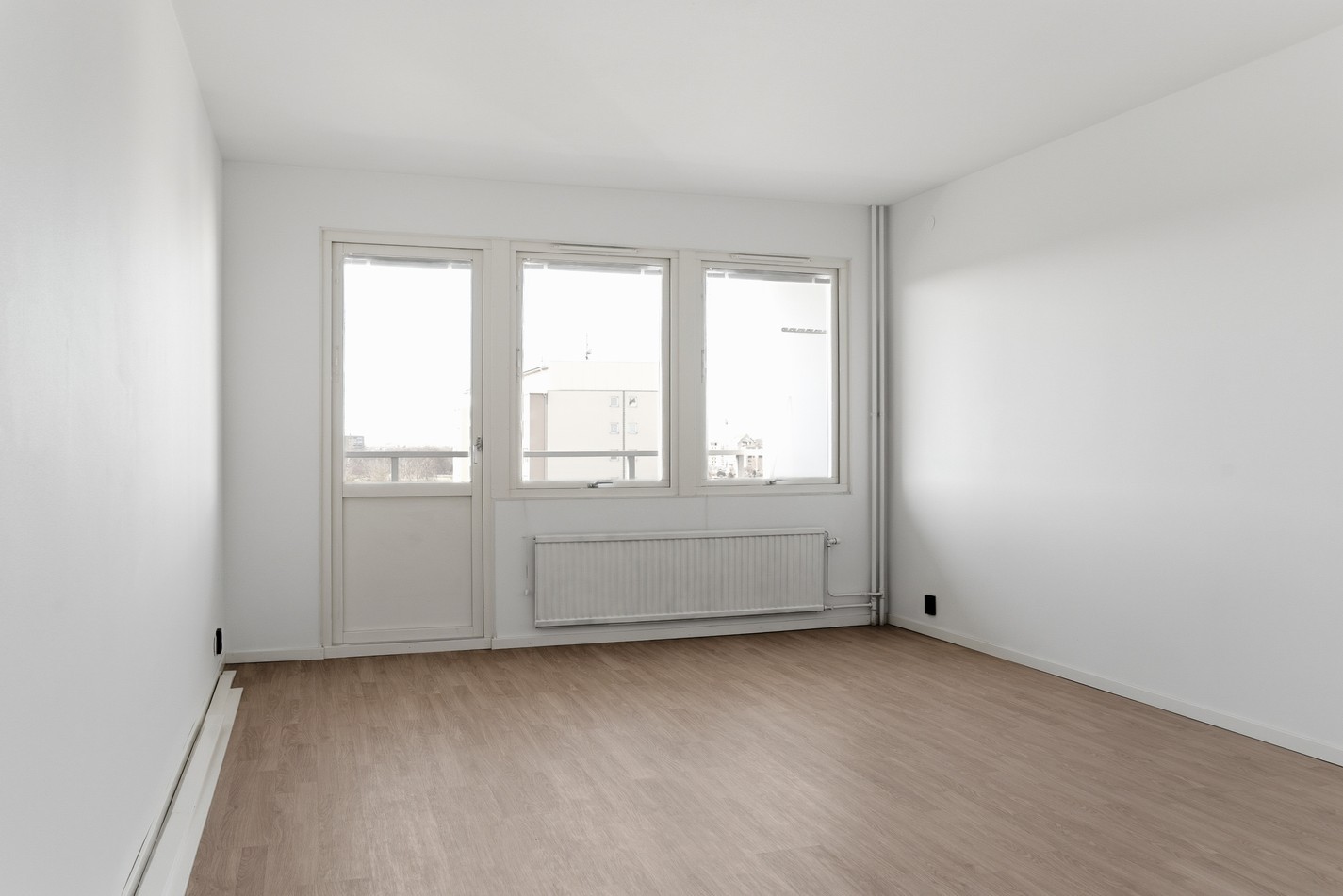 Ljust och rymligt vardagsrum med generöst ljusinsläpp från stora fönsterpartier. Härifrån nås balkongen på våning 8 som bjuder på en ljuvlig utsikt över omgivningarna – en perfekt plats för avkoppling och sociala stunder. De ljusa ytorna skapar en inbjudande och luftig atmosfär med gott om utrymme för både soffgrupp och matplats.