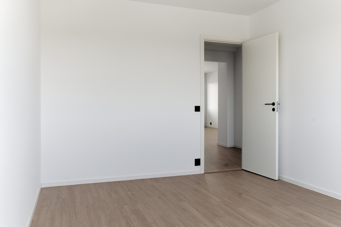 Ljust och rogivande sovrum med stilren, minimalistisk design. De vita väggarna och det ljusa golvet skapar en harmonisk och luftig känsla med gott om utrymme för egen inredning. Här finns alla möjligheter att skapa en personlig och trivsam plats för vila och återhämtning.
