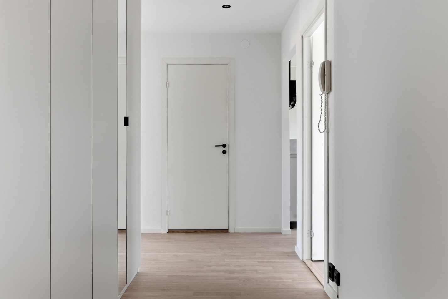Välkomnande och stilren hall med ljusa ytor och smart förvaring. Släta garderobsluckor ger ett minimalistiskt intryck samtidigt som de erbjuder gott om plats för ytterkläder och skor. Det ljusa golvet och de vita väggarna skapar en luftig känsla och sätter tonen för resten av bostaden. En perfekt första känsla av hemmet.