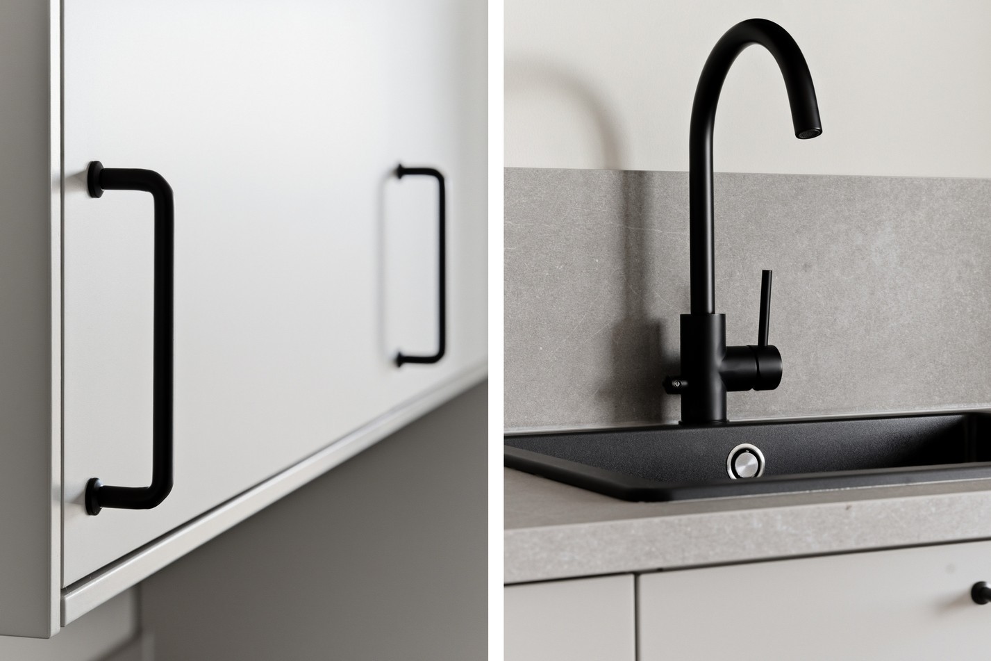 Ljust och stilrent kök med modern, skandinavisk känsla. Ljusgrå luckor kombineras med grå bänkskiva och svarta detaljer som skapar en elegant kontrast. Generösa arbetsytor och gott om förvaring gör köket både praktiskt och funktionellt, medan de stora fönstren släpper in rikligt med ljus och ger en luftig atmosfär. Här får du ett kök som passar lika bra för vardag som för umgänge.