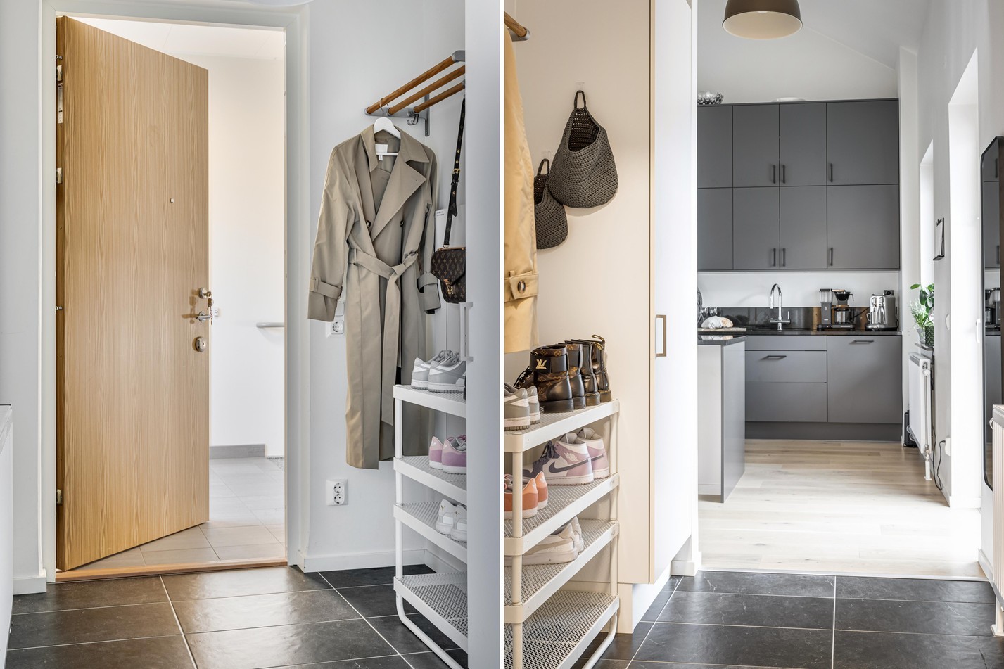 Välkomnande hall med praktisk klinker som tål både vardagsliv och regniga dagar. Här finns gott om plats för avhängning samt förvaring bakom skåp, vilket gör att ytan känns både luftig och funktionell. Från hallen når man smidigt såväl köket som bostadens badrum – en genomtänkt planlösning som underlättar i vardagen.