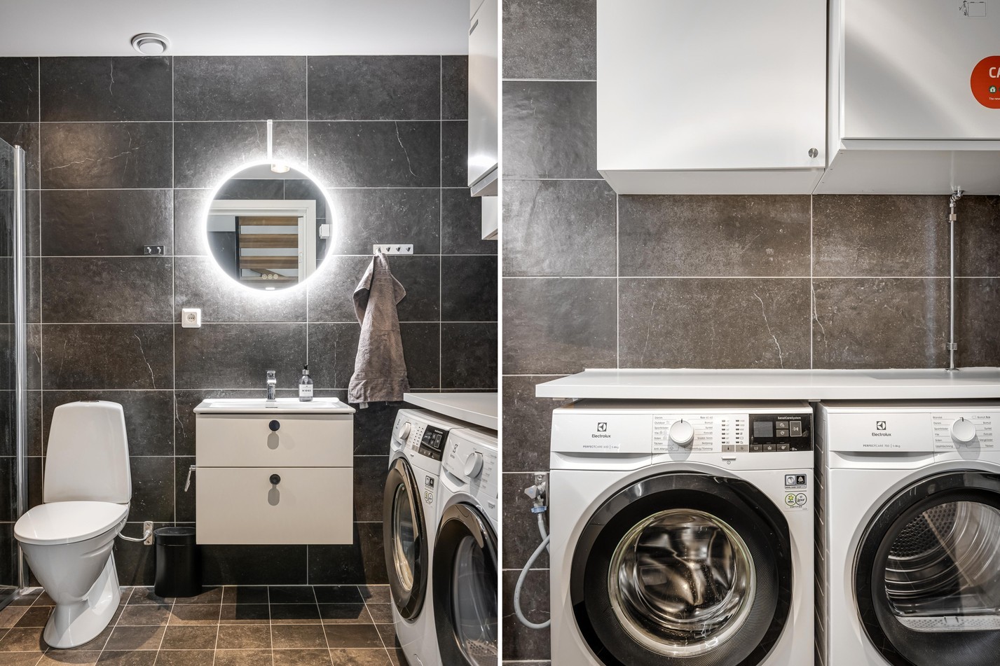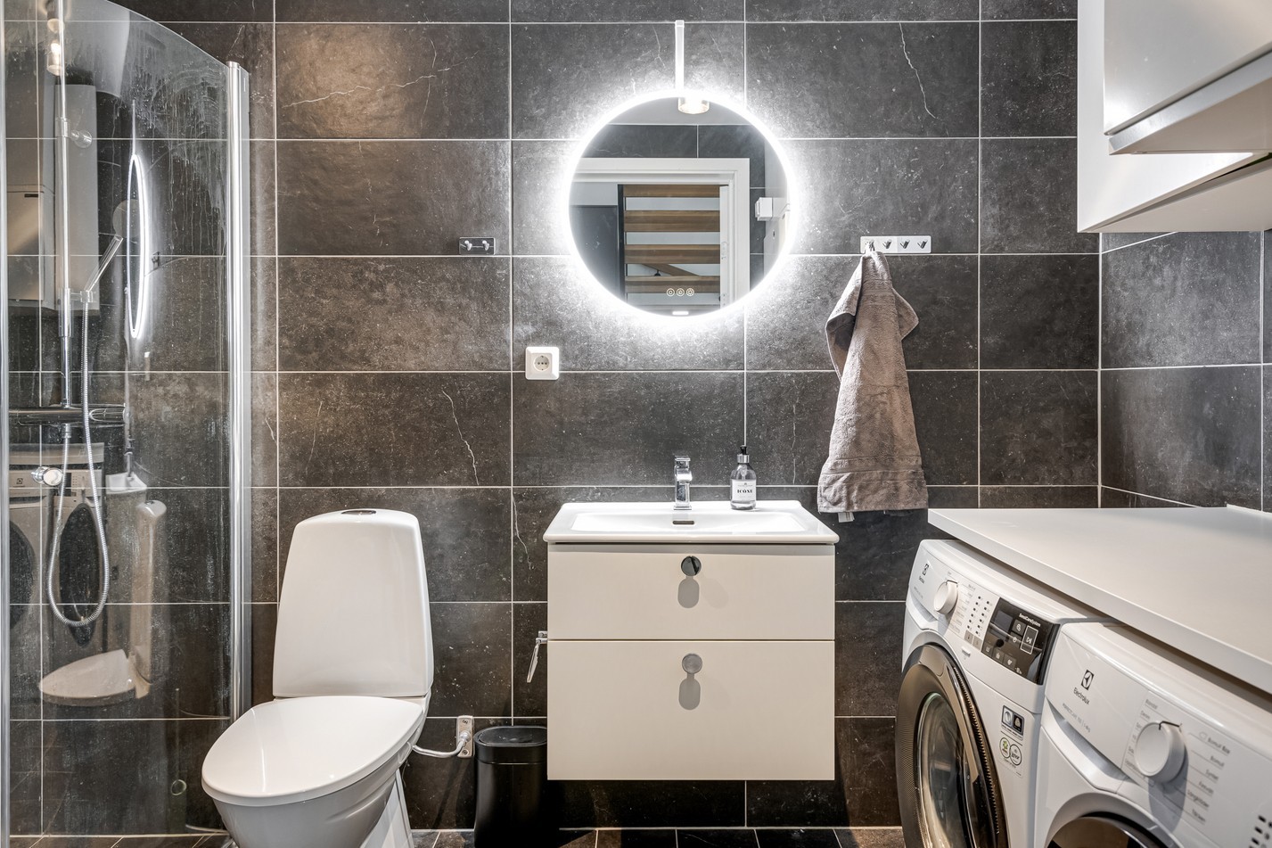 Stilrent badrum med mörka kakelväggar som skapar en exklusiv och modern känsla. Här finns dusch med glasväggar, handfat med kommod samt wc. Den genomtänkta planlösningen rymmer dessutom en praktisk tvättavdelning med både tvättmaskin och torktumlare, arbetsbänk och överskåp – en funktionell lösning som gör vardagen enklare. Det stora runda spegelskåpet med belysning förstärker rummets moderna uttryck och ger en härlig hotellkänsla. Ett badrum som kombinerar både lyx och funktion på bästa sätt.