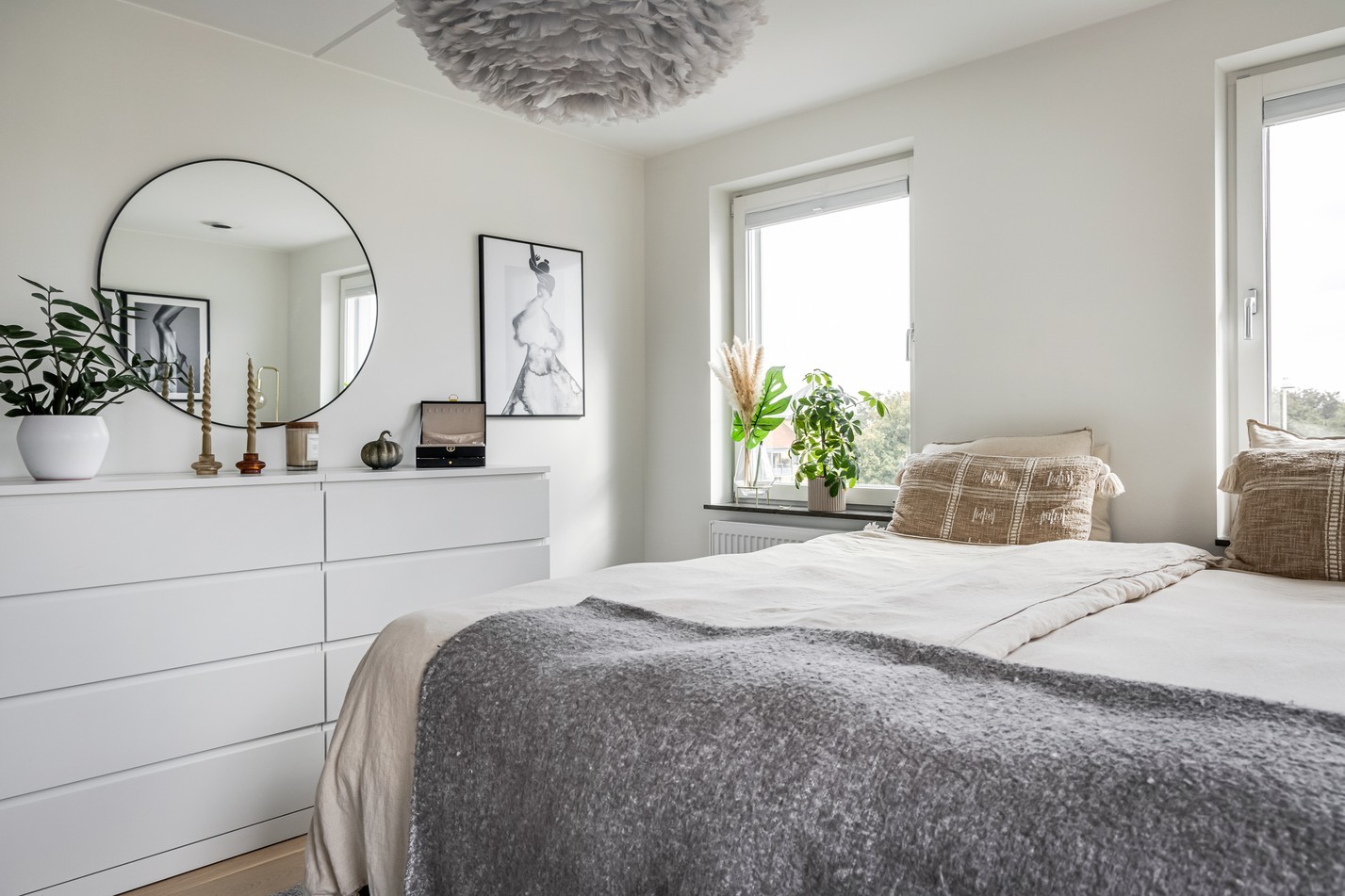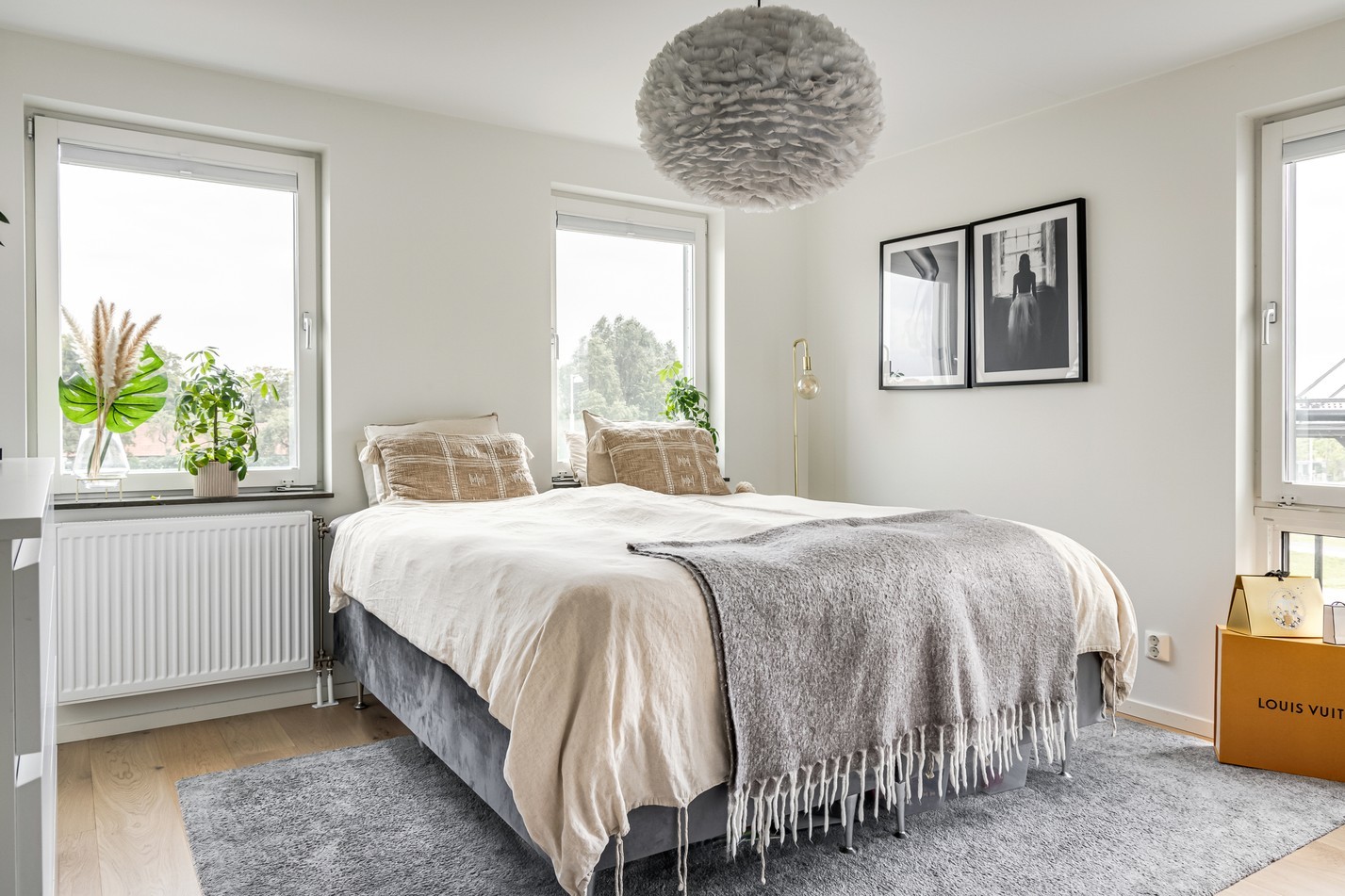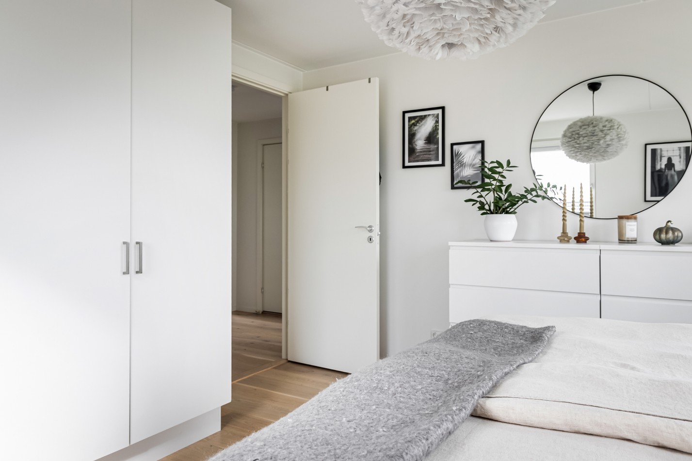 Ett generöst och harmoniskt sovrum som bjuder in till vila. Här strömmar ljuset in från två väderstreck vilket skapar en ljus och luftig atmosfär från morgon till kväll. Rummet är väl tilltaget och rymmer enkelt en dubbelsäng med tillhörande möbler, samtidigt som det finns utrymme för extra förvaring eller en mysig läshörna. De ljusa väggarna i kombination med vackra trägolv och stilfulla detaljer ger en tidlös bas att inreda efter egen smak. Den genomtänkta planlösningen med garderober gör att förvaringsmöjligheterna är både praktiska och diskreta. Detta sovrum är en perfekt plats för avkoppling – en privat oas där man kan dra sig undan från vardagens brus och njuta av lugnet.