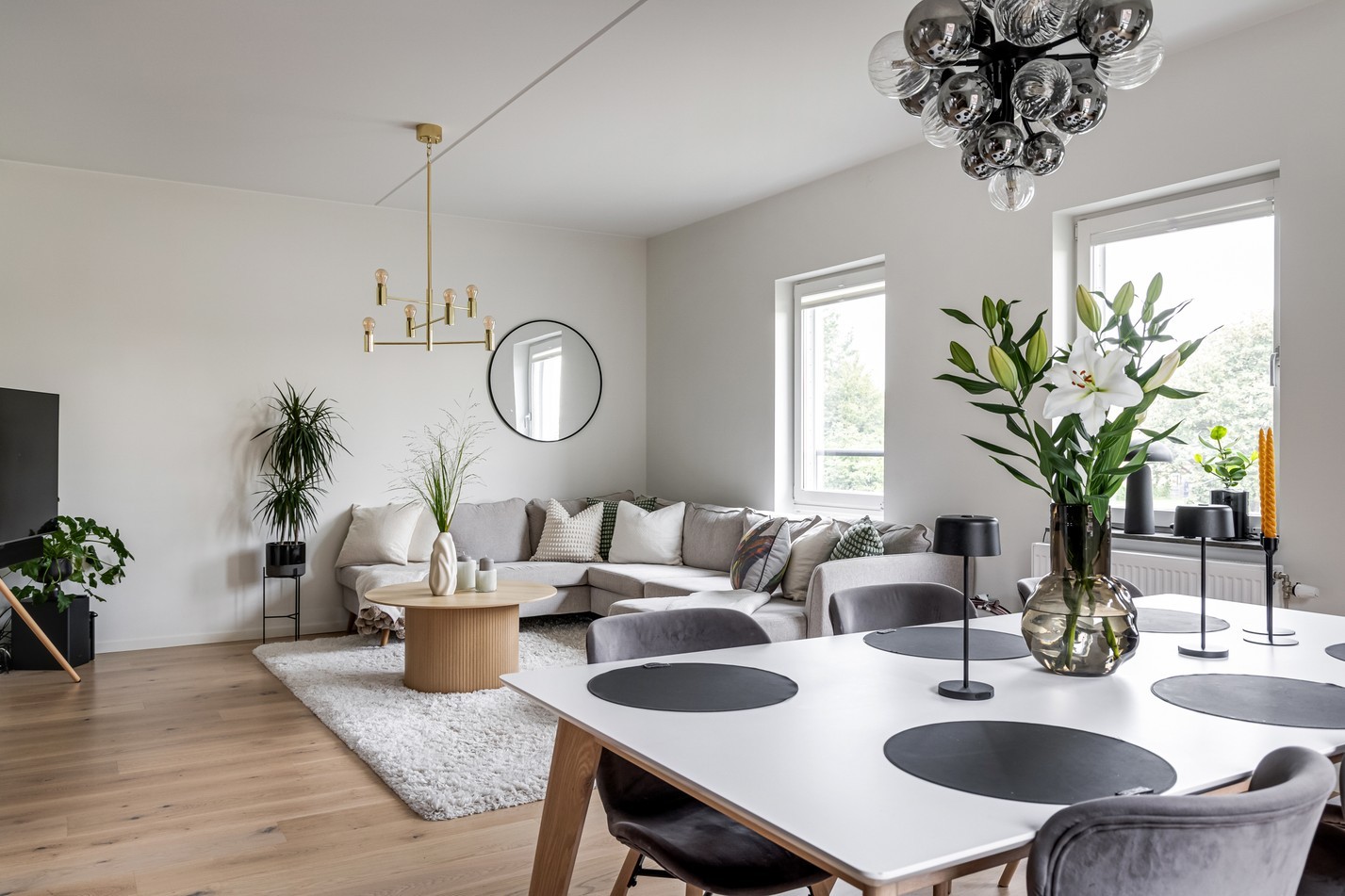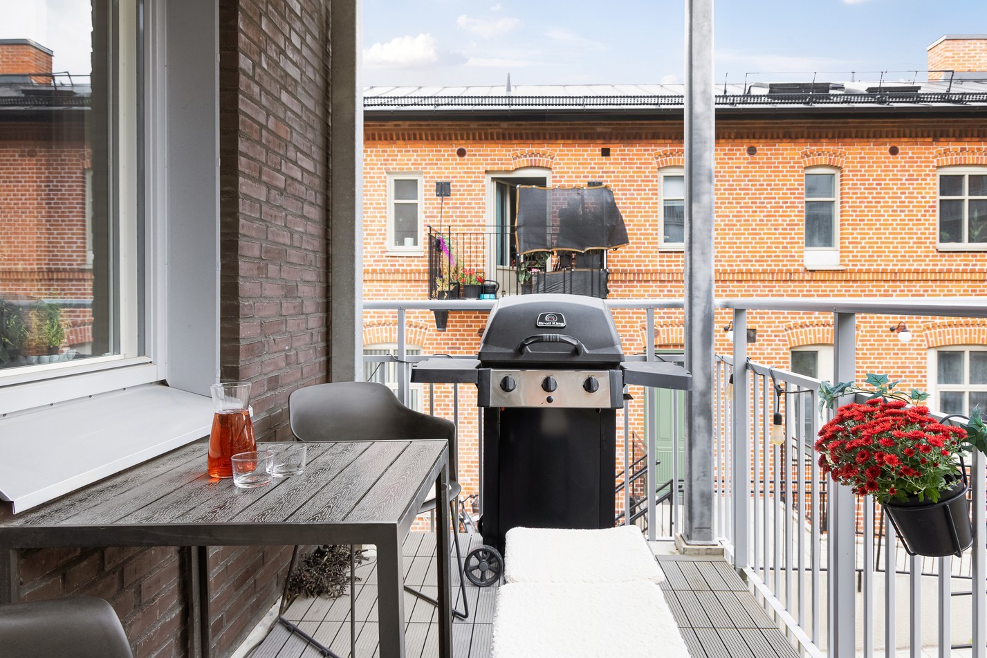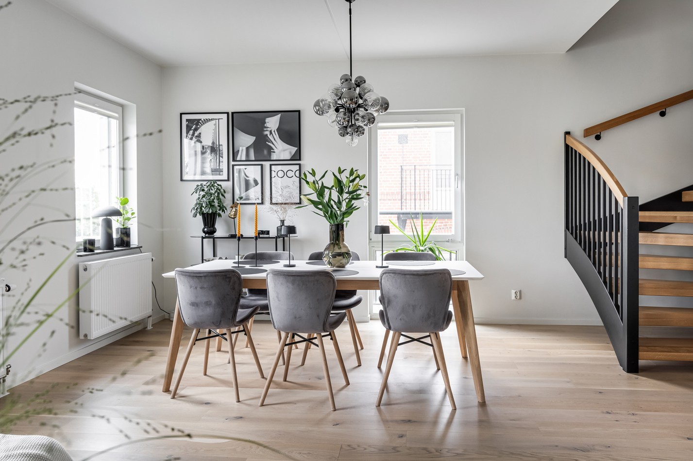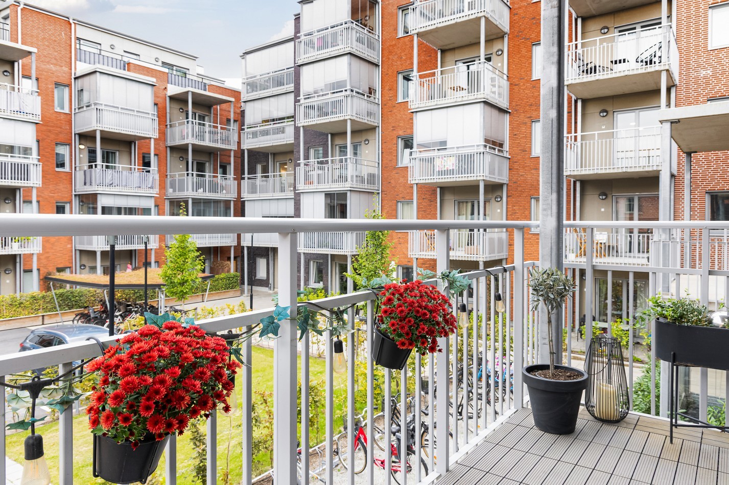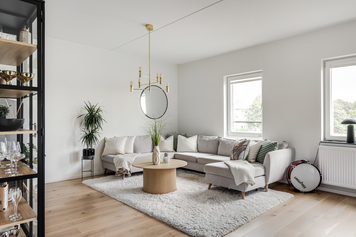 Det generösa allrummet bjuder på en härlig social yta där vardagsliv och umgänge får ta plats. De stora fönstren släpper in rikligt med ljus och skapar en luftig atmosfär som förstärks av de ljusa väggarna och det vackra trägolvet. Här finns gott om plats för en större soffgrupp och tv-möbel utan att rummet känns trångt. I anslutning ligger matplatsen, perfekt placerad vid fönsterpartierna och med plats för ett rejält matbord. Här kan både vardagsmiddagar och festliga bjudningar avnjutas i en trivsam miljö. Från allrummet nås även den trevliga uteplatsen – en solig förlängning av bostaden sommartid. Här finns gott om utrymme för både grill och loungemöbler, vilket gör det till en idealisk plats för lata helgfrukostar eller kvällar i gott sällskap.