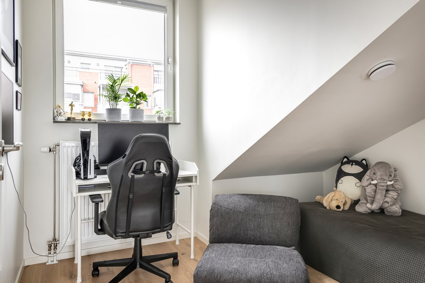 Ett charmigt rum med snedtak som ger karaktär och en mysig känsla. Fönstret släpper in fint dagsljus och gör rummet ljust trots den kompakta ytan. Här ryms säng, skrivbord eller annan möblering vilket gör rummet perfekt som barn- eller tonårsrum. Det lämpar sig även utmärkt som arbetsrum eller gästrum – ett flexibelt utrymme som enkelt kan anpassas efter familjens behov.