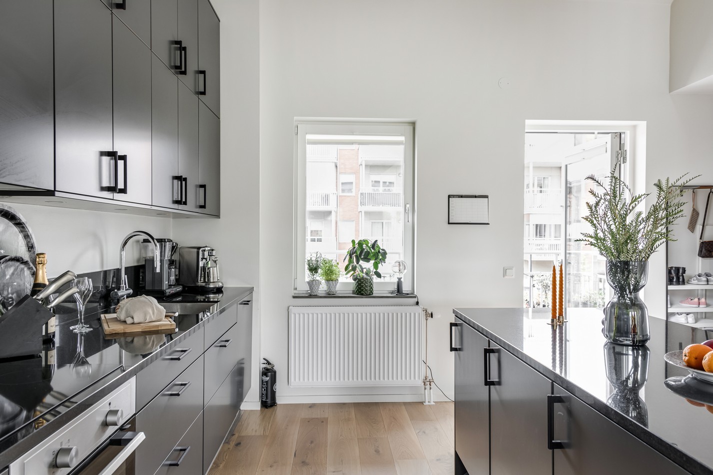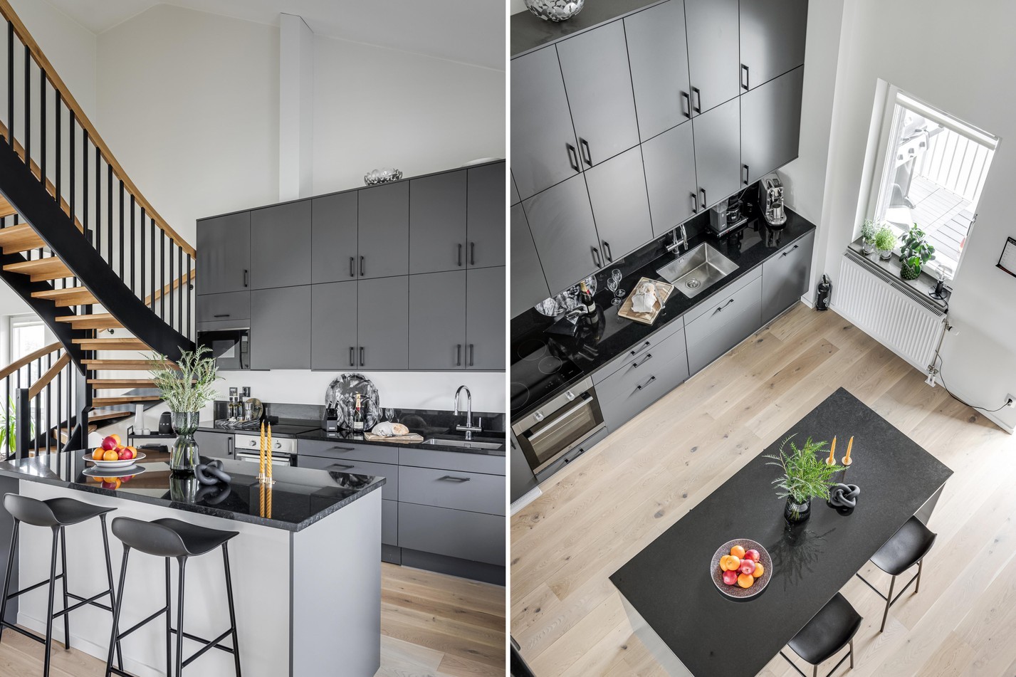 Ett kök som verkligen blir hemmets hjärta – här möts stil och funktion i perfekt harmoni. De mörka, matta skåpluckorna i kombination med bänkskivor i sten skapar ett sobert och modernt uttryck, samtidigt som det ljusa trägolvet ger en varm och inbjudande känsla. Den generösa köksön är både en arbetsyta och en naturlig samlingspunkt för familj och vänner. Här kan vardagens måltider tillagas i gott sällskap, och vid festligare tillfällen fungerar den lika bra som serveringsyta eller plats för mingel. Tack vare den öppna planlösningen mot både matplats och vardagsrum bjuder köket in till sociala stunder där ingen behöver stå ensam vid spisen. Förvaringen är genomtänkt och riklig med skåp som sträcker sig hela vägen upp till tak, och maskinparken i rostfritt gör matlagningen både smidig och effektiv. De stora fönstren och utgången mot uteplatsen låter ljuset flöda in och suddar ut gränsen mellan inne och ute under årets varmare månader. Ett kök som förenar design, funktionalitet och gemenskap – och som på riktigt förtjänar att kallas bostadens hjärta.