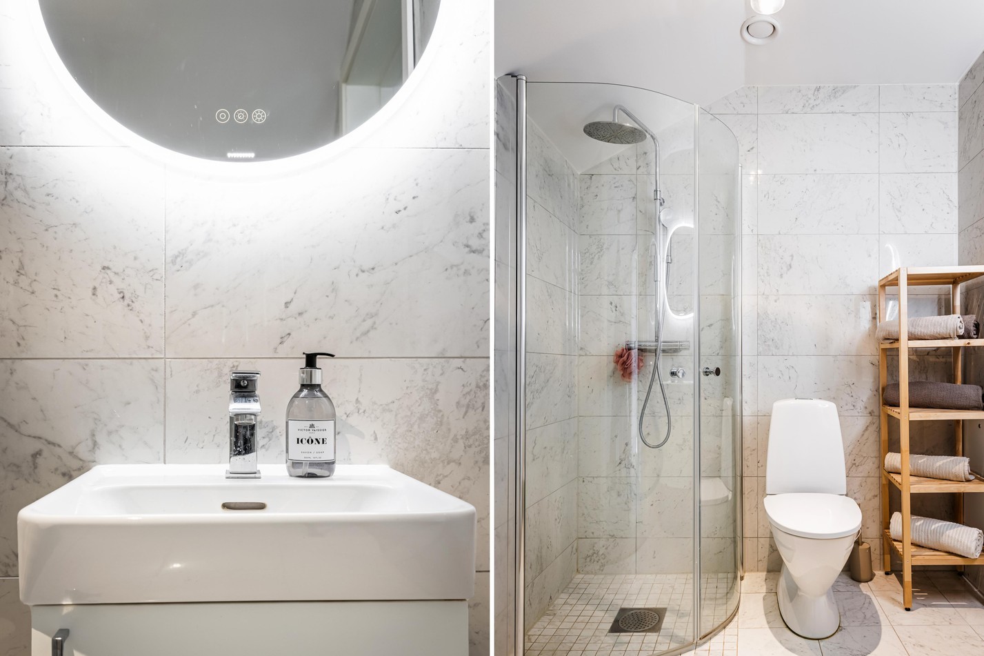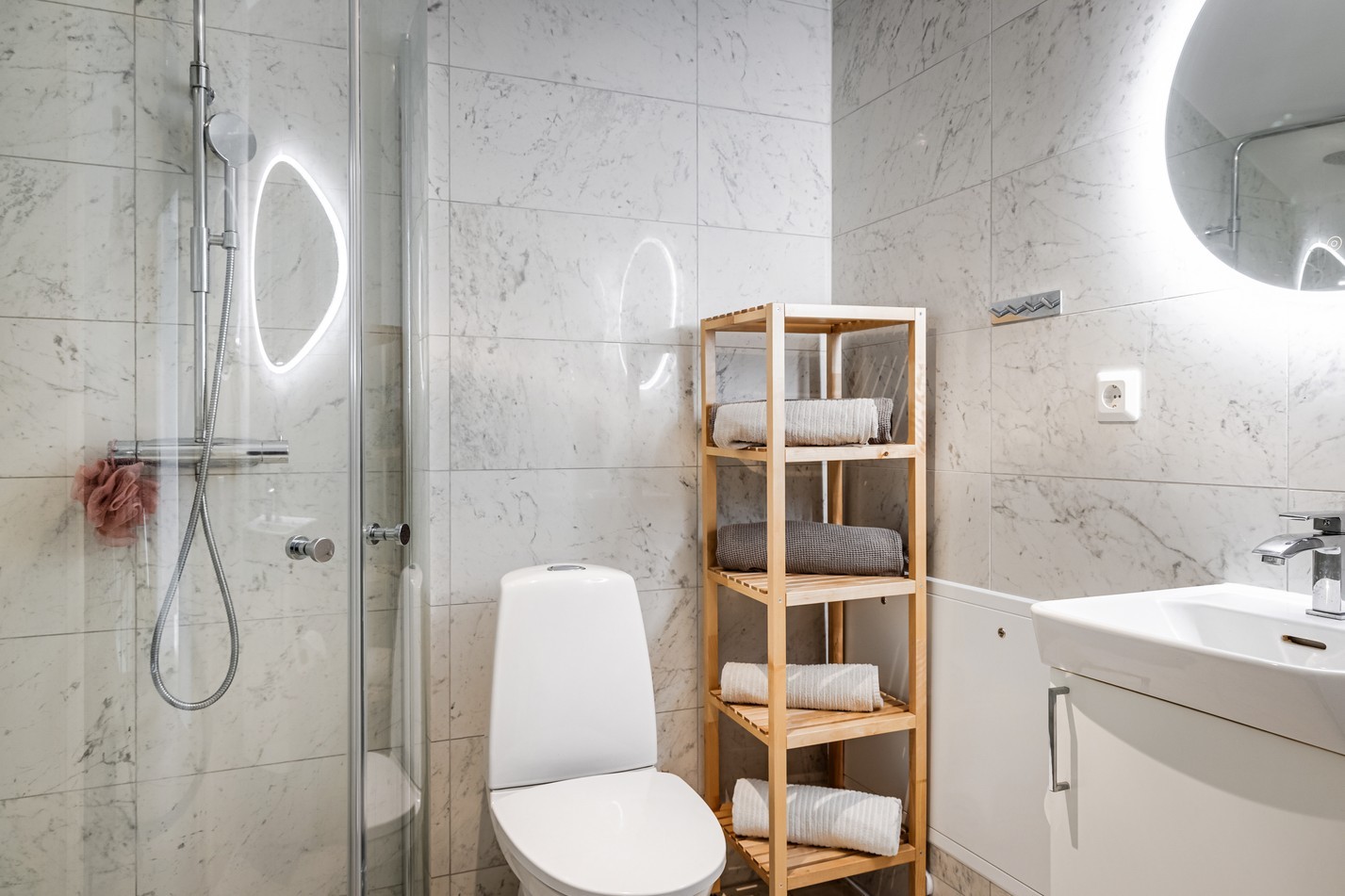 Smakfullt badrum i stilren design med helkaklade väggar i klassisk marmorimitation som ger en exklusiv känsla. Här finns dusch med glasväggar, handfat med kommod samt wc. Den smarta planlösningen gör rummet lättmöblerat och ger plats för både förvaring och dekoration. Den stora spegeln med belysning förstärker rymden och ljuset i rummet, vilket gör att badrummet upplevs både modernt och inbjudande. Ett badrum som kombinerar funktionalitet med elegans – perfekt för både vardagsrutiner och en avkopplande stund.