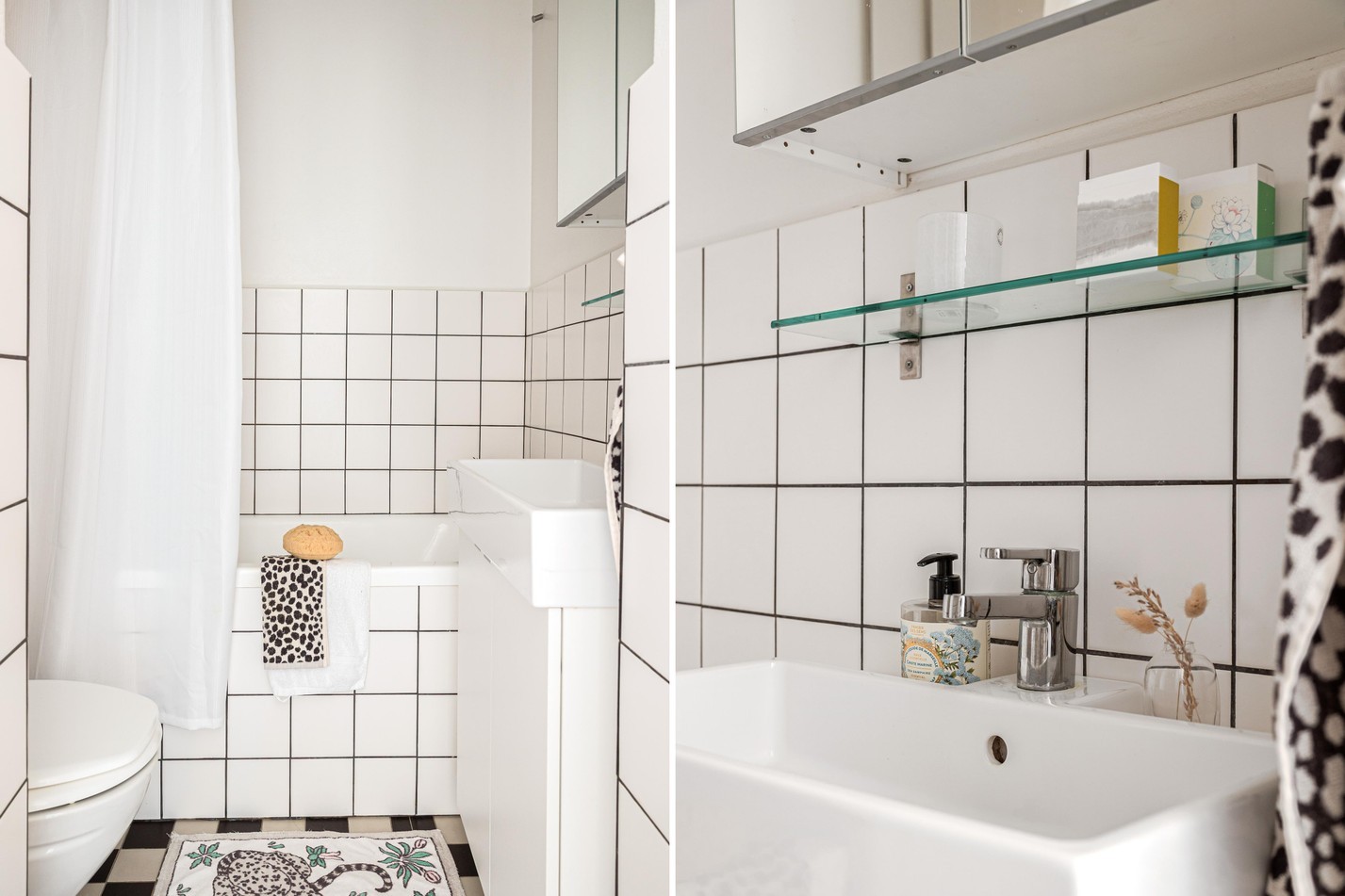 Detta badrum är utrustat med både badkar och duschmöjligheter – perfekt för dig som vill kunna varva ner med ett varmt bad efter en lång dag. De vitkaklade väggarna i tidlös rutdesign ger ett fräscht och lättskött intryck.