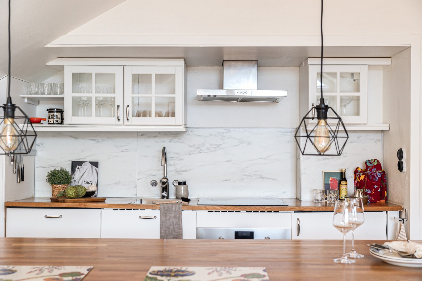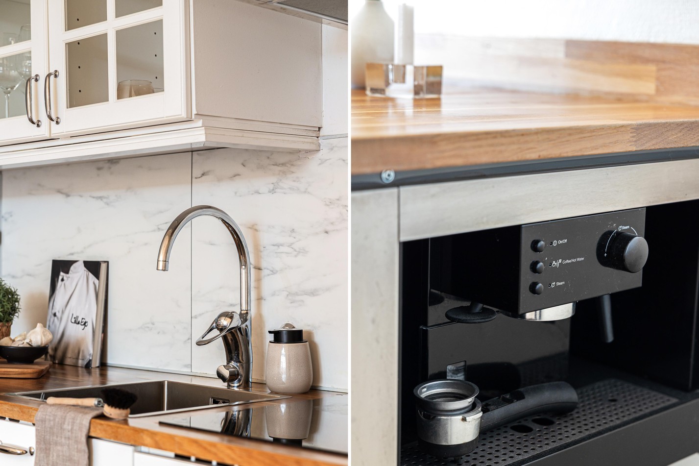 Välkommen in i ett kök där stil möter funktion! Här skapas en harmonisk helhet med vackra materialval som vit skåpinredning med spröjsade vitrindörrar, marmorinspirerad stänkskyddsvägg och bänkskiva i varm träton. Den öppna planlösningen och generösa köksön bjuder in till såväl vardagsmatlagning som sociala stunder med vänner och familj.