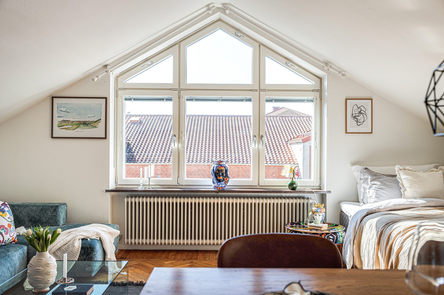 Välkommen till en ljus och charmig vindsvåning där varje kvadratmeter är smart utnyttjad. Här bor du högst upp i huset med generöst ljusinsläpp från det stora fönsterpartiet i takkupan som sträcker sig över hela rummets bredd.