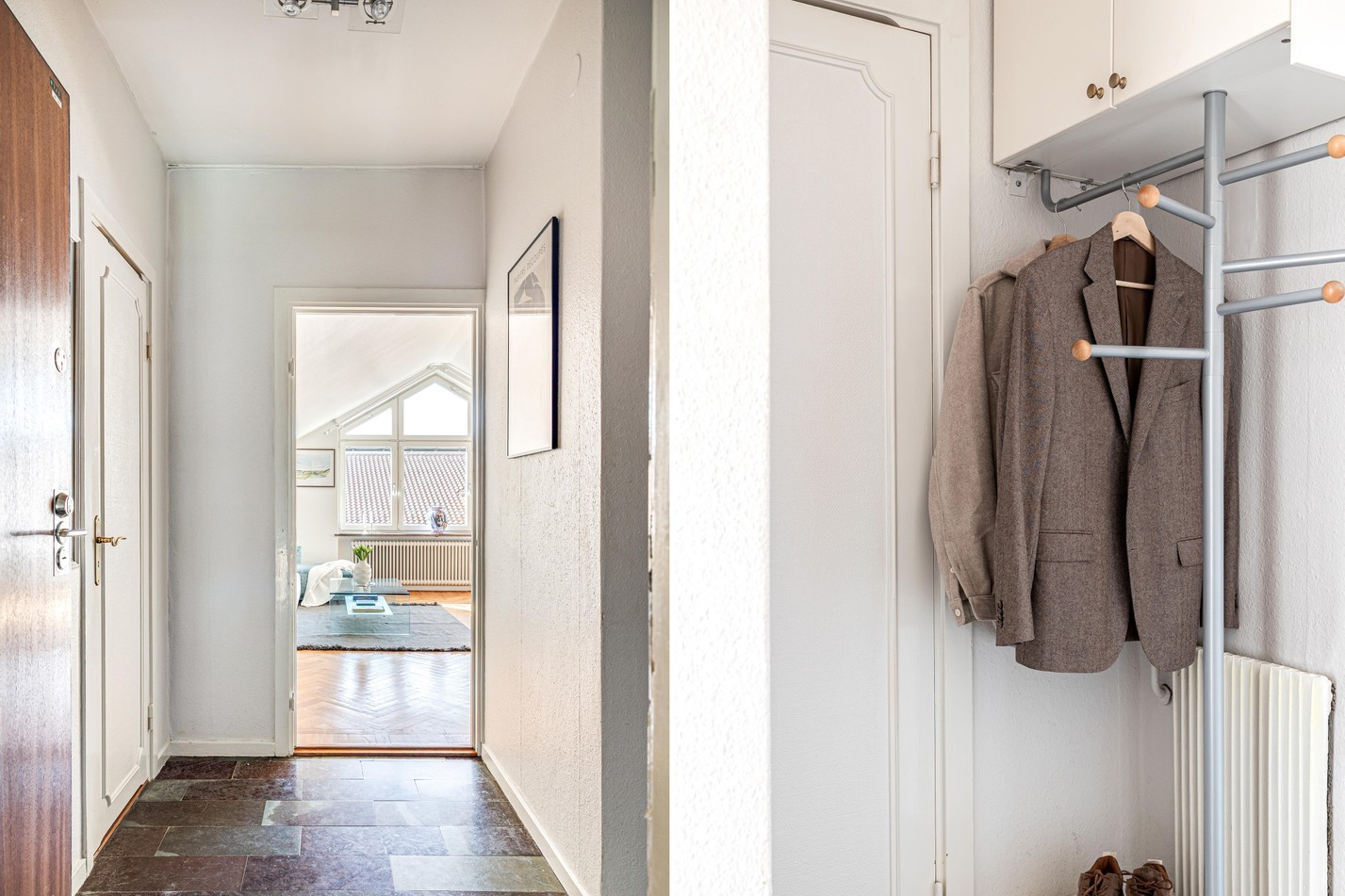Från hallen öppnar sig bostaden mot det ljusa vardagsrummet, med fin vy genom takkupan som släpper in rikligt med dagsljus. Golvet i natursten ger en tålig och praktisk yta som passar bra i en entré.
