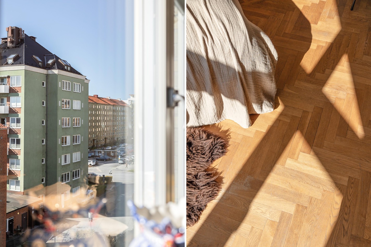 Det vackra fiskbensparkettgolvet i ek löper genom hela bostaden och bidrar till den hemtrevliga känslan. De sluttande taken ger rummet karaktär, samtidigt som takhöjden och ljusflödet skapar en rymlig och luftig atmosfär.