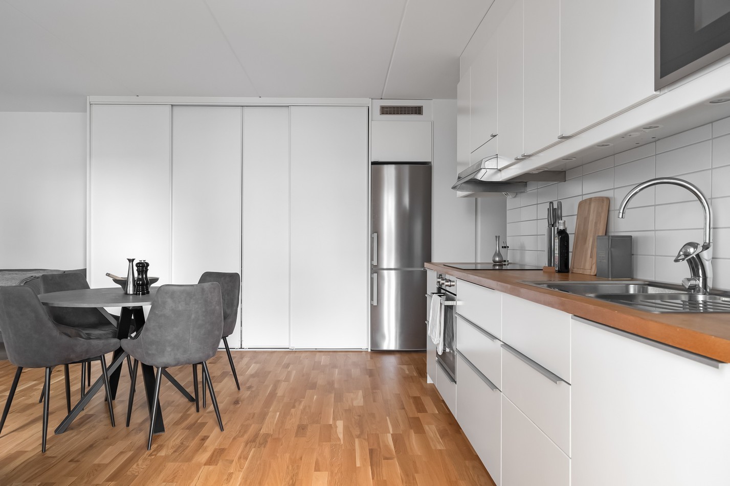 Lägenheten präglas av en enhetlig och stilren känsla, där det vackra ekparkettgolvet löper genom hela bostaden och de ljusa väggarna bidrar till en luftig och trivsam atmosfär.