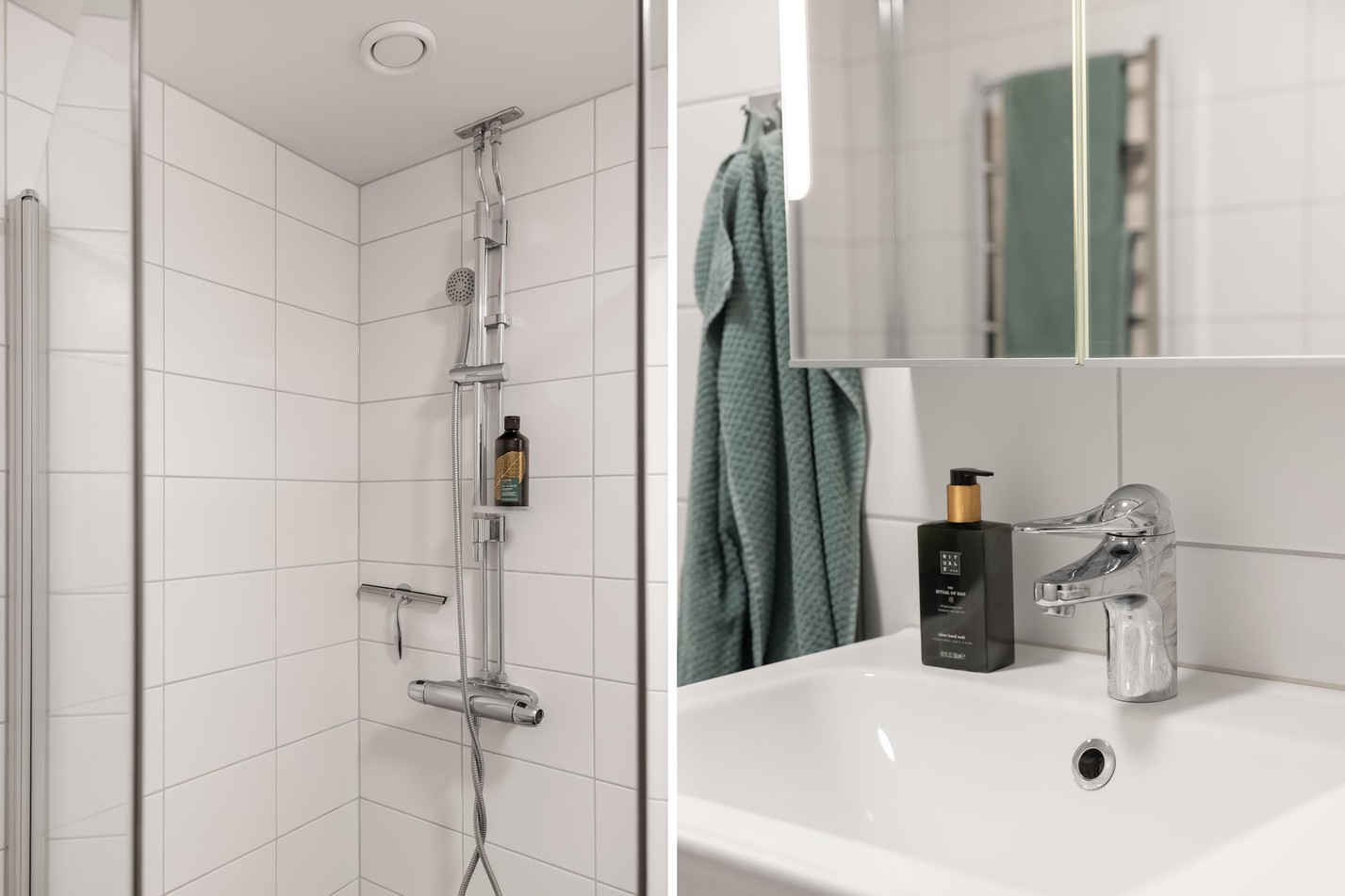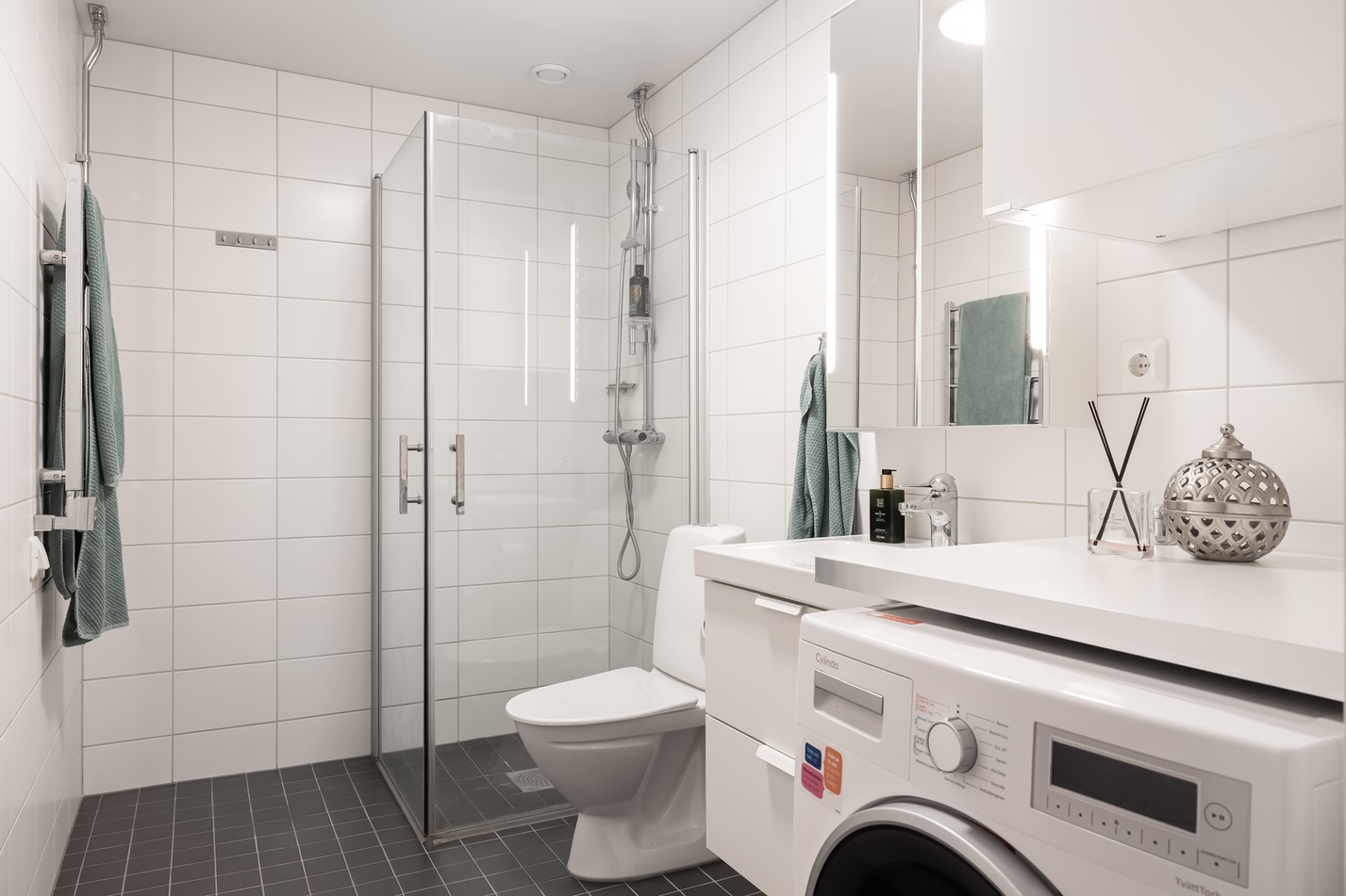 Badrummet är utrustat med en stilren kommod med handfat, spegelskåp för extra förvaring, en duschhörna med glasväggar samt en handdukstork som ger både komfort och lyx. Dessutom finns en kombimaskin, vilket gör tvättmöjligheterna smidiga och platsbesparande.