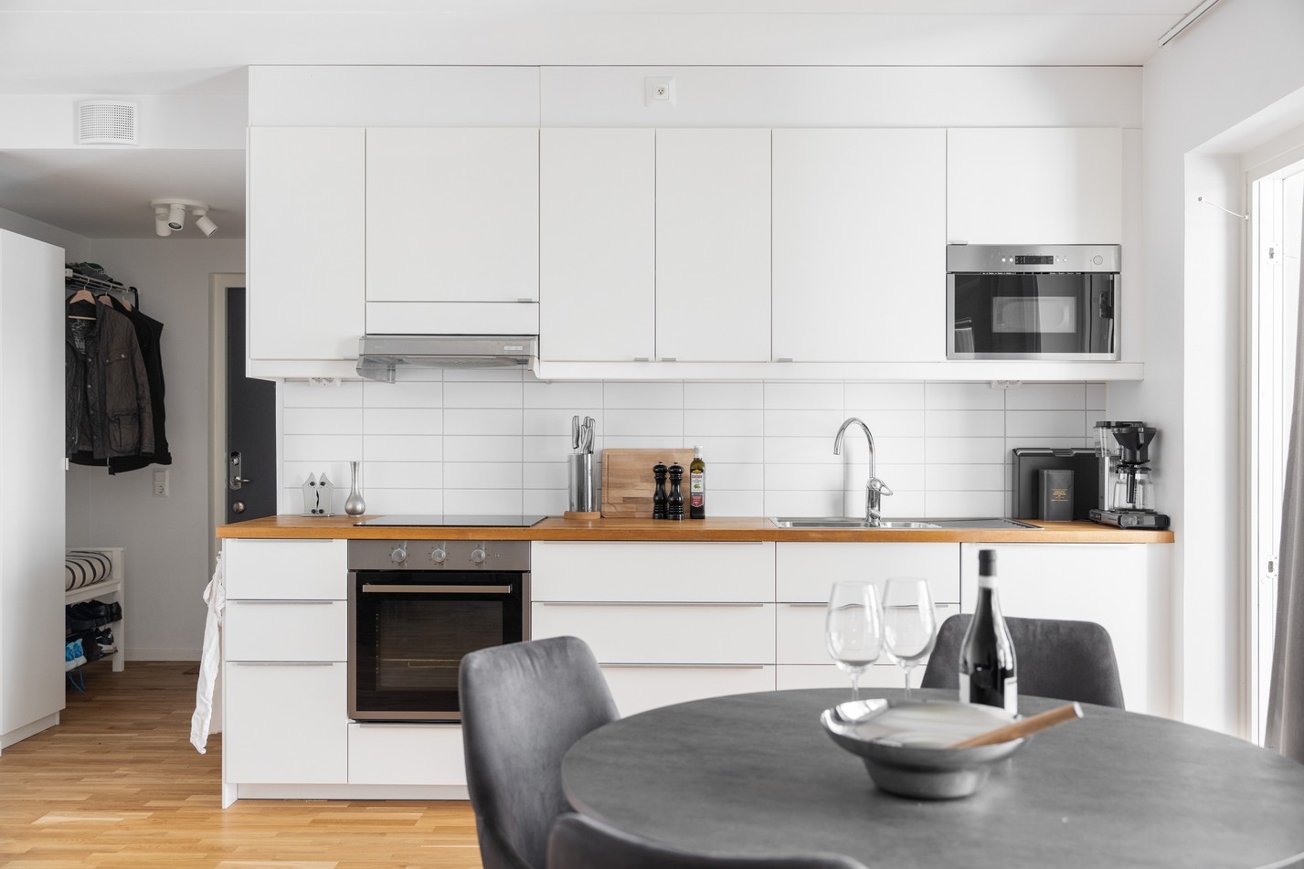 Det smakfulla IKEA-köket går i stilrent vitt och kompletteras av en ekbänkskiva som extra tillval, vilket skapar en varm och inbjudande känsla. De integrerade vitvarorna i borstat stål ger ett enhetligt och exklusivt uttryck.