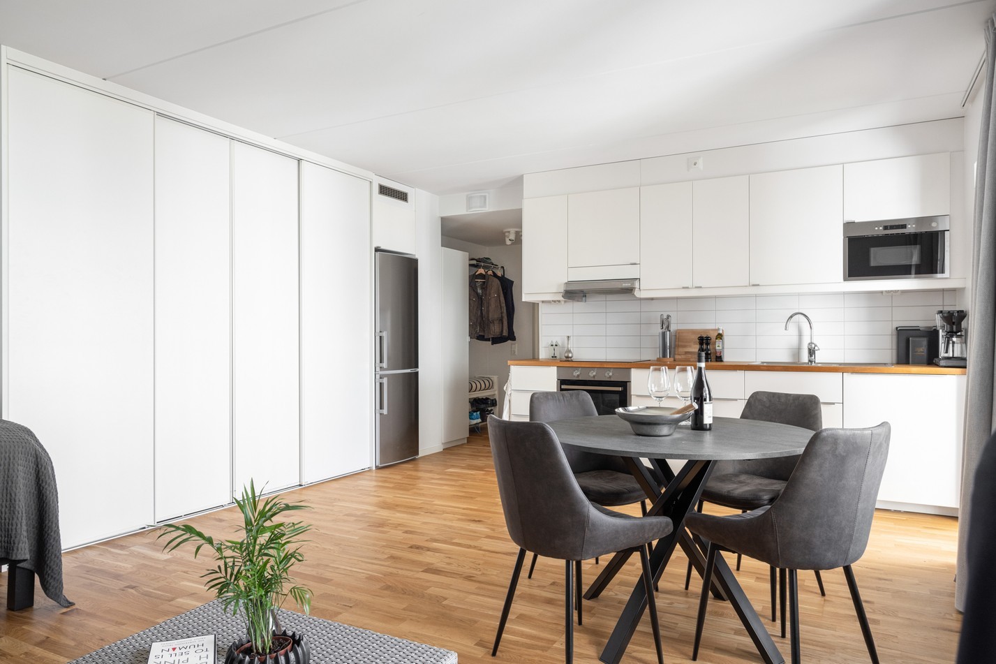 Vi rör oss vidare till bostadens härliga sällskapsavdelning, där kök och vardagsrum smälter samman i en modern och öppen planlösning. Här finns gott om utrymme för soffa, matplats, säng och arbetsyta – en smart och flexibel yta anpassad för både umgänge och avkoppling.