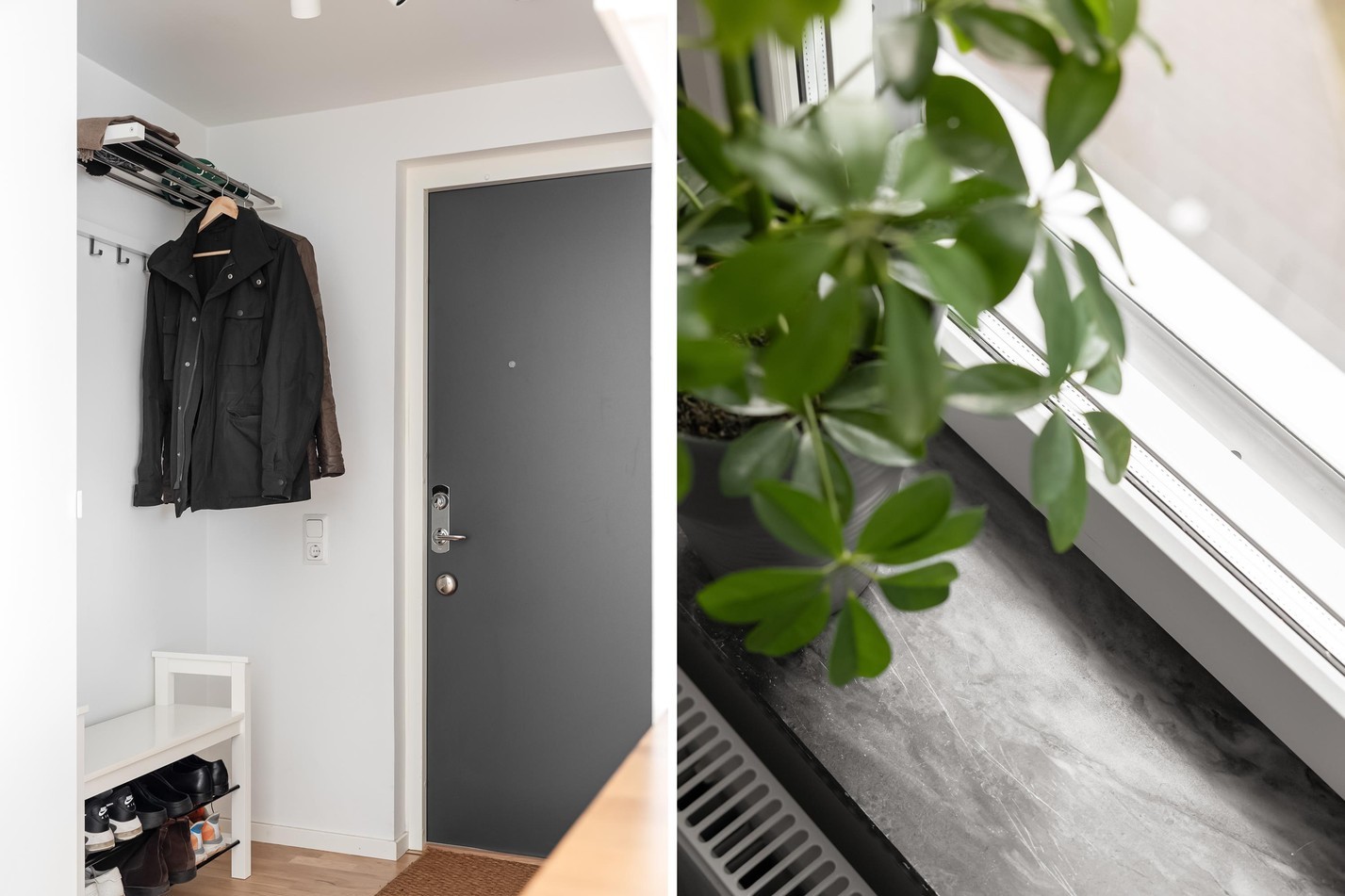 Vi tar hissen upp och kliver in i en bostad som imponerar med sin smarta planlösning och genomtänkta detaljer. Direkt i hallen möts vi av goda avhängningsmöjligheter och praktisk förvaring i en rymlig skjutdörrsgarderob som rymmer det mesta.