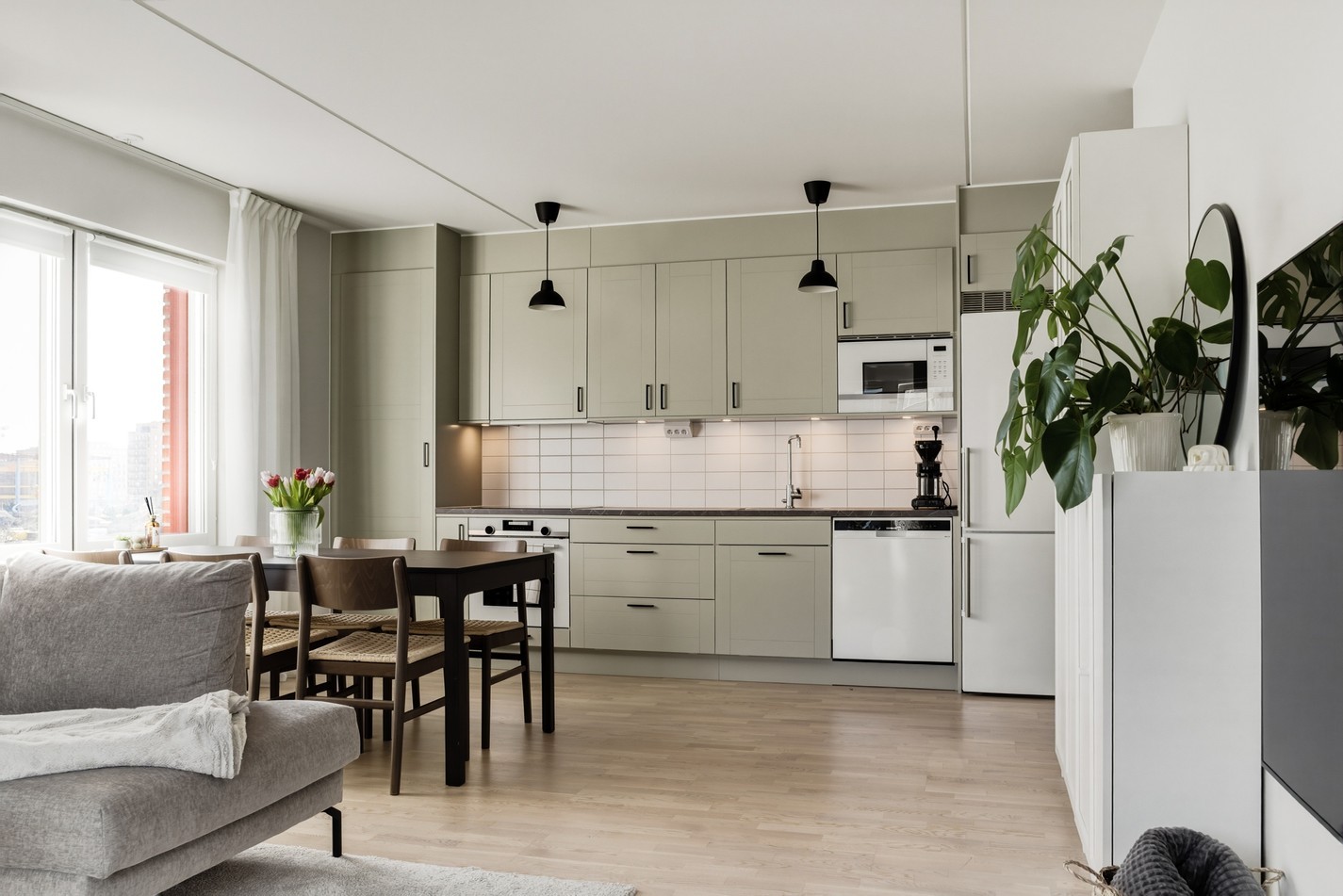 Ett luftigt vardagsrum med generöst ljusinsläpp från stora fönsterpartier och direkt utgång till en trivsam balkong. Rummet erbjuder gott om plats för både soffgrupp och matplats i en öppen och social planlösning. Ljusa ytskikt, vackert trägolv och harmoniska färgval skapar en modern och inbjudande atmosfär – perfekt för både avkoppling och umgänge.