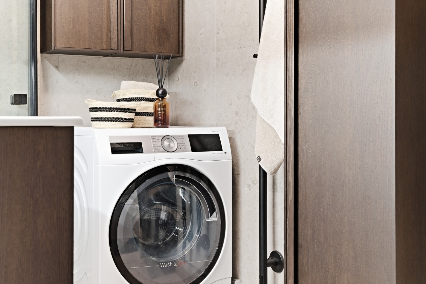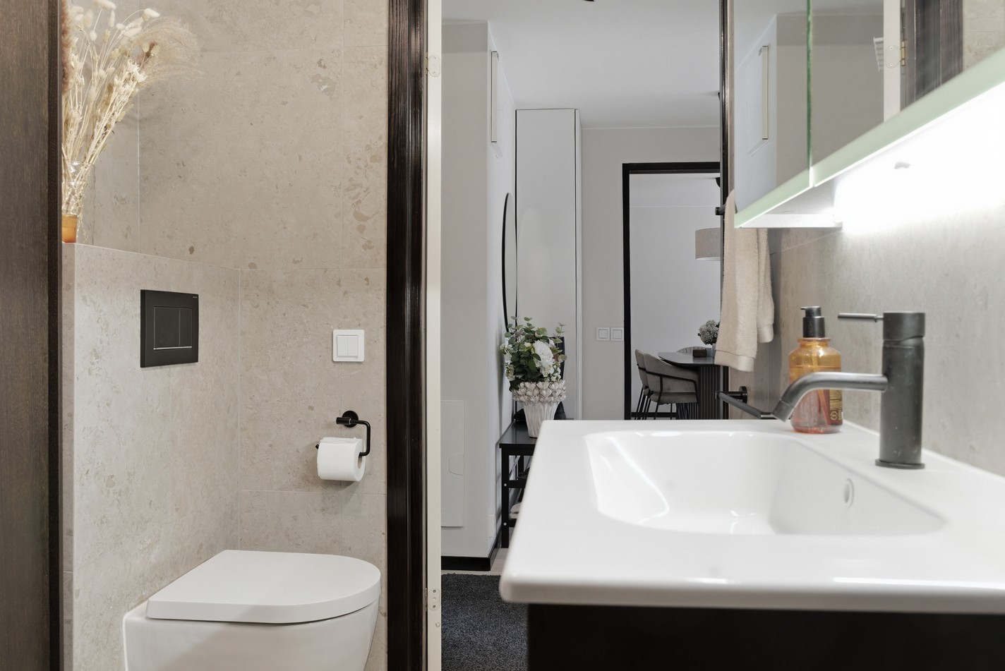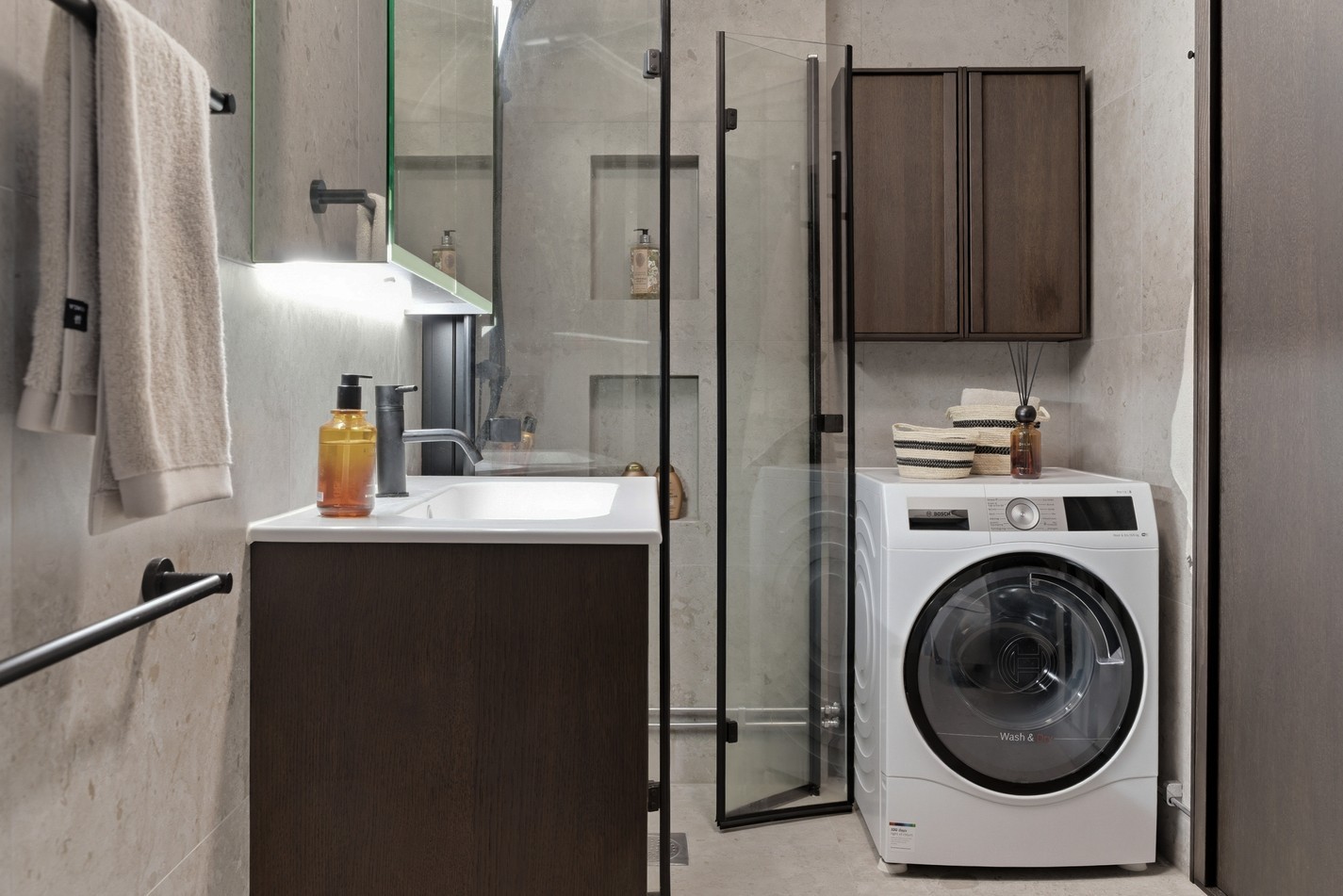 Nyrenoverat badrum med stilrena materialval och generösa förvaringsmöjligheter. Väggar och golv är helkaklade i grått klinker och kakel som ger ett modernt och enhetligt intryck. Inredningen består av en mörkbrun kommod och matchande möbler som skapar en elegant och harmonisk känsla i rummet.