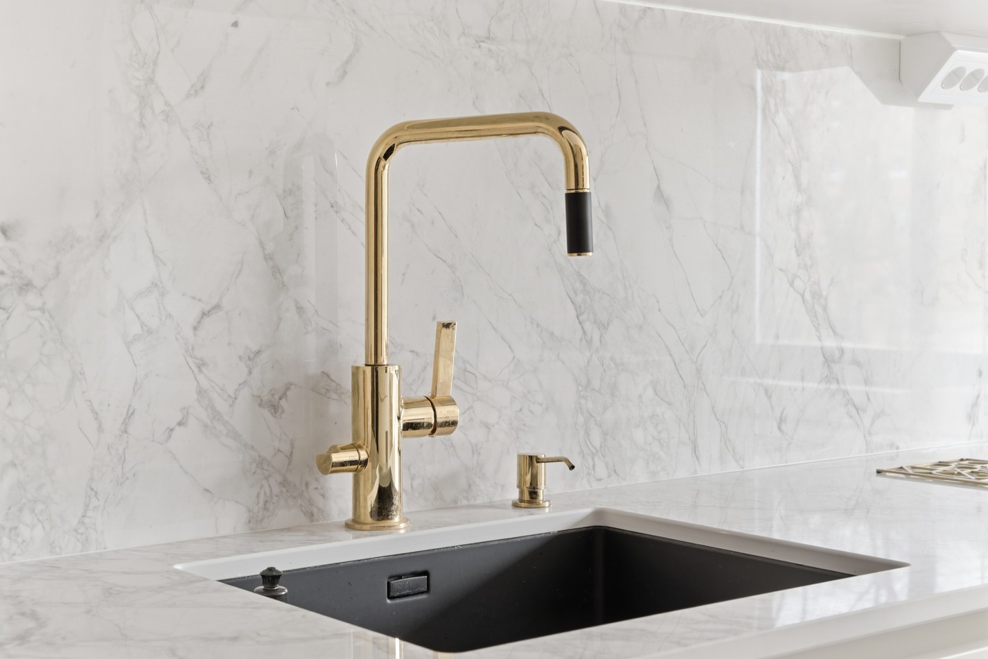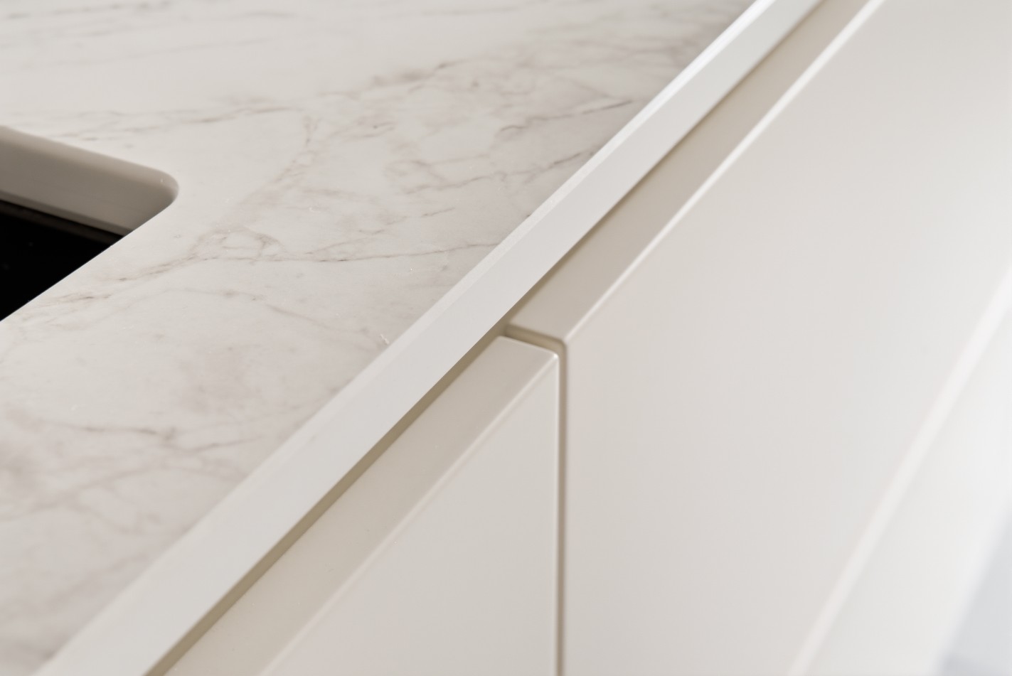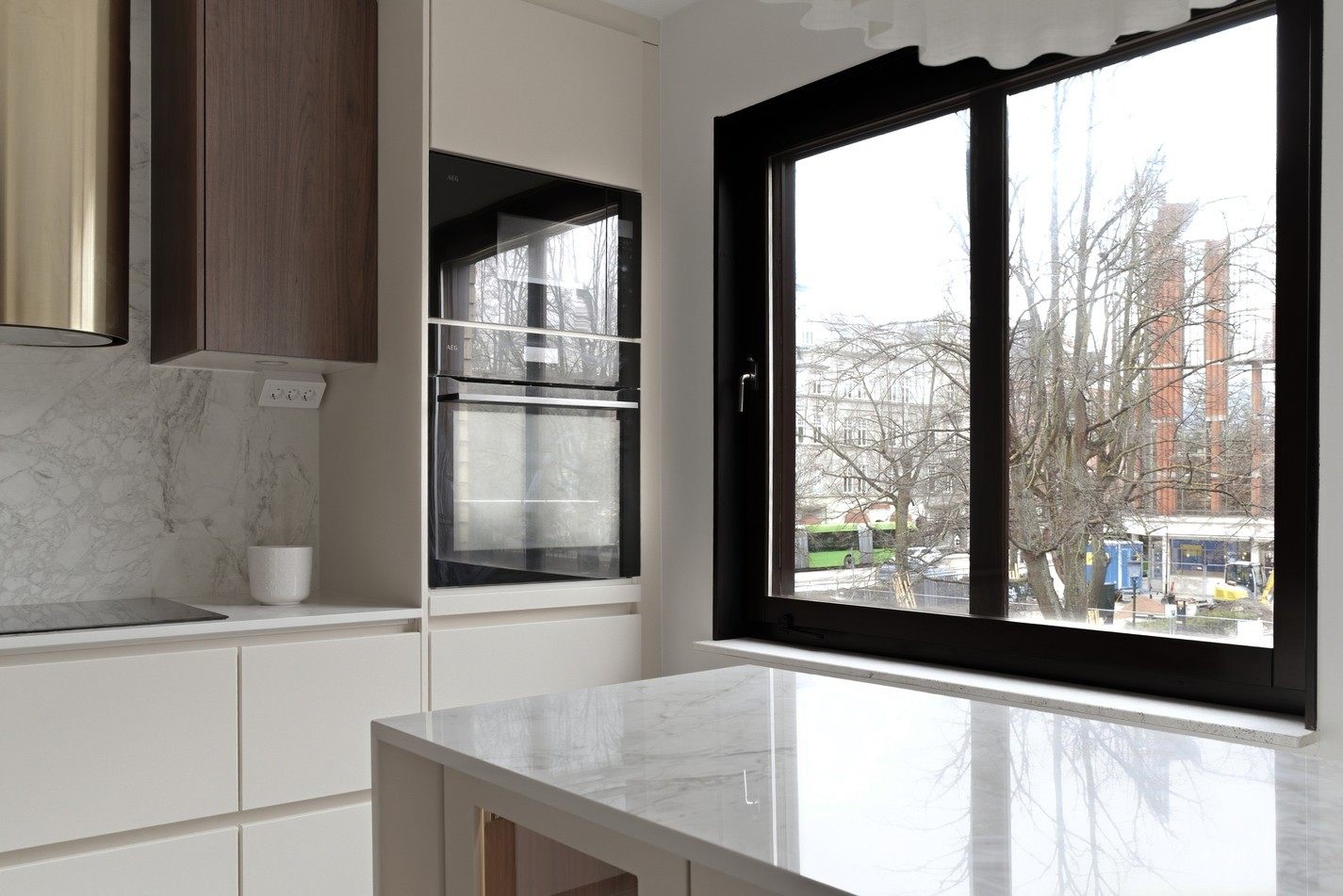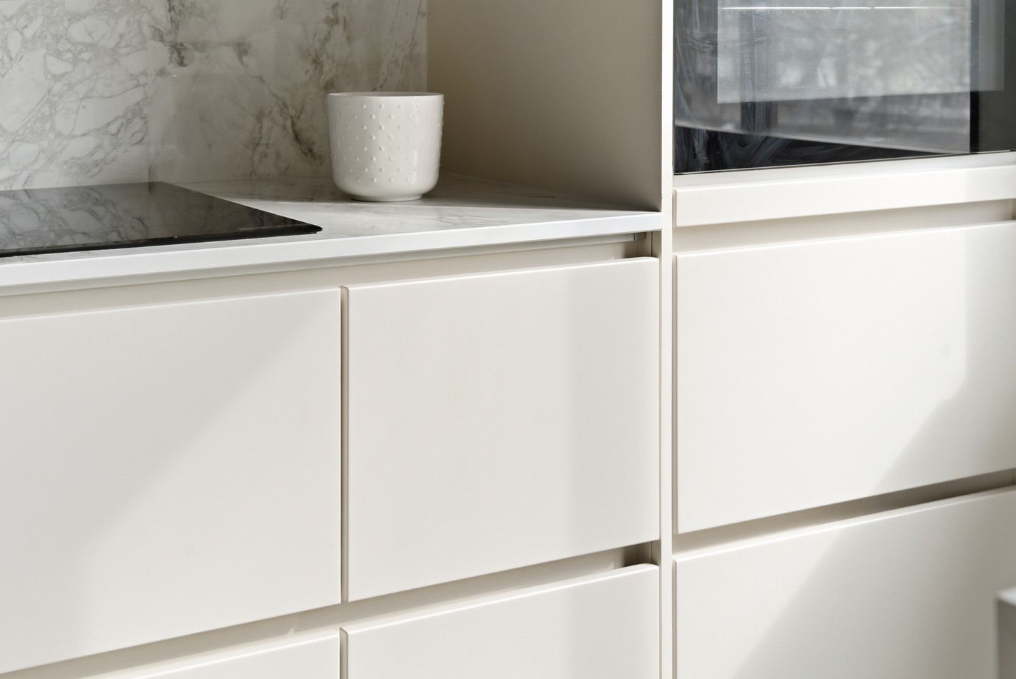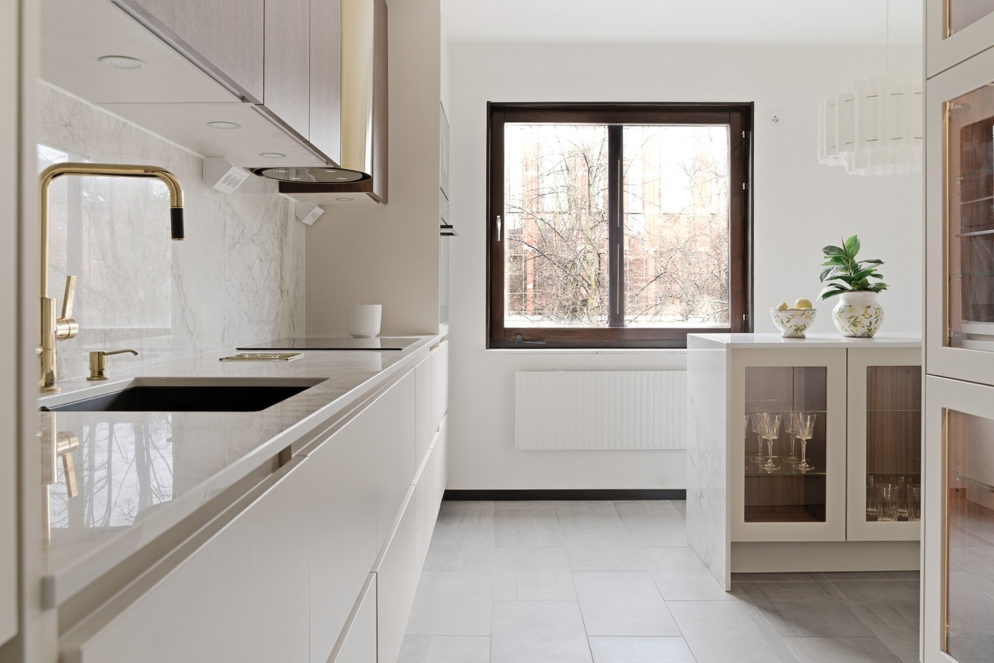 Stilrent och nyrenoverat kök med köksö som rymmer fyra till sex personer. Inredningen går i tidlöst vitt med släta luckor, vitt kakel och en exklusiv bänkskiva i Dekton Bergen. Köket är utrustat med spis och ugn, fläkt, diskmaskin samt fullstor kyl och frys. Här finns även ett stilrent vitrinskåp som bidrar till både förvaring och karaktär.