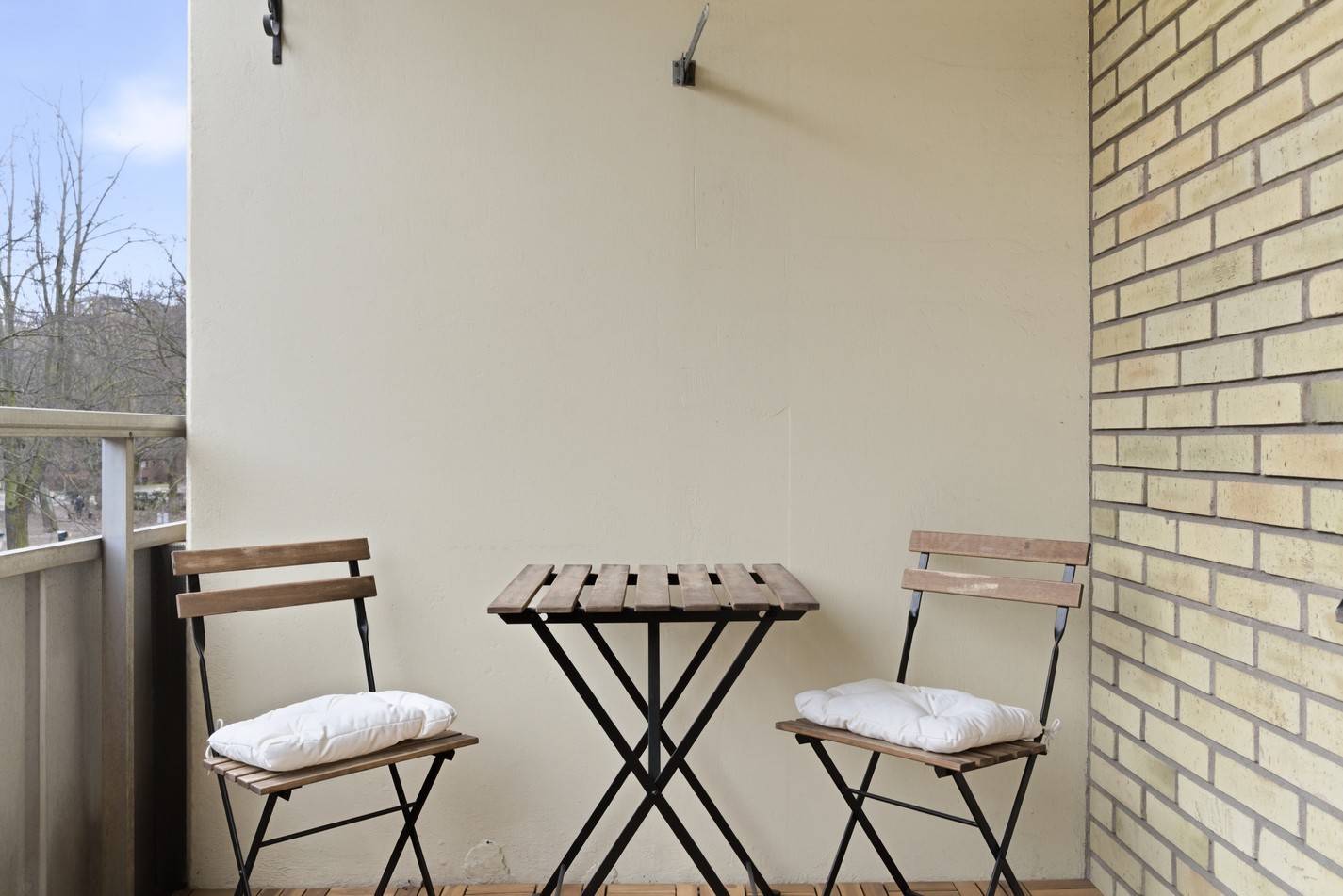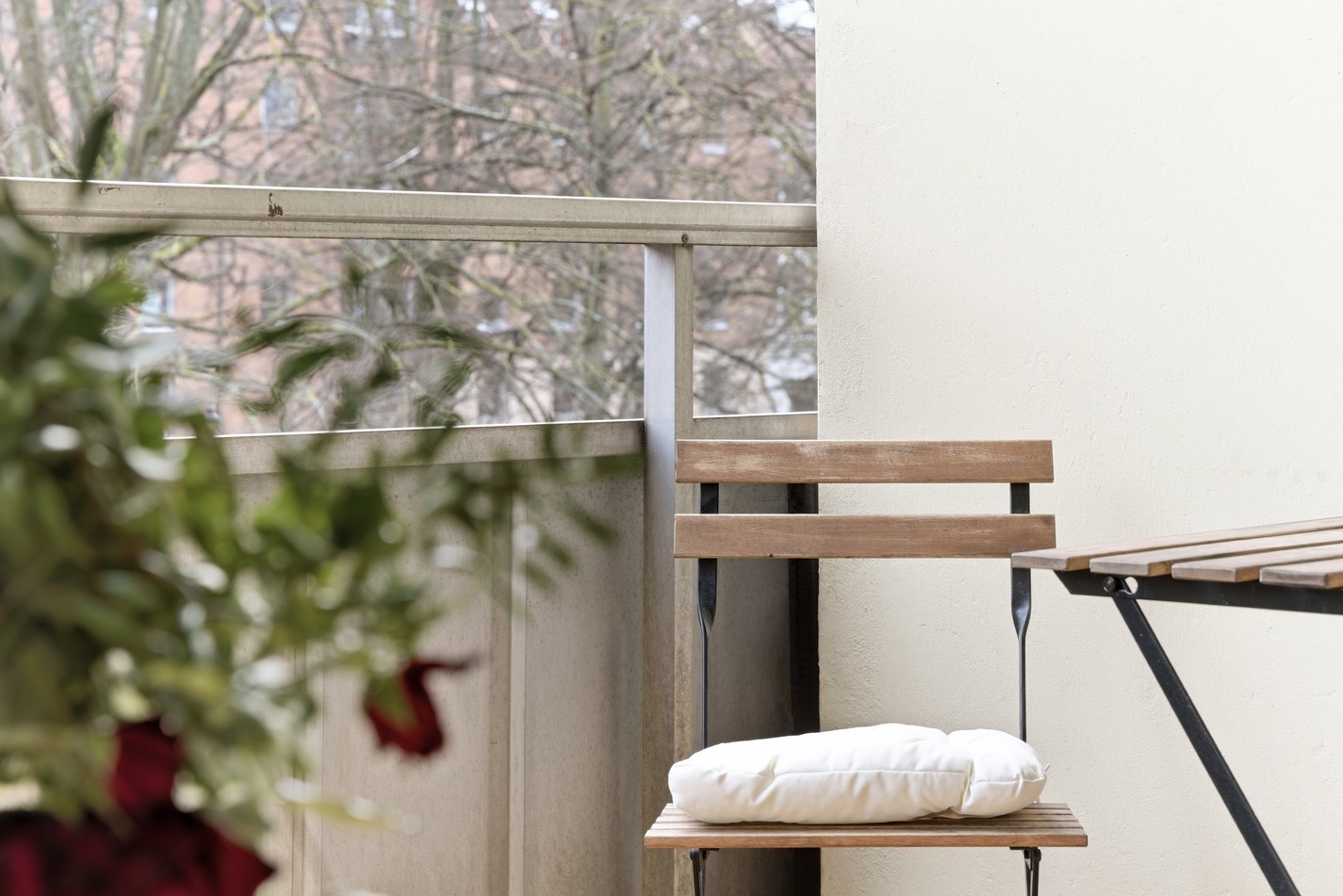 Generös balkong med behaglig morgon- och förmiddagssol. Här finns gott om plats för bord, stolar och växter – en perfekt plats att njuta av lugnet och den omgivande grönskan.