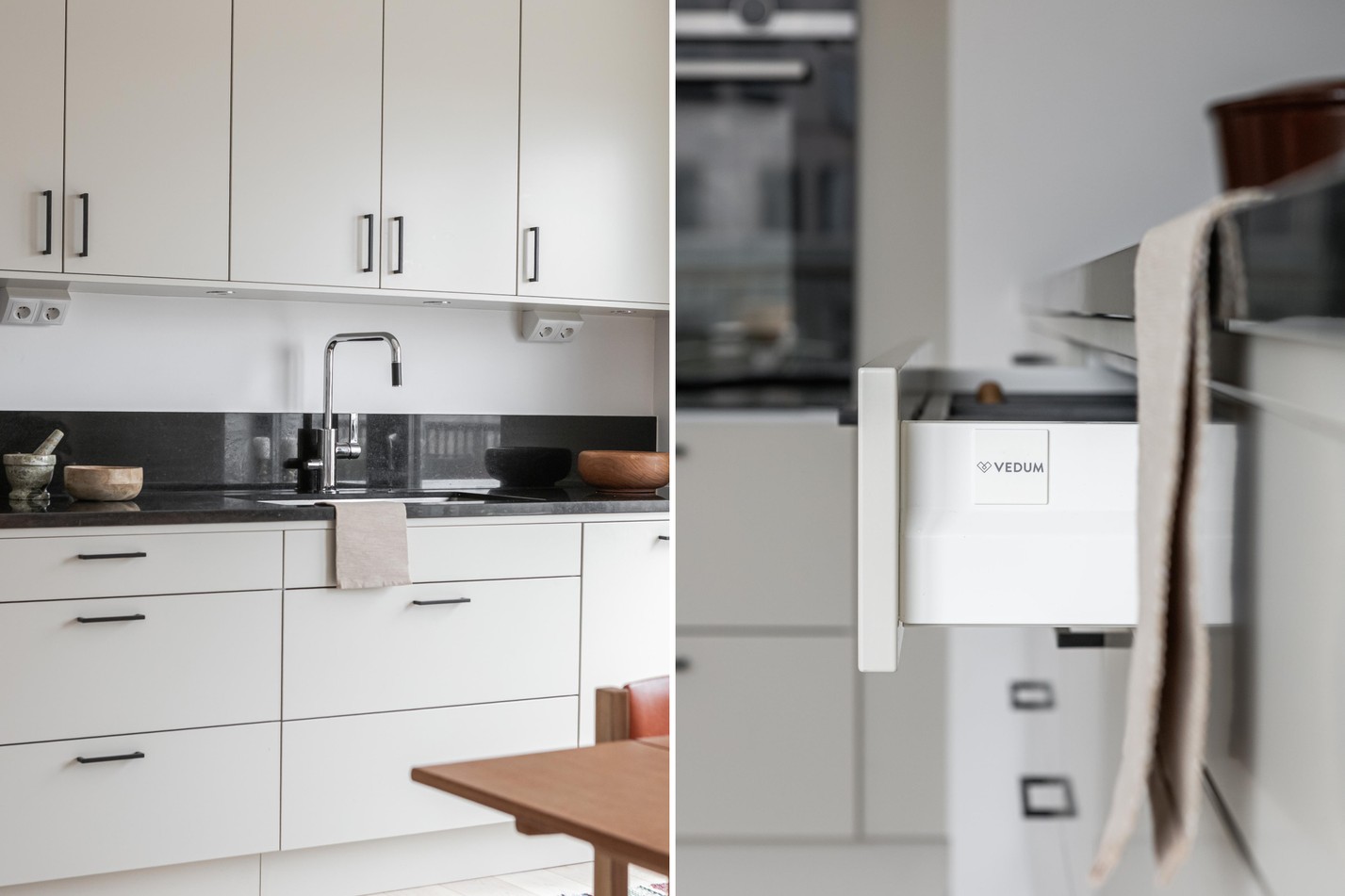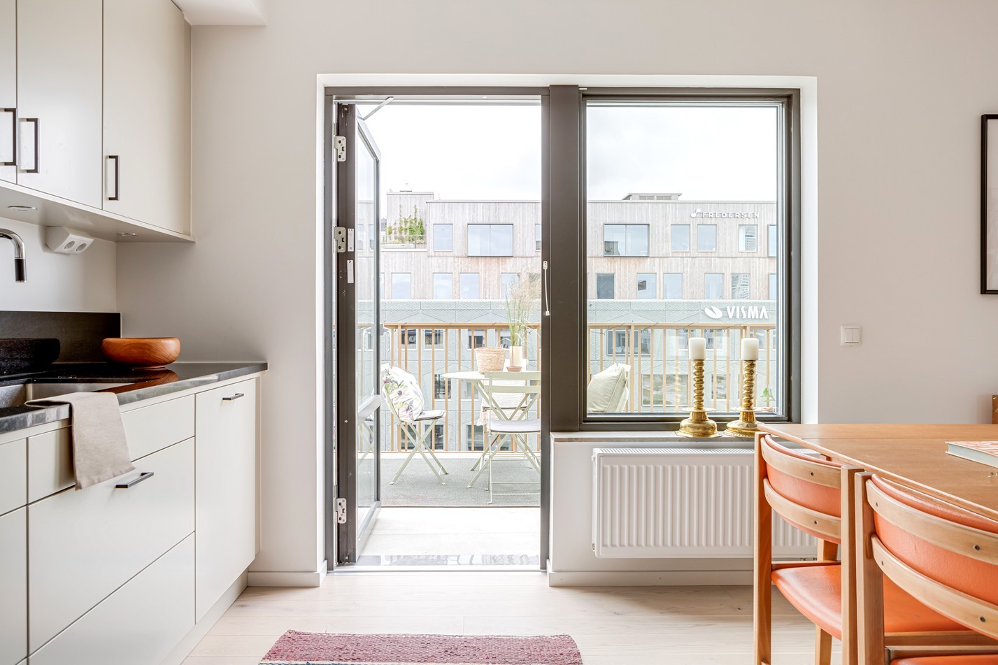 Köket är en fröjd för både öga och användare. Här möts form och funktion i en stilren design från Vedum, där släta, ljusgrå luckor med svarta handtag harmoniserar med en exklusiv bänkskiva och matchande stänkskydd i mörk sten. Den generösa förvaringen löper längs hela väggen, samtidigt som arbetsytan är optimerad för matlagning i både vardag och fest. Den öppna planlösningen bjuder in till det sociala – här lagar du mat samtidigt som du har kontakt med både gäster och vardagsrum. Matplatsen får sin naturliga plats intill fönstret och dörren som leder ut till den stora, södervända takterrassen – samma härliga uteplats som nås från vardagsrummet. Köket är komplett med fullstor kyl och frys i rostfritt, inbyggd ugn och mikro, integrerad diskmaskin samt induktionshäll. Ljuset från terrassdörren flödar in och förstärker känslan av rymd och närheten till utelivet.