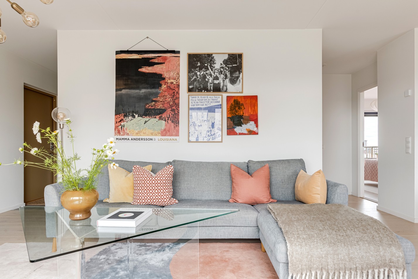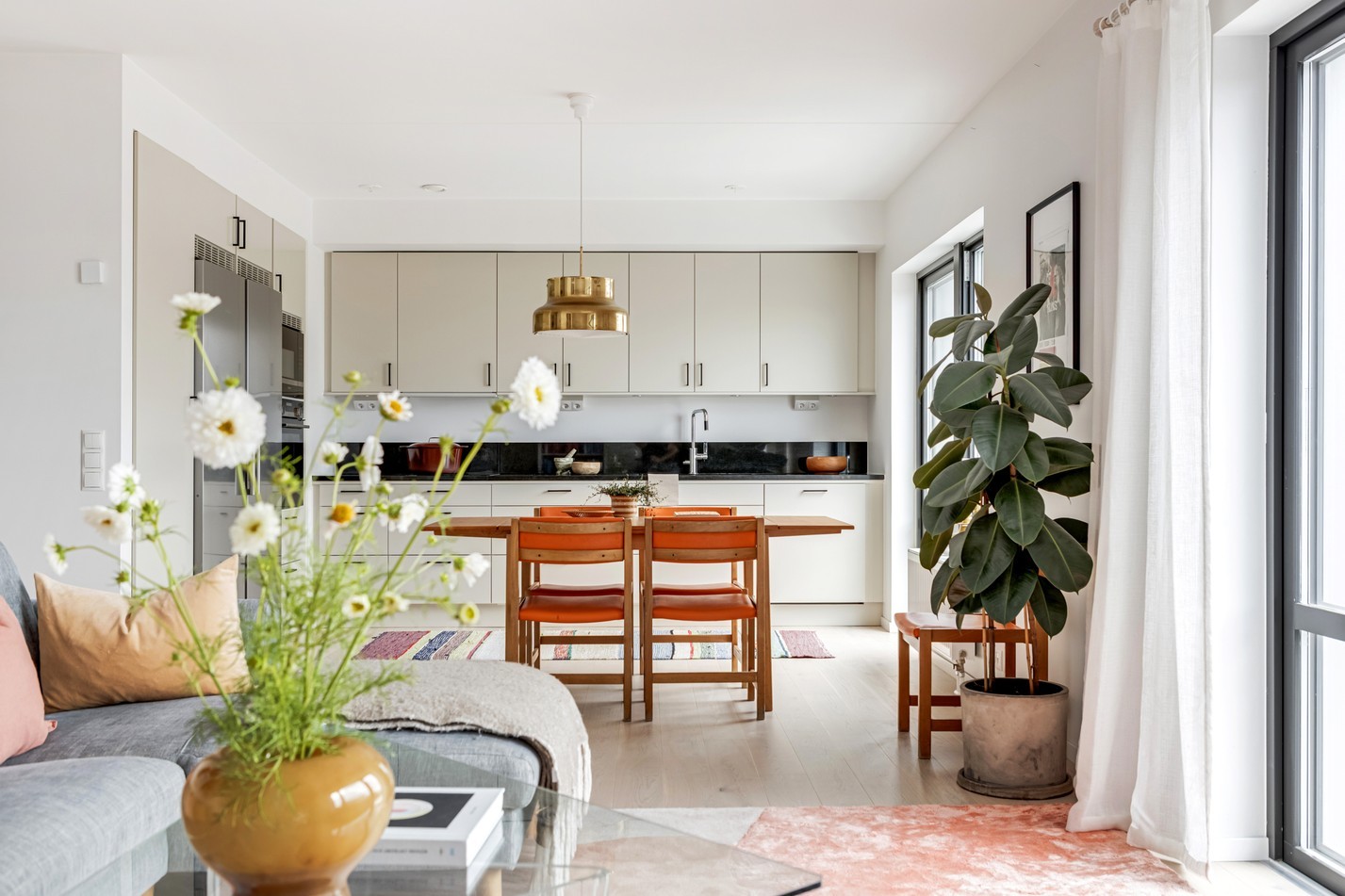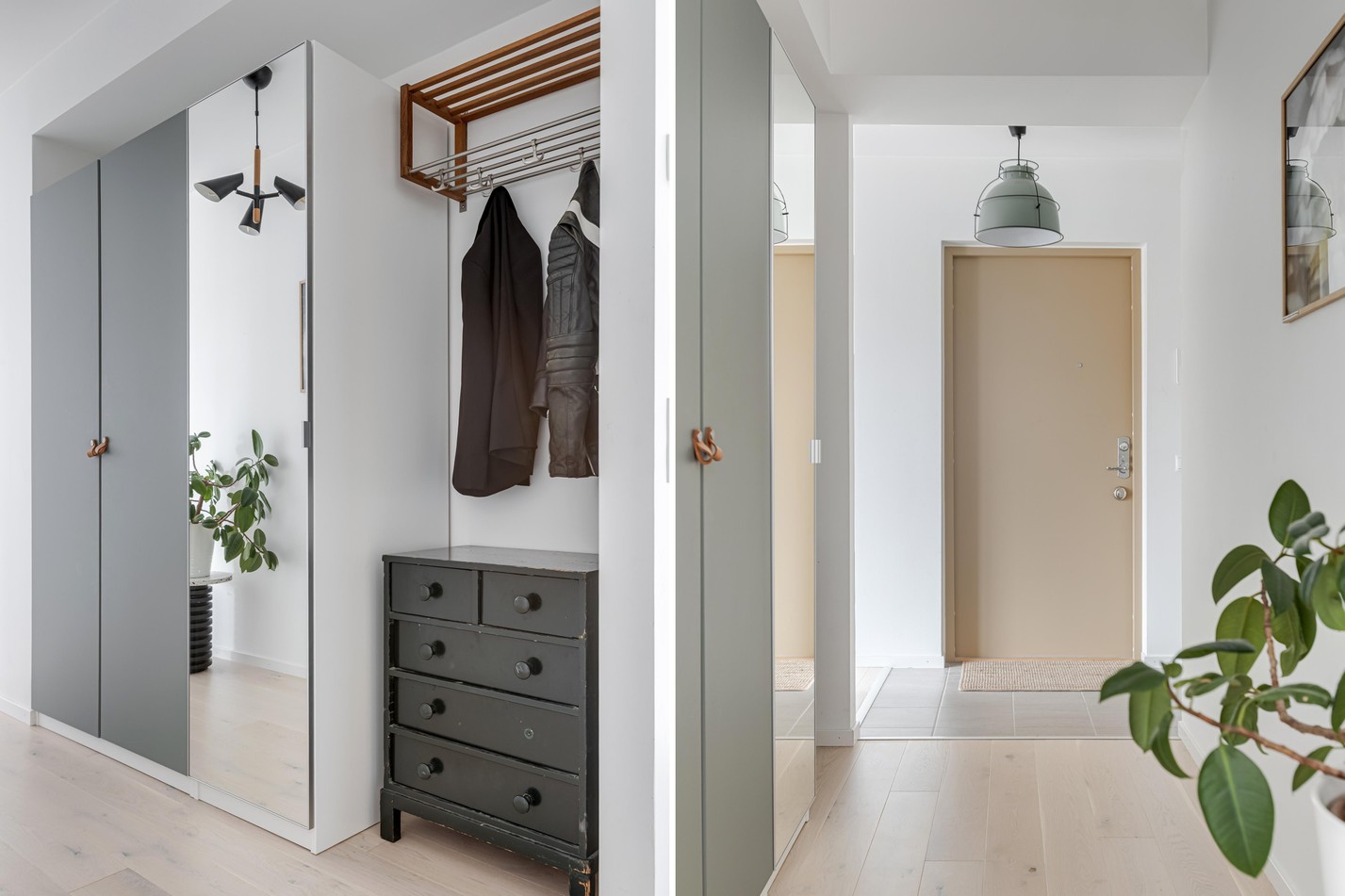 Redan i hallen möts du av bostadens stilrena känsla. Här kombineras funktion med form på bästa sätt – med gott om förvaring bakom platsbyggda garderober i sobert grått, spegelpanel för rymd och ljus, samt en praktisk sittbänk med hatthylla ovanför. Den matta klinkerytan vid entrén övergår smidigt i ljust trägolv, vilket skapar en naturlig avgränsning mot resten av bostaden. Detaljer som takpendel, skandinavisk färgsättning och den inbjudande sikten rakt genom bostaden sätter tonen för resten av hemmet: avskalat, genomtänkt och väldigt lätt att trivas i.