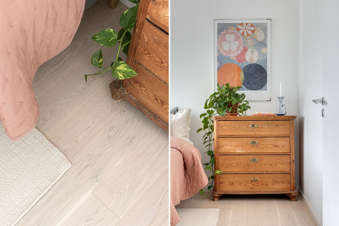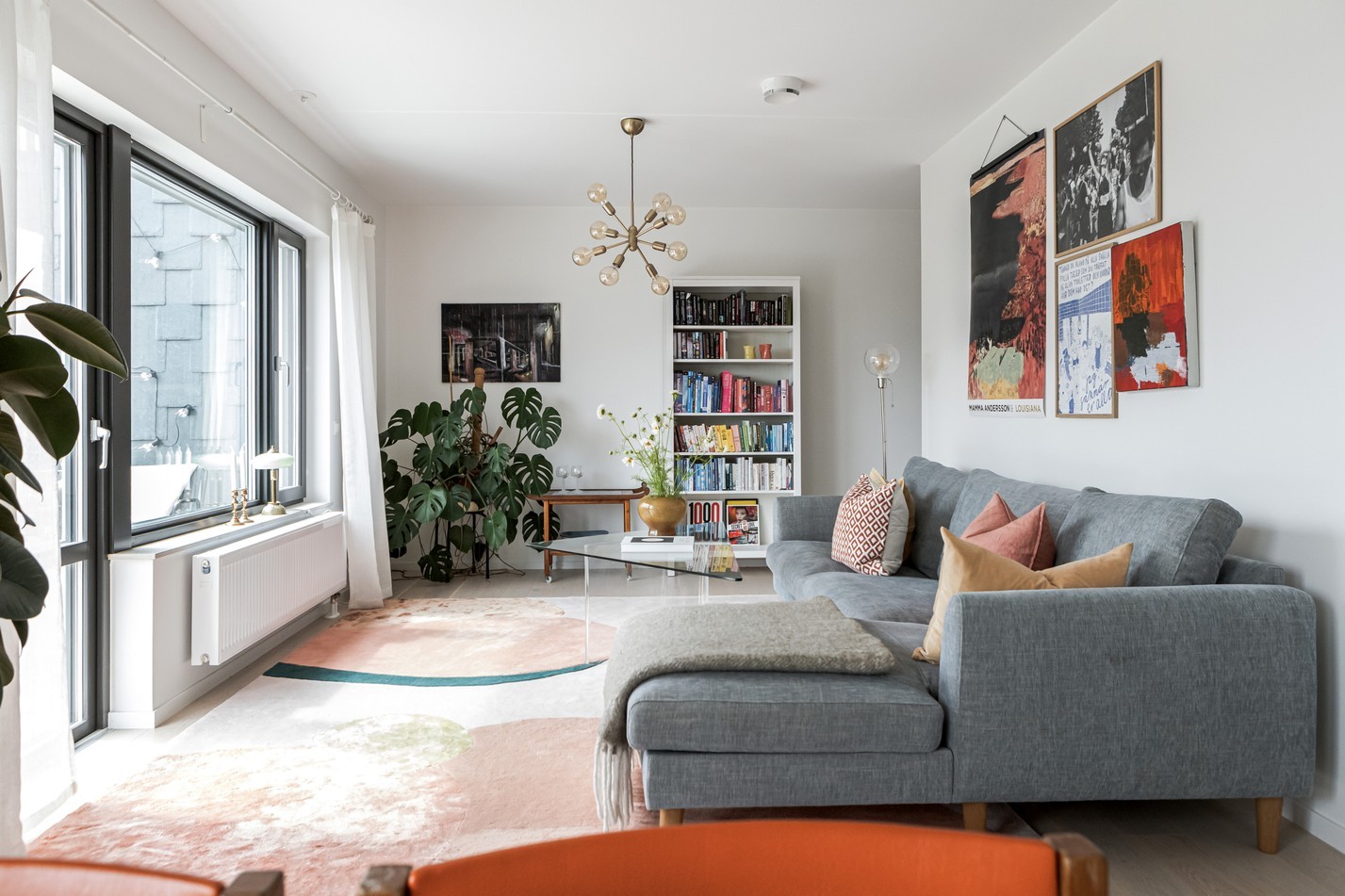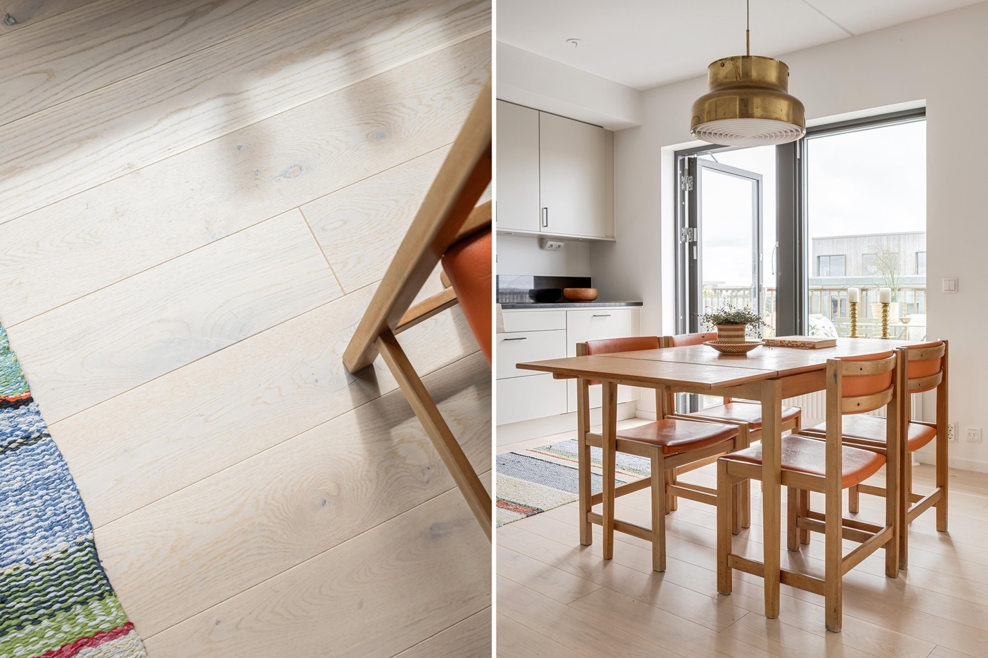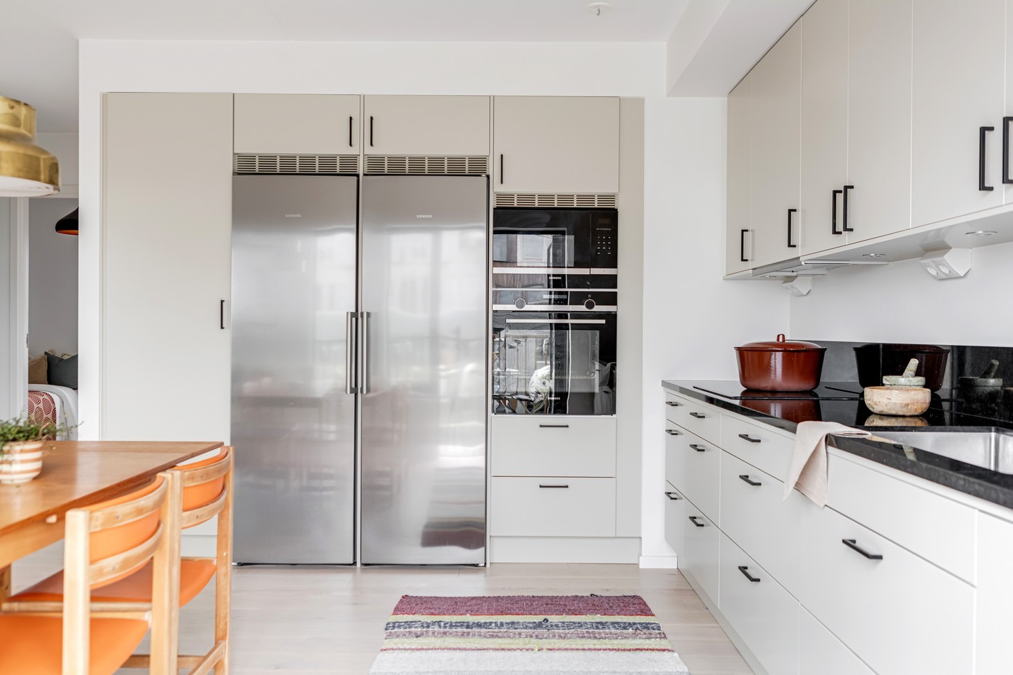 Redan i hallen möts du av bostadens stilrena känsla. Här kombineras funktion med form på bästa sätt – med gott om förvaring bakom platsbyggda garderober i sobert grått, spegelpanel för rymd och ljus, samt en praktisk sittbänk med hatthylla ovanför. Den matta klinkerytan vid entrén övergår smidigt i ljust trägolv, vilket skapar en naturlig avgränsning mot resten av bostaden. Detaljer som takpendel, skandinavisk färgsättning och den inbjudande sikten rakt genom bostaden sätter tonen för resten av hemmet: avskalat, genomtänkt och väldigt lätt att trivas i.