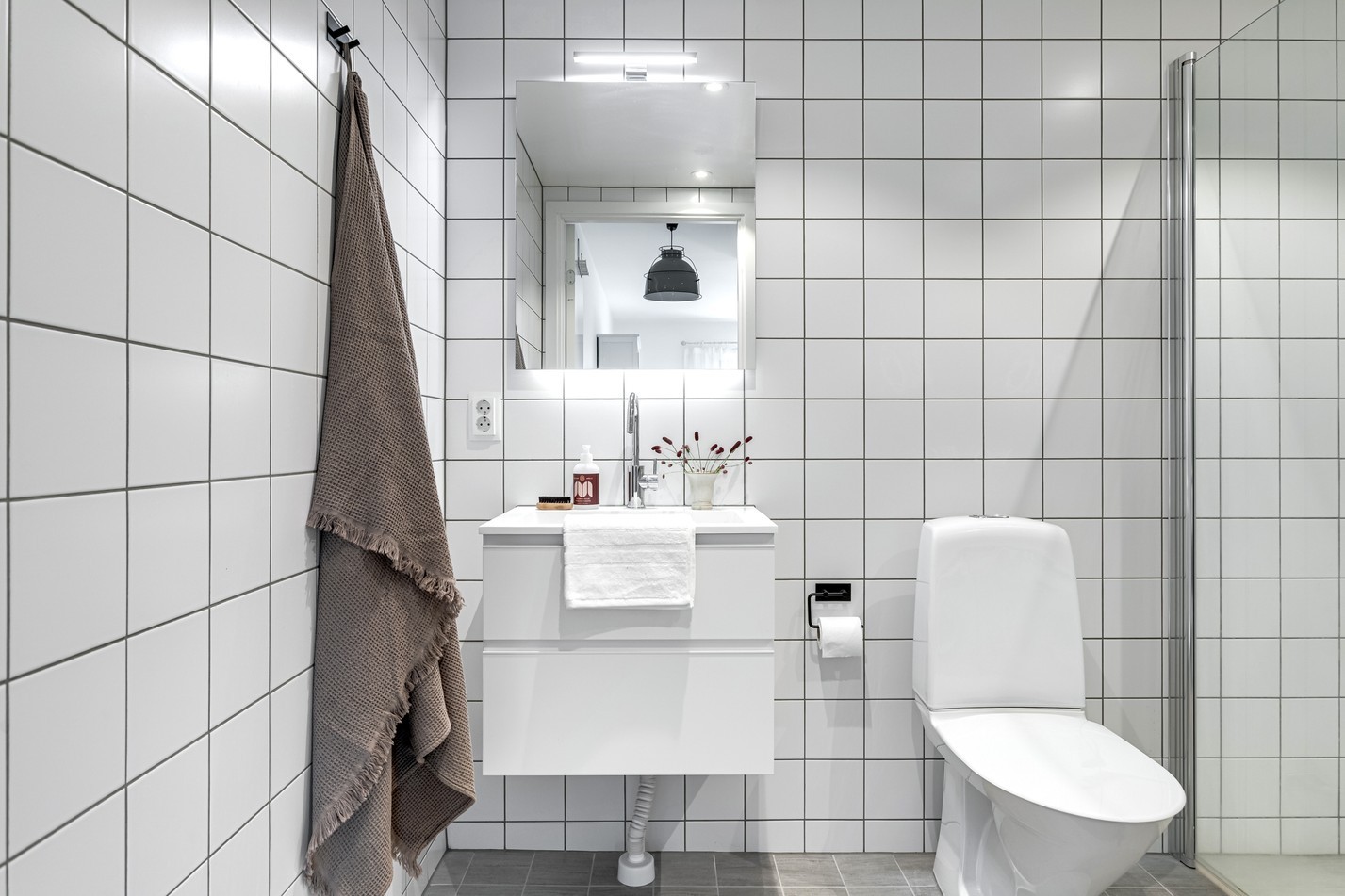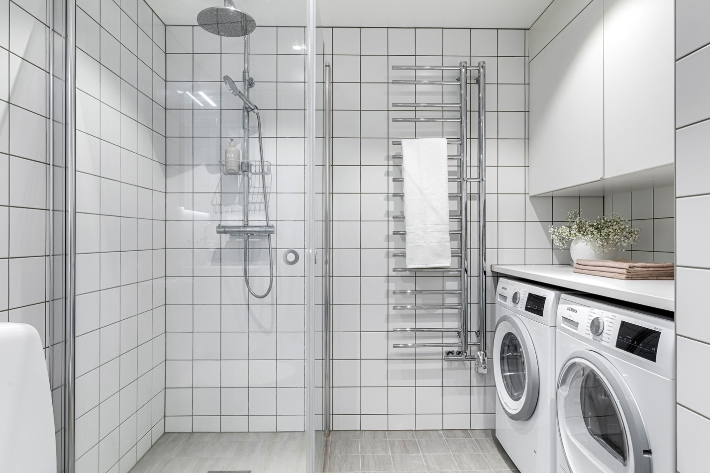 Det helkaklade badrummet går helt i moderna materialval, med vita kvadratiska kakelplattor i kontrast till grå klinkergolv och detaljer i krom. En stilren kommod med underskåp, spegelskåp med belysning samt dusch med glasvägg ger ett rent och luftigt intryck. Här finns även en fullt integrerad tvättdel med både tvättmaskin och torktumlare från Siemens, generös arbetsbänk samt överskåp för praktisk förvaring – perfekt för den som vill ha tvättmöjligheter hemma utan att kompromissa med stil. Golvvärme, handdukstork och infällda spotlights gör detta badrum till ett funktionellt utrymme som känns lika lyxigt som praktiskt.