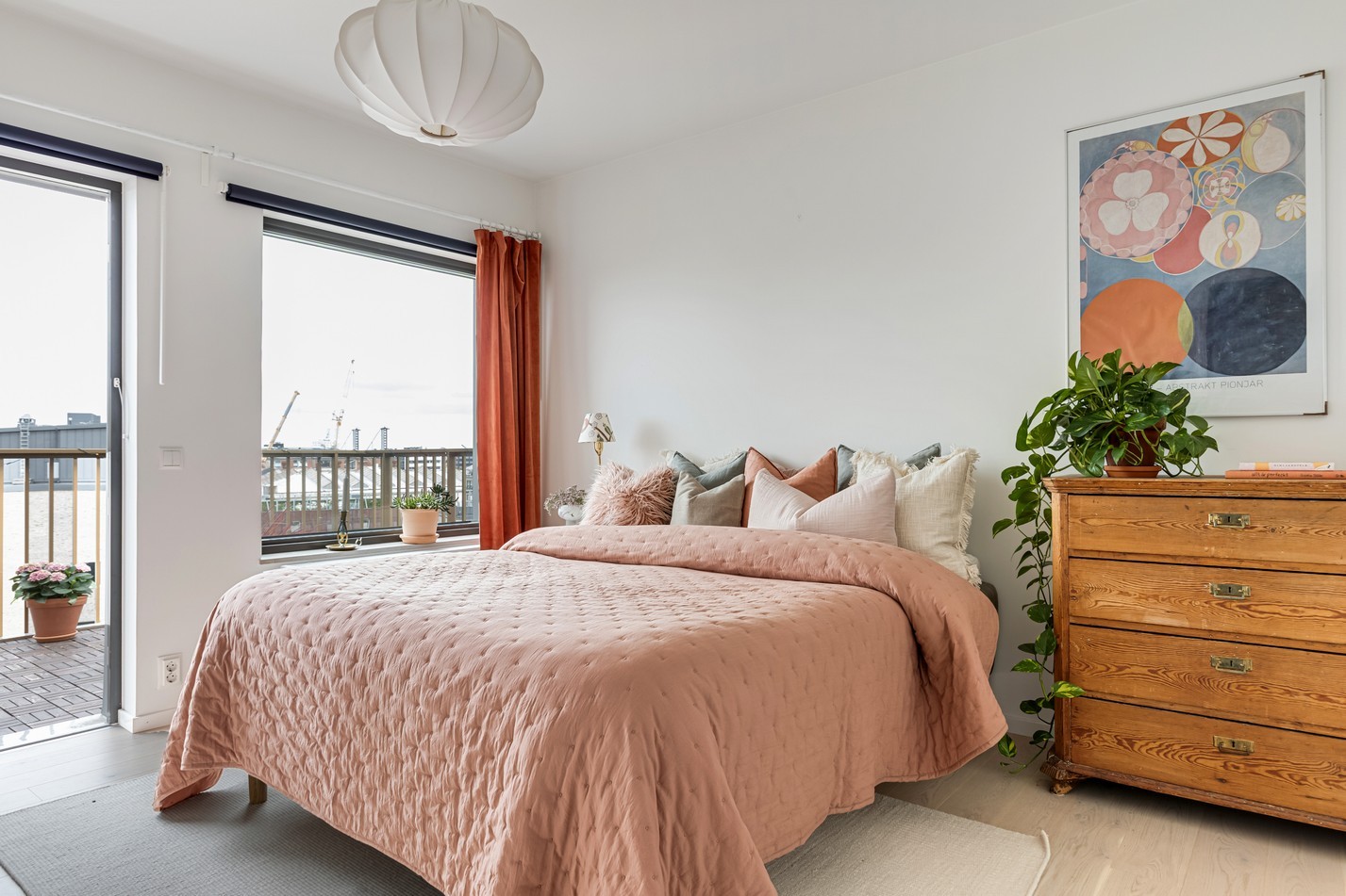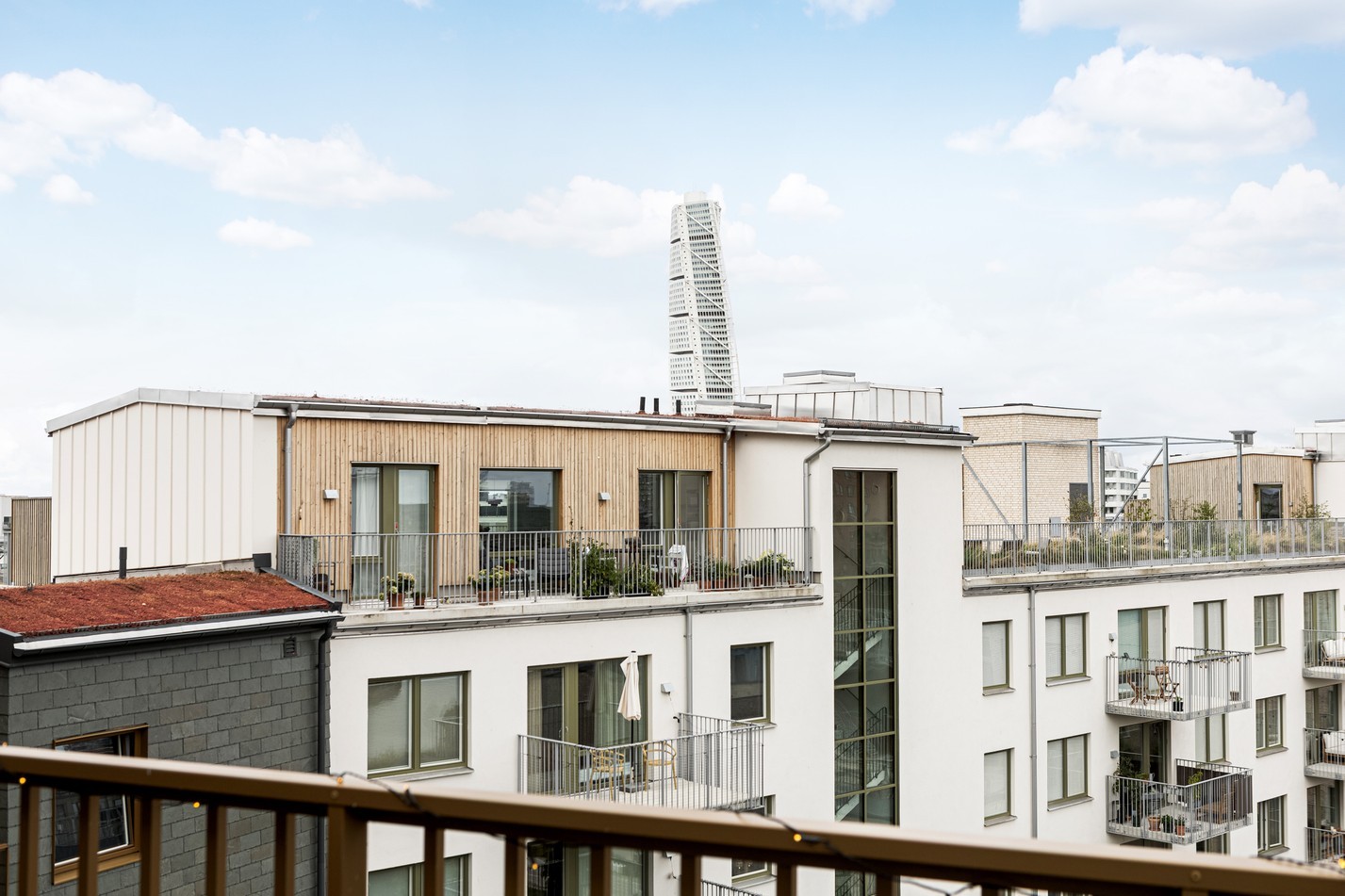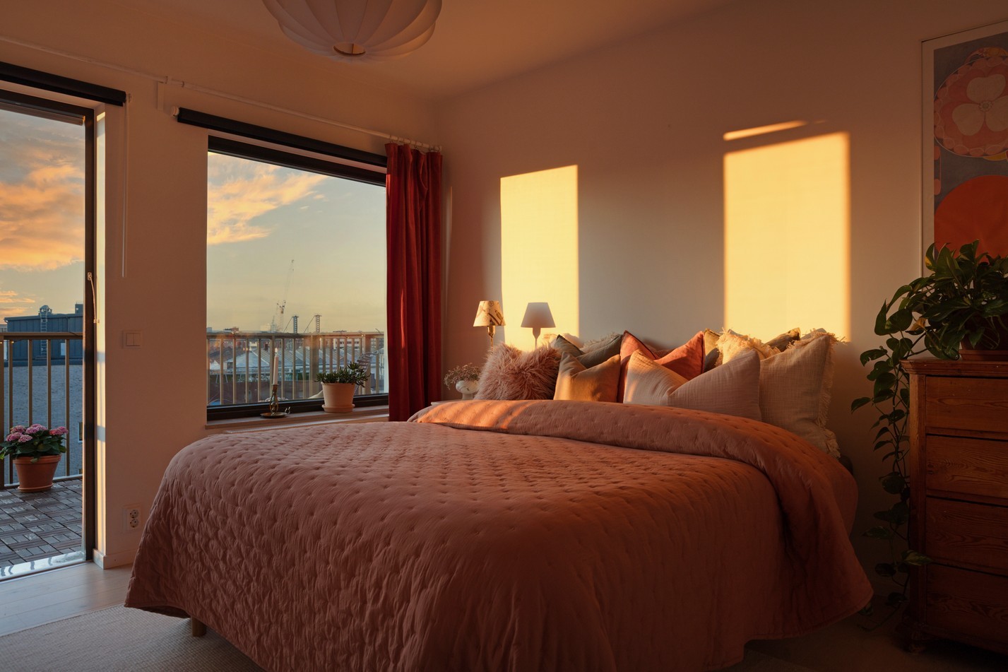 Det större av de två sovrummen erbjuder en lugn och harmonisk oas, perfekt för återhämtning. Rummet rymmer enkelt en dubbelsäng med sängbord på båda sidor samt ytterligare möbler som byrå eller skrivbord. Ljuset strömmar in från två håll, och den behagliga kulörpaletten förstärker rummets varma och rofyllda känsla. Här finns dessutom gott om förvaring tack vare en hel garderobsvägg med skjutdörrar – både snyggt och praktiskt. Från rummet kliver du rakt ut på bostadens andra takterrass – en mer privat yta som vetter mot norr och kvällssolen. Med utsikt över Västra Hamnens taklandskap, Turning Torso och delar av stadens kanalnät, blir detta en idealisk plats för kvällsro, kaffekopp eller ett glas vin i solnedgång. Extra plus för det tillhörande förrådet i direkt anslutning till terrassen – perfekt för att förvara dynor, verktyg eller träningsutrustning nära till hands. Att ha en egen dörr till uteplats direkt från sovrummet ger den där lyxiga hotellkänslan – mitt i hemmet.