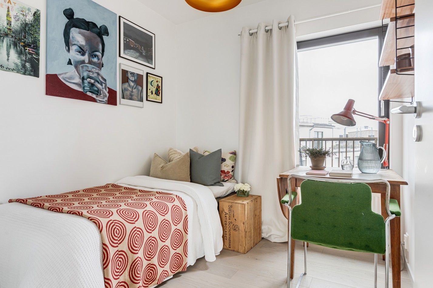 Det här rummet är ett utmärkt komplement till hemmets övriga ytor – perfekt som barnrum, gästrum, arbetsrum eller kreativ studio. Med fönster som vetter mot innergård och taklandskap släpps ett fint dagsljus in, samtidigt som läget ger ett behagligt lugn. Här ryms enkelt en säng, skrivbord och förvaring. Den ljusa färgsättningen, golvet i samma ton som övriga bostaden och fönstrets placering skapar ett luftigt intryck trots rummets nättare storlek. Ett rum som enkelt anpassas efter livet, oavsett om det ska vara mysigt, praktiskt eller inspirerande.