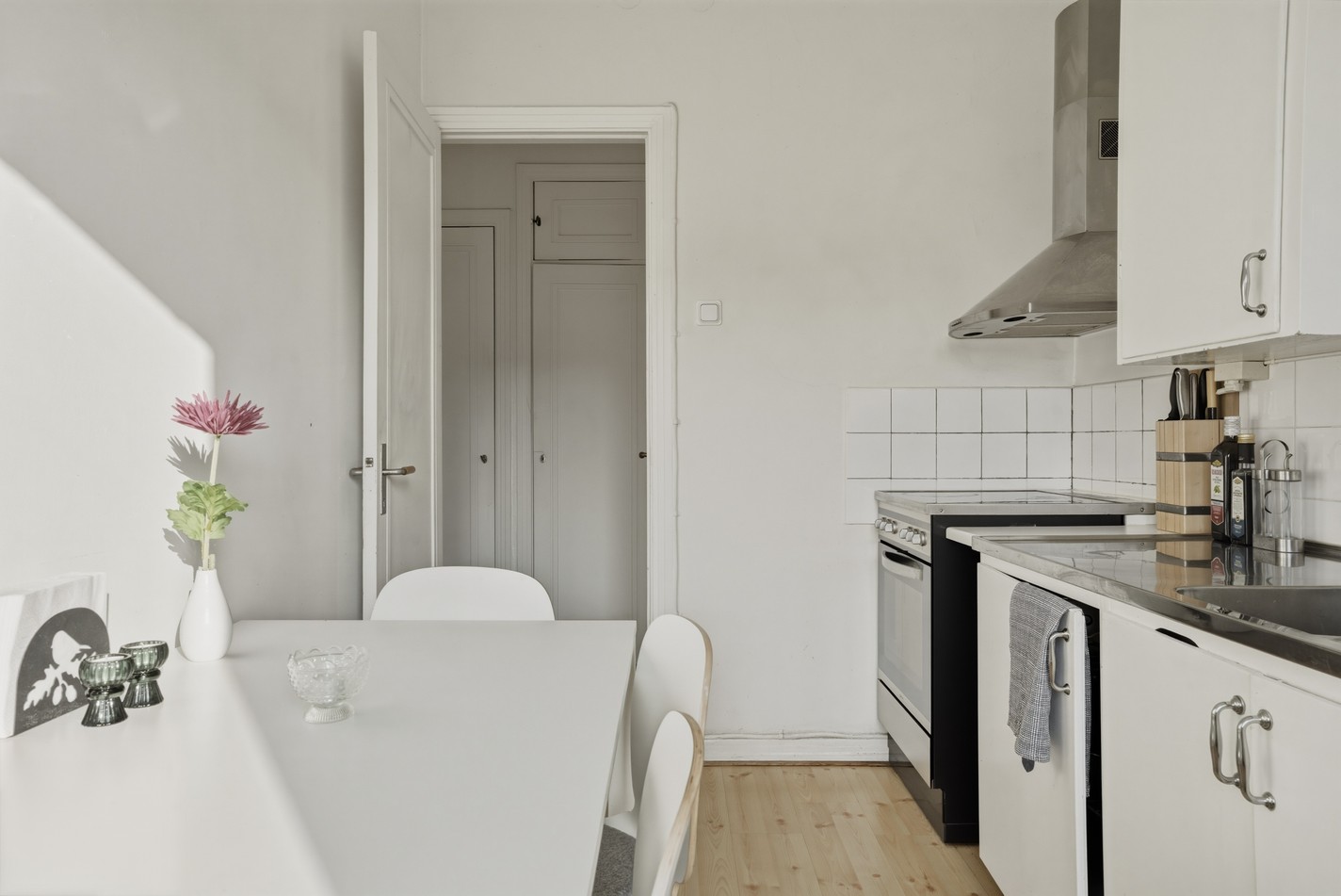 Ljust och trivsamt kök med fint ljusinsläpp från stort fönster. Här finns goda arbetsytor, bra förvaring och plats för matbord vid fönstret – en perfekt miljö för både vardagsmåltider och sociala stunder. Tidlös inredning i ljusa toner skapar en fräsch och inbjudande känsla.