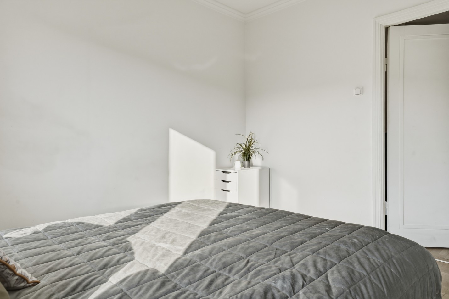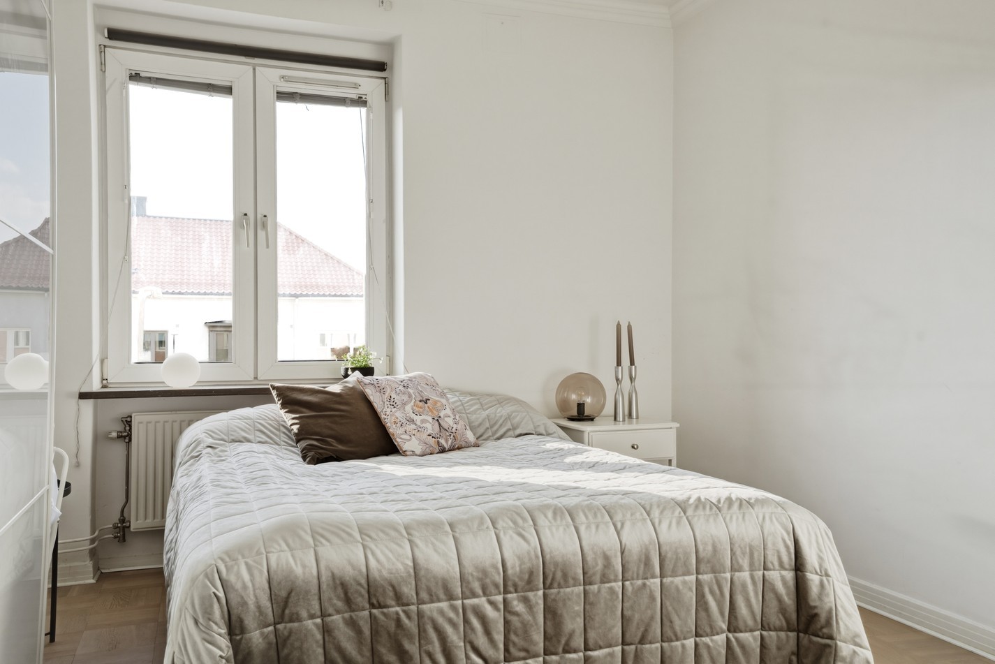 Rofyllt och harmoniskt sovrum med ljusa väggar och fint naturligt ljus från stort fönster. Här ryms enkelt en dubbelsäng med tillhörande möbler samtidigt som rummet behåller en luftig känsla. En lugn och inbjudande plats med goda möjligheter att skapa en personlig oas för vila och återhämtning.