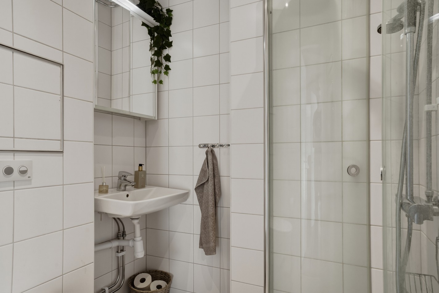 Fräscht och funktionellt badrum med helkaklade väggar i ljusa toner som skapar en ren och tidlös känsla. Här finns dusch med glasväggar, praktiskt spegelskåp samt smart förvaring. Ett lättskött badrum med allt som behövs för en bekväm vardag.