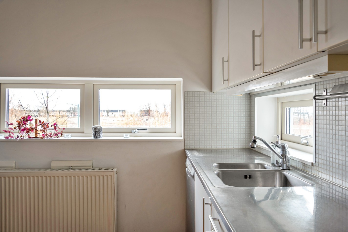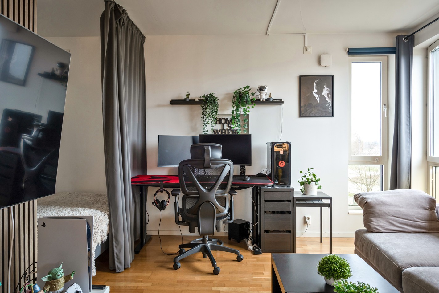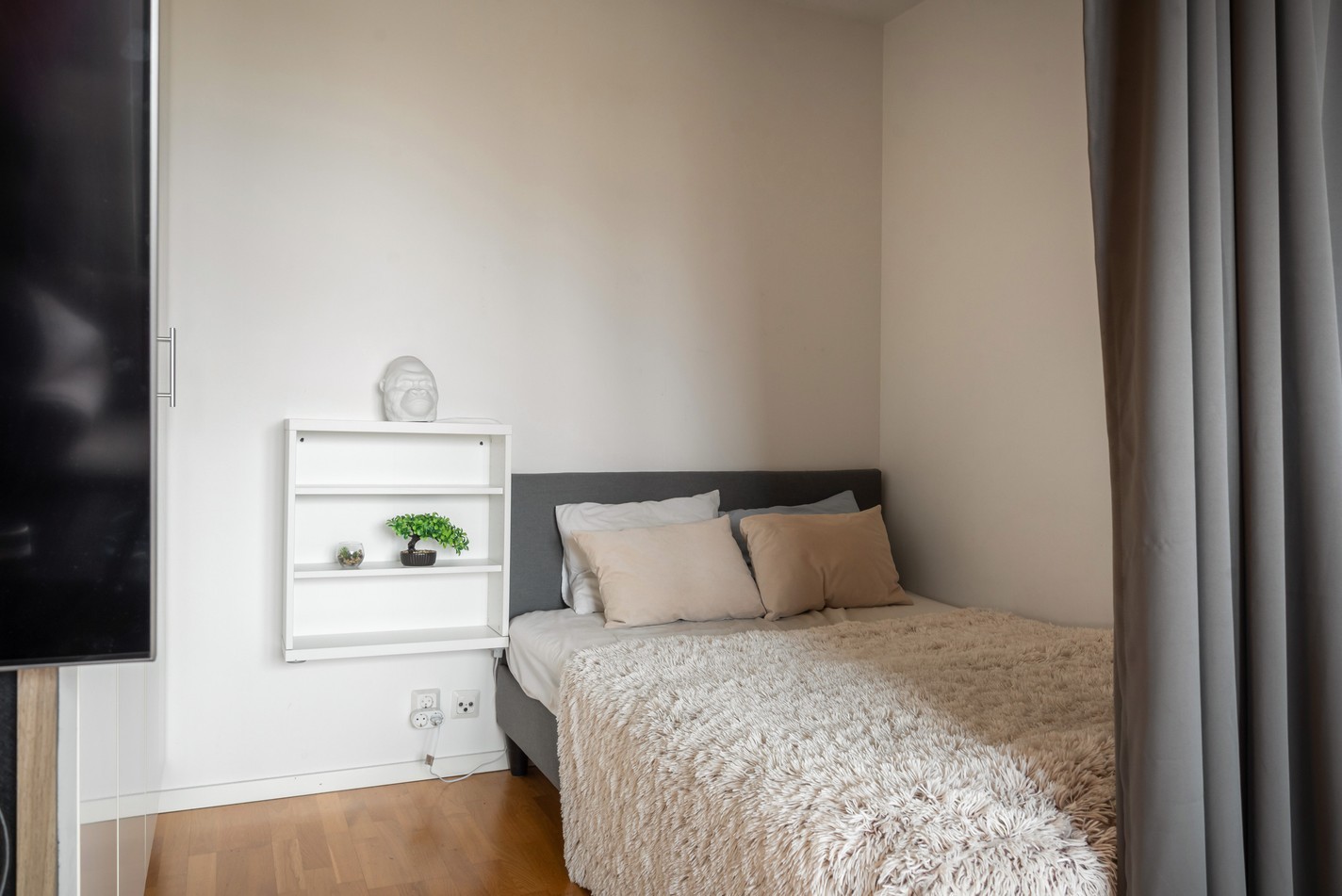 Det luftiga och ljusa allrummet imponerar med sin generösa rymd och smarta planering. Här finns en funktionell sovalkov med gott om förvaring bakom stora garderober. Den genomtänkta planlösningen kombineras med ett fantastiskt ljusinsläpp från de stora fönsterpartierna, som dessutom bjuder på en fri och rogivande utsikt över solrosfält.