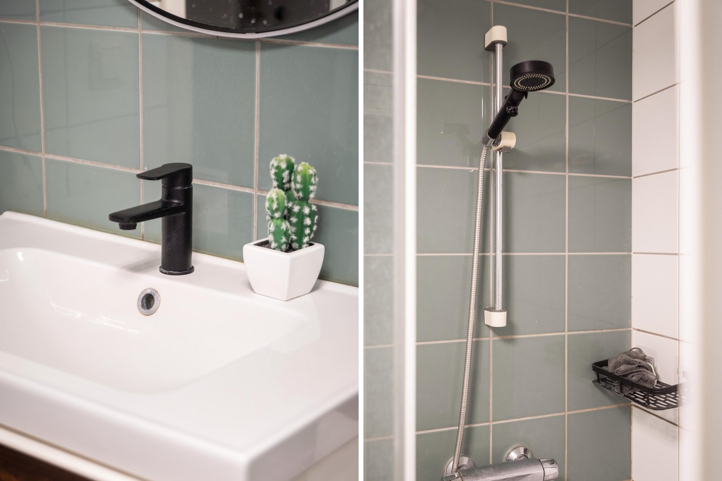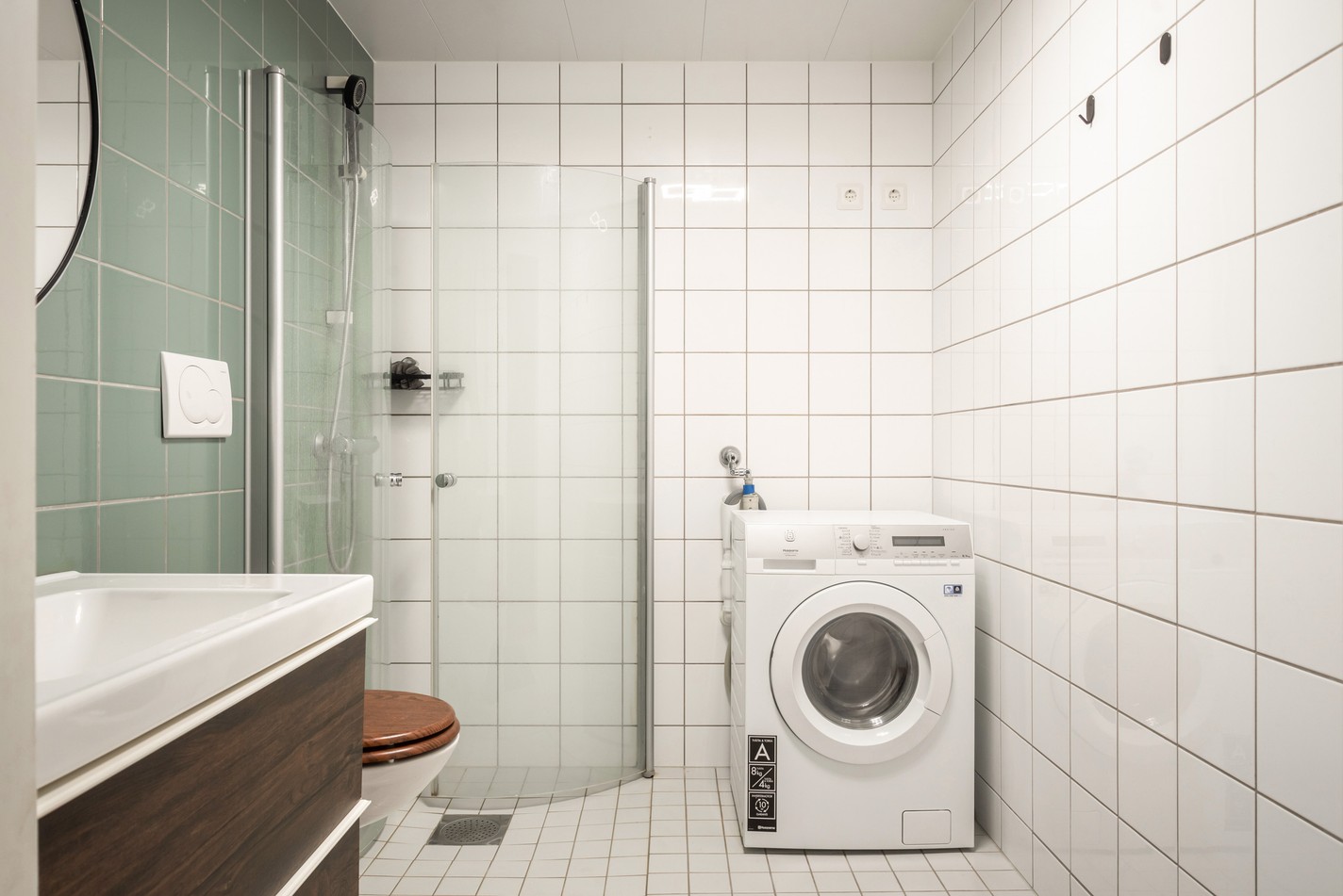 Direkt till höger ligger det rymliga och stilrent helkaklade badrummet. Här finns en dusch med vikbara glasväggar, ett handfat med kommod, ett spegelskåp, wc samt en praktisk kombinerad tvättmaskin och torktumlare – allt utformat för att förenkla din vardag.