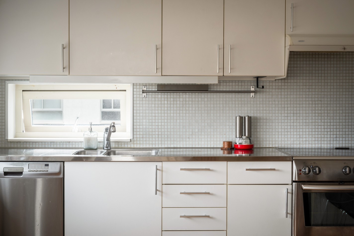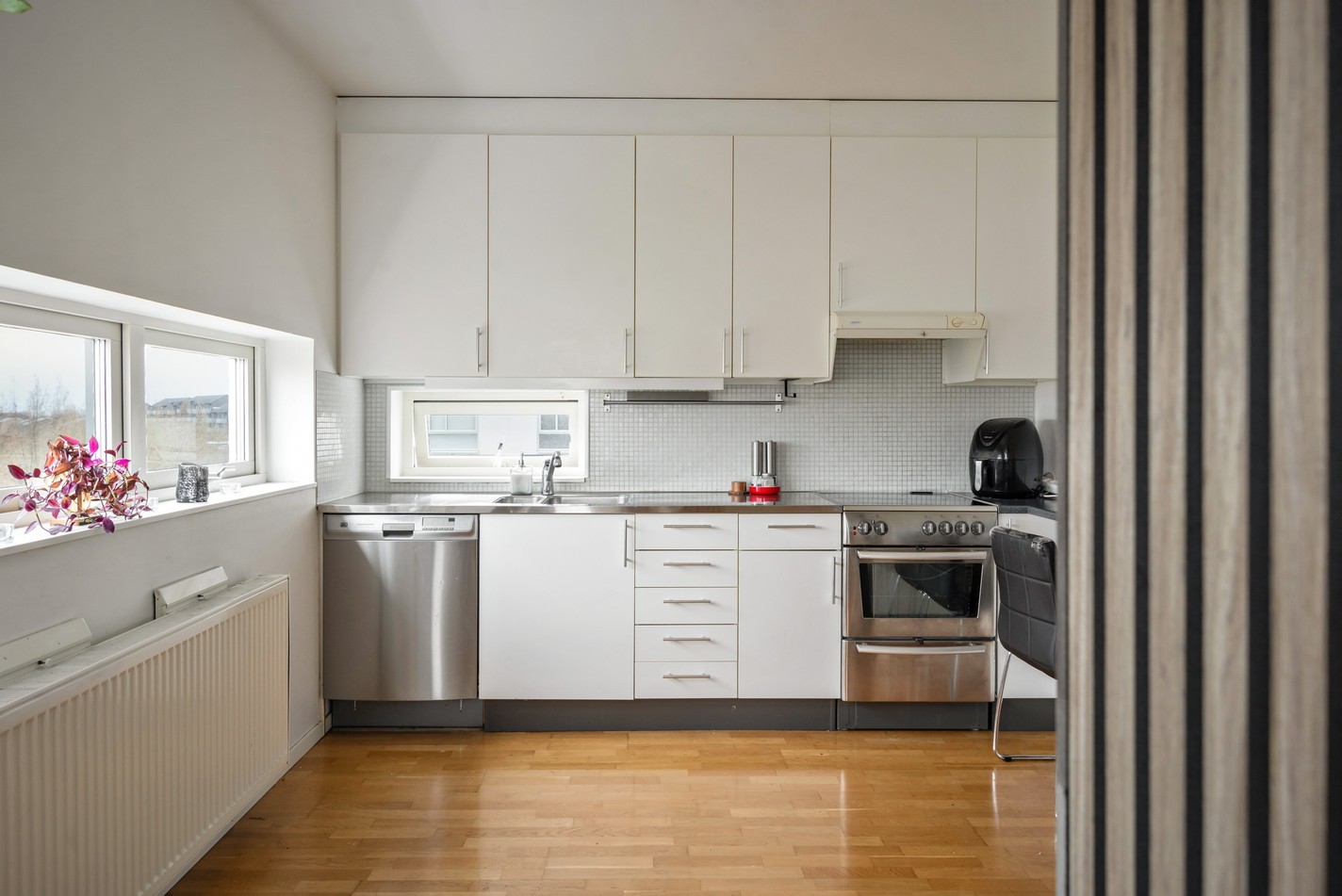 Bostadens kök är en riktig pärla med vita skåpsluckor som elegant matchas med rostfria beslag och en slitstark bänkskiva i rostfritt stål. Det ljusa kaklet ger en fräsch och modern känsla. Köket erbjuder gott om förvaring och arbetsyta, plats för matbord för cirka fyra personer och är utrustat med kyl/frys, spis, ugn, fläkt och diskmaskin – allt för att göra matlagningen enkel och trivsam.