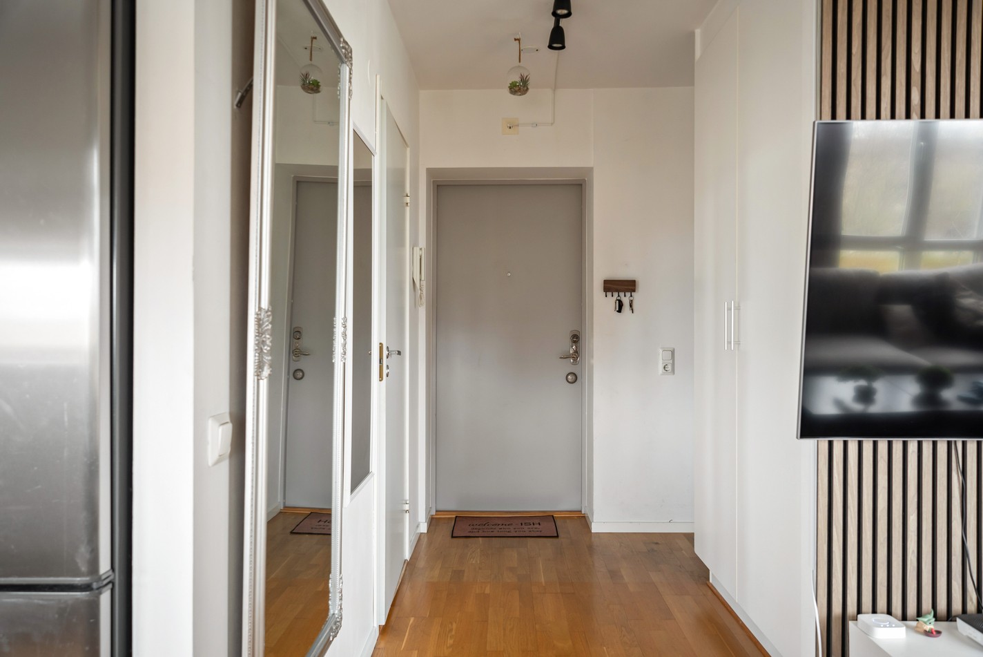 Via hissen från markplan välkomnas du till en inbjudande hall med generöst utrymme för avhängning och extra förvaring i praktiska garderober. Det eleganta parkettgolvet och de ljusa, målade väggarna löper genom hela bostaden och skapar en harmonisk helhet.