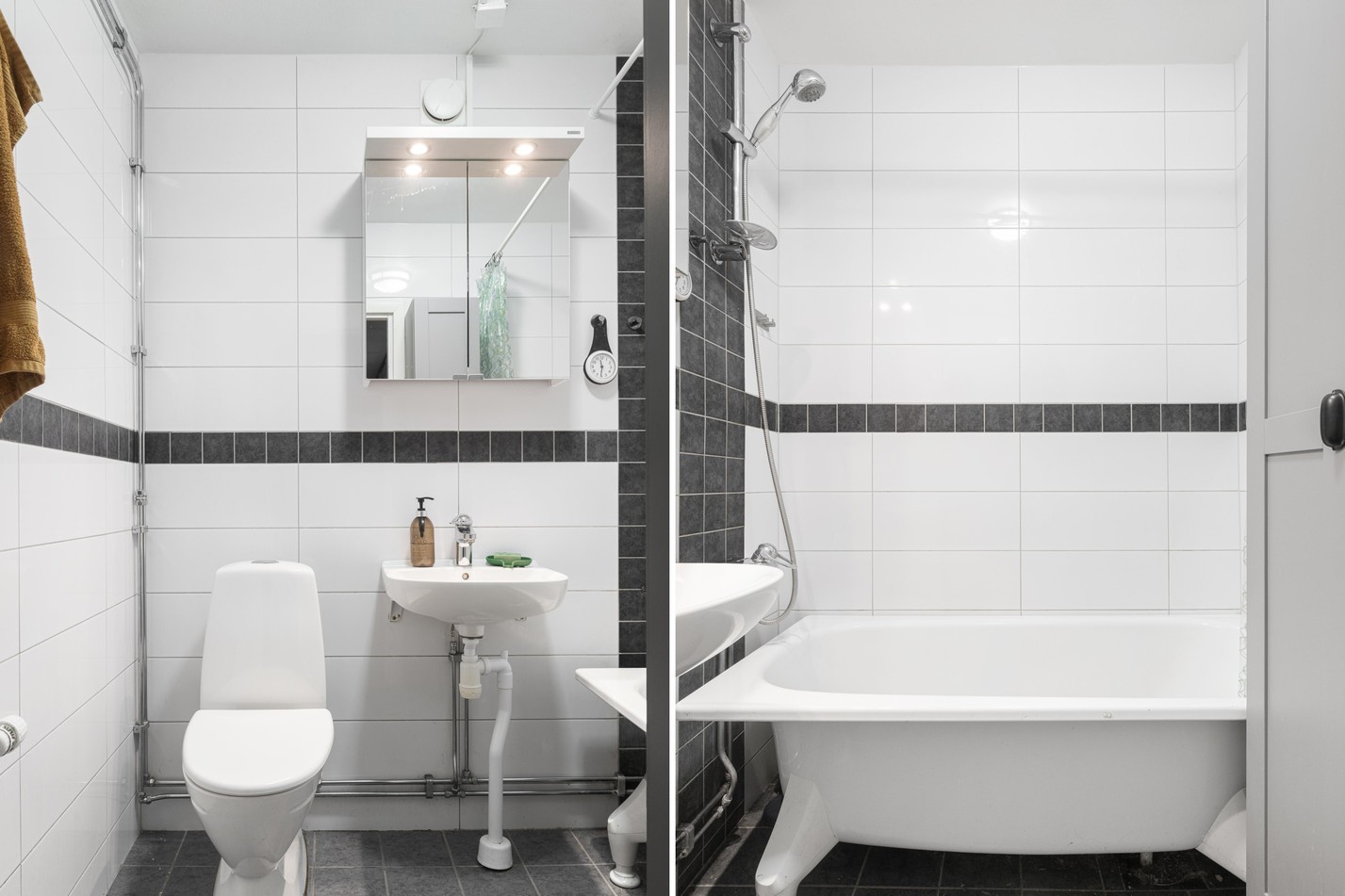 Smakfullt renoverat badrum med stilrena materialval i svart och vitt. Väggarna är helkaklade i vitt med en dekorativ mörk kontrastbård som ger en modern och grafisk känsla. Det snygga klinkergolvet i mörk ton är både praktiskt och lättskött. Här finns ett charmigt fristående badkar med dusch perfekt för både snabba morgonduschar och långa, avslappnande bad.