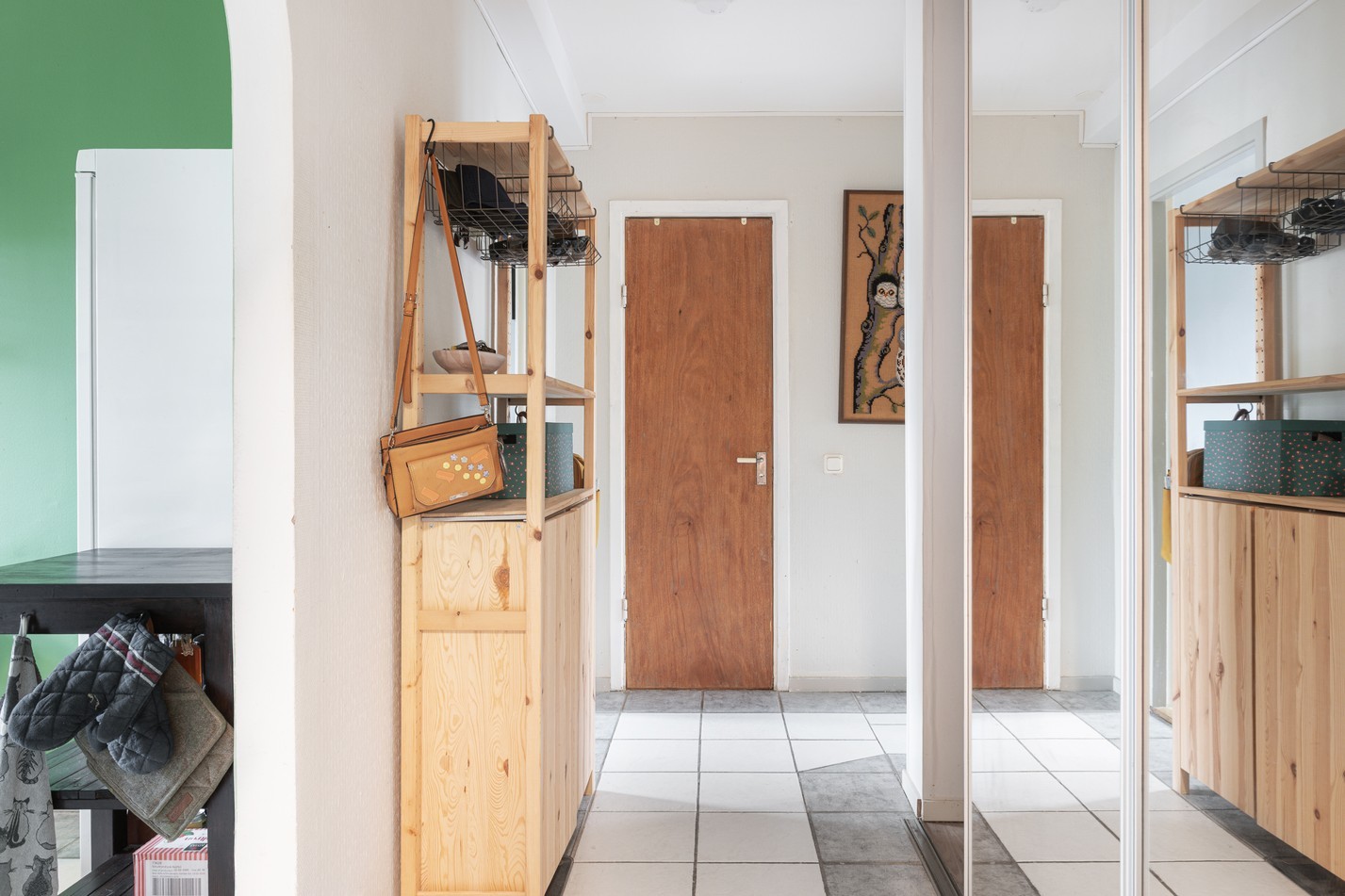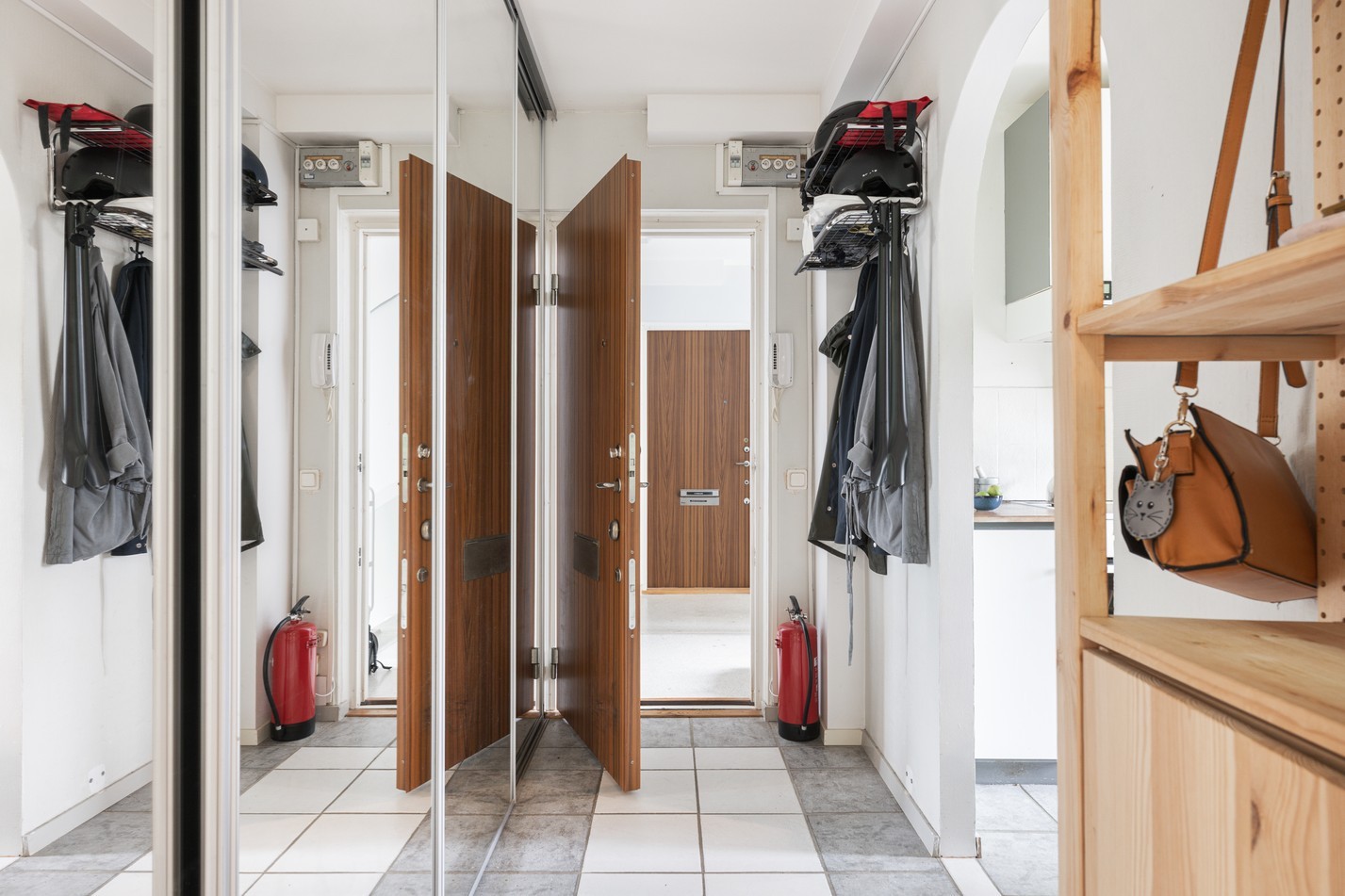 Välkomnande hall med gott om förvaring i form av platsbyggda garderober och spegelskjutdörrar. Ljust klinkergolv och praktiskt utrymme för ytterkläder och skor.