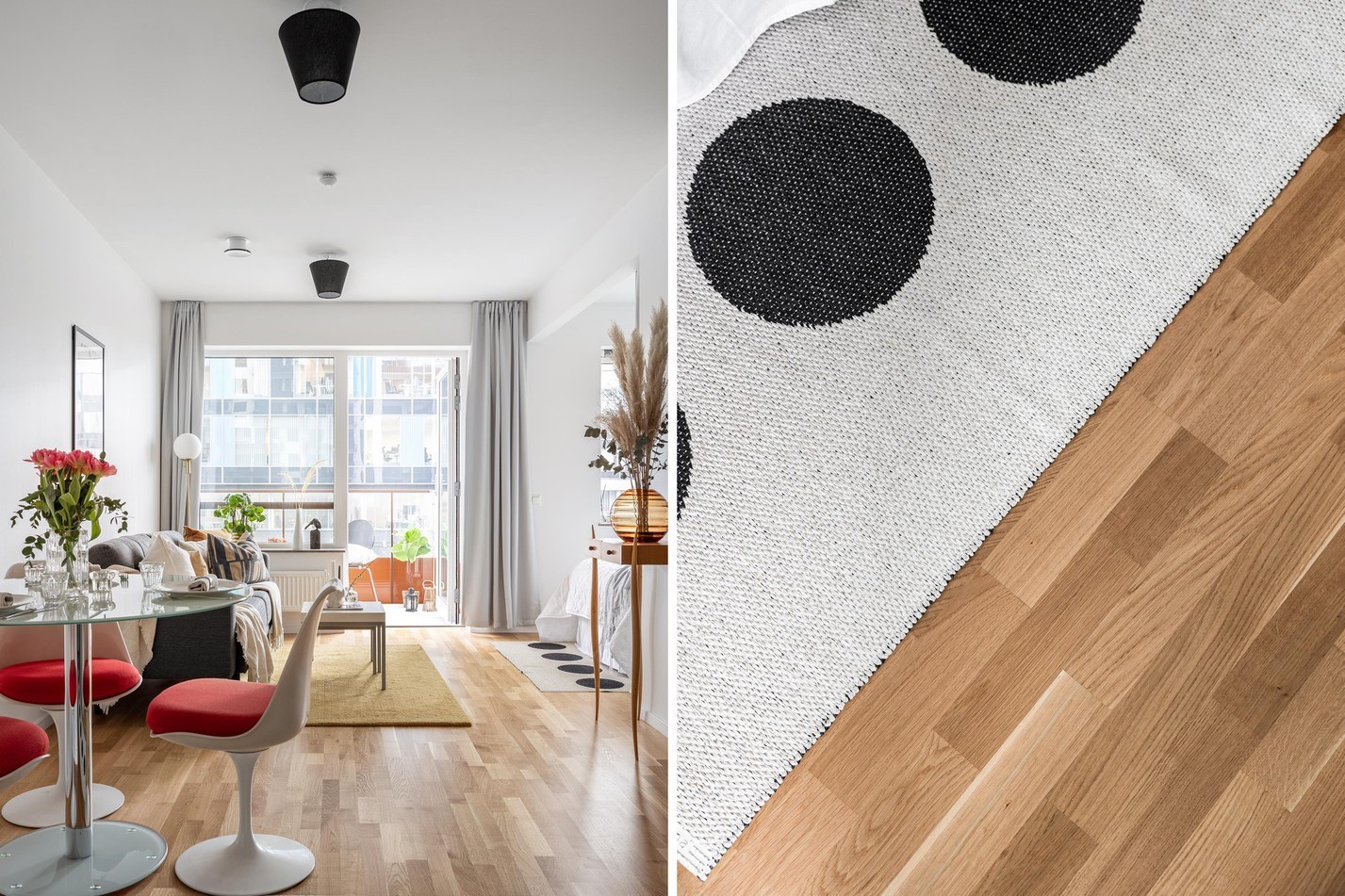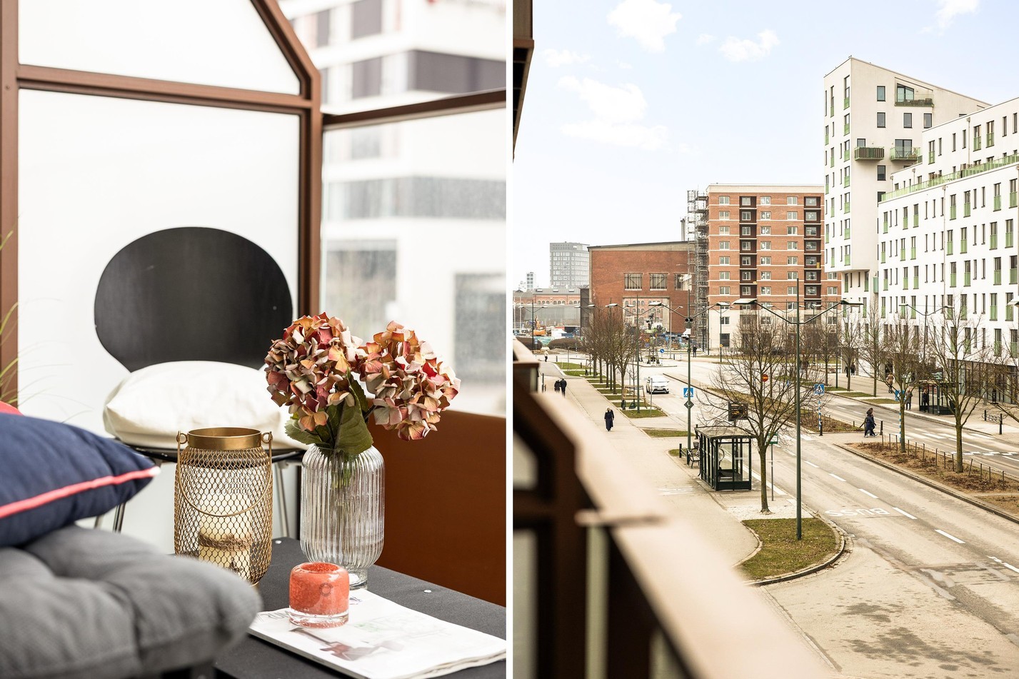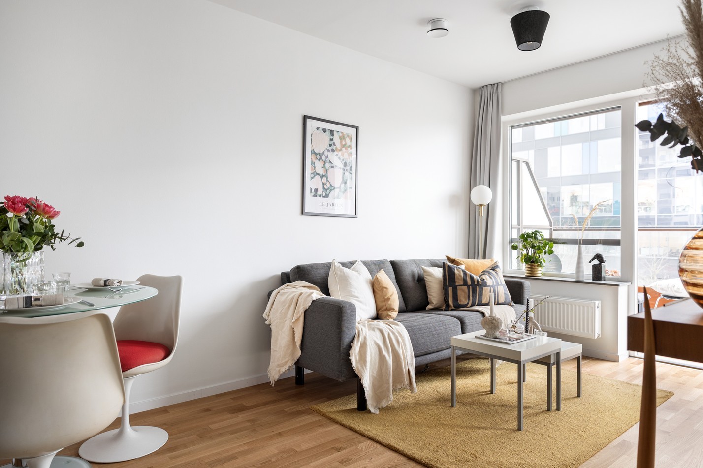 Ett harmoniskt och välplanerat vardagsrum med generöst ljusinsläpp och stilren design. Här finns plats för både avkoppling och middagar vid den trevliga matplatsen. De öppna ytorna skapar en luftig känsla, och från rummet når du balkongen – en härlig förlängning av boendet där du kan njuta av frisk luft och soliga dagar.