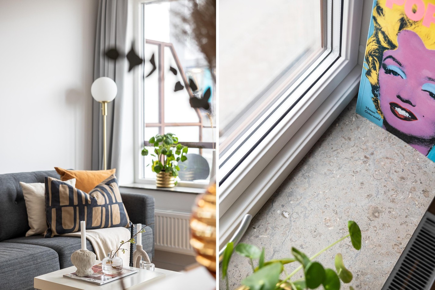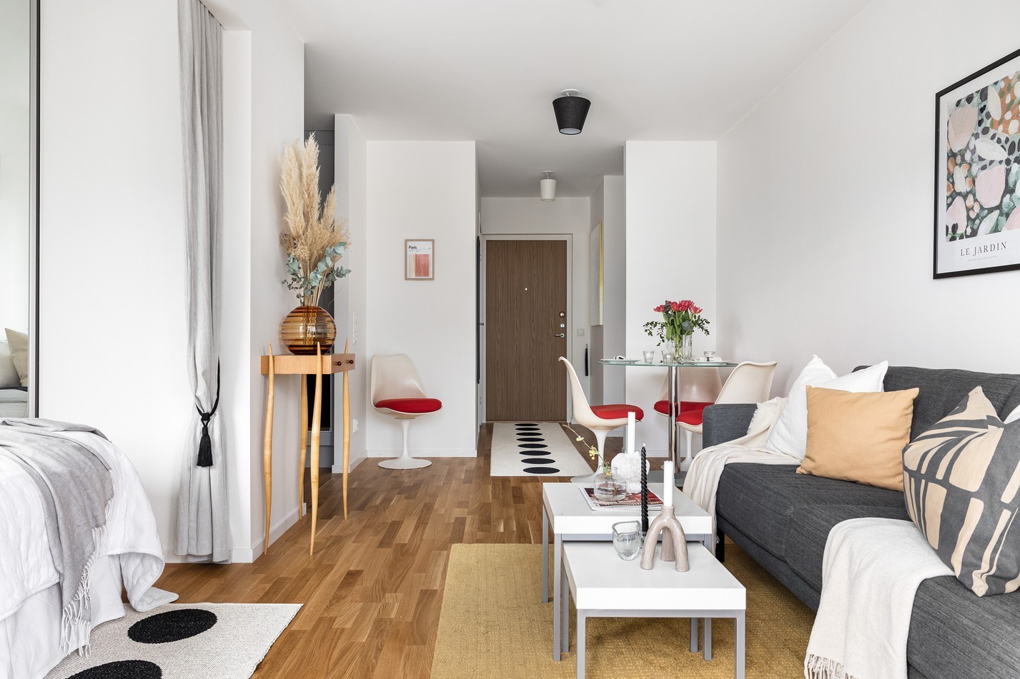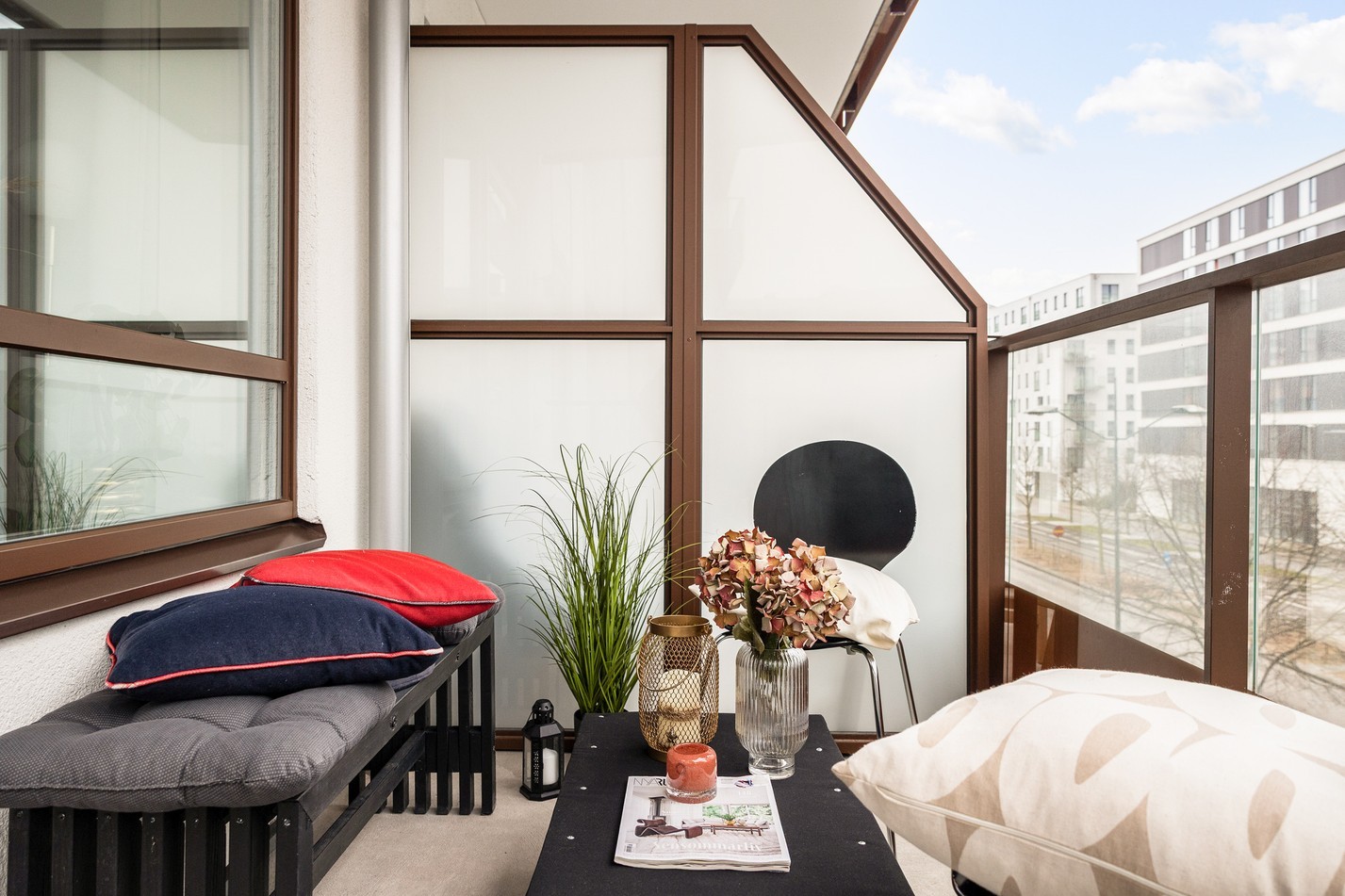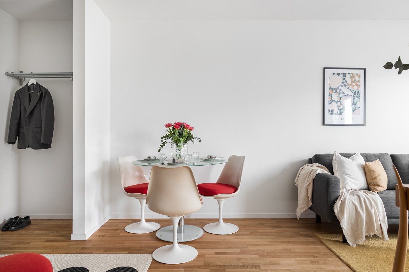 Ett harmoniskt och välplanerat vardagsrum med generöst ljusinsläpp och stilren design. Här finns plats för både avkoppling och middagar vid den trevliga matplatsen. De öppna ytorna skapar en luftig känsla, och från rummet når du balkongen – en härlig förlängning av boendet där du kan njuta av frisk luft och soliga dagar.