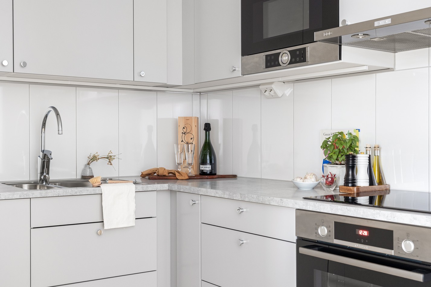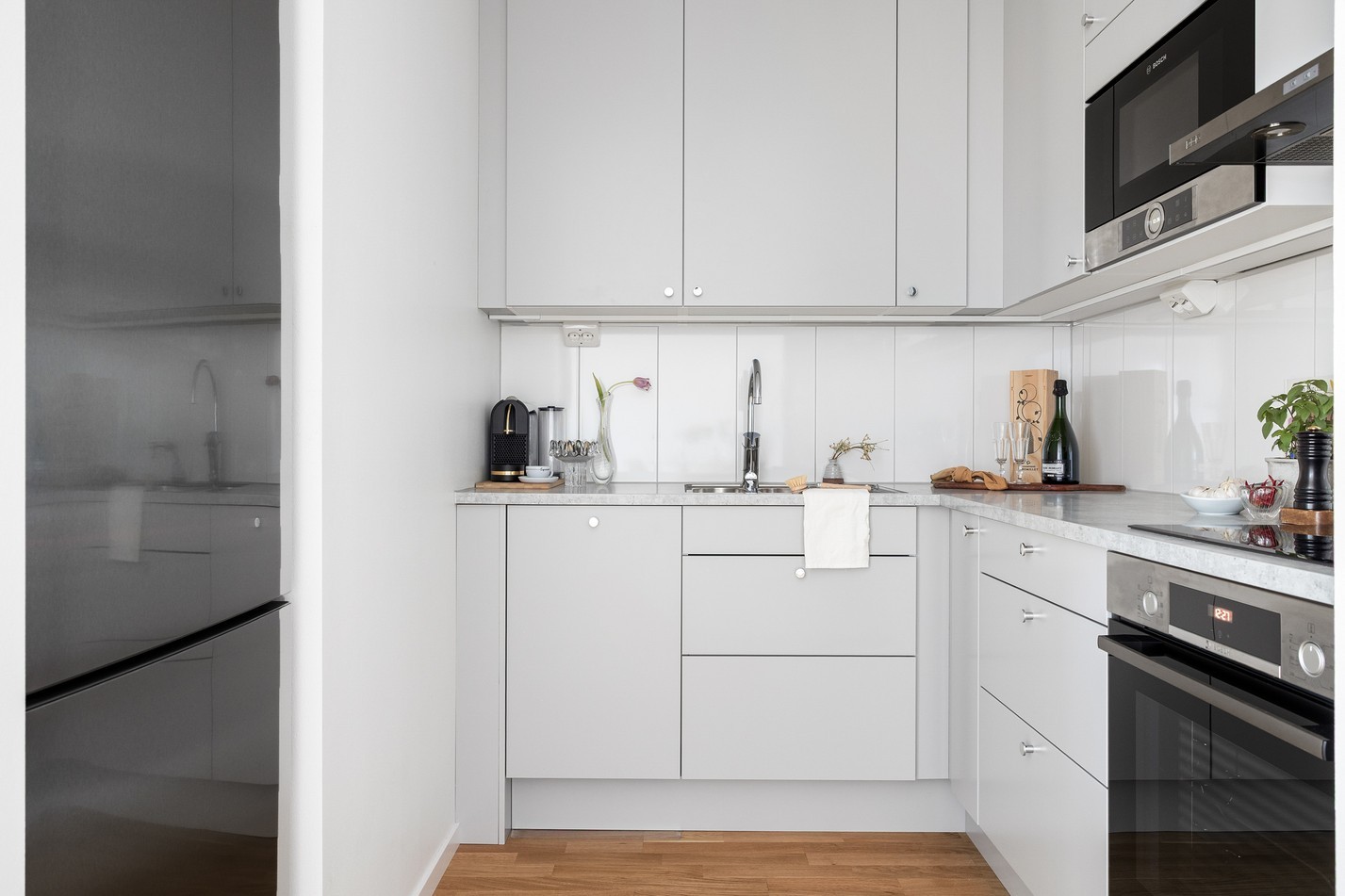 Ett smakfullt och välplanerat kök med stilrena gråa skåpluckor och moderna vitvaror. Den genomtänkta planlösningen ger gott om arbetsyta och förvaring, samtidigt som de ljusa materialen skapar en luftig och harmonisk känsla. Här får du en perfekt balans mellan design och funktion – ett kök som bjuder in till både matlagning och trevliga stunder!