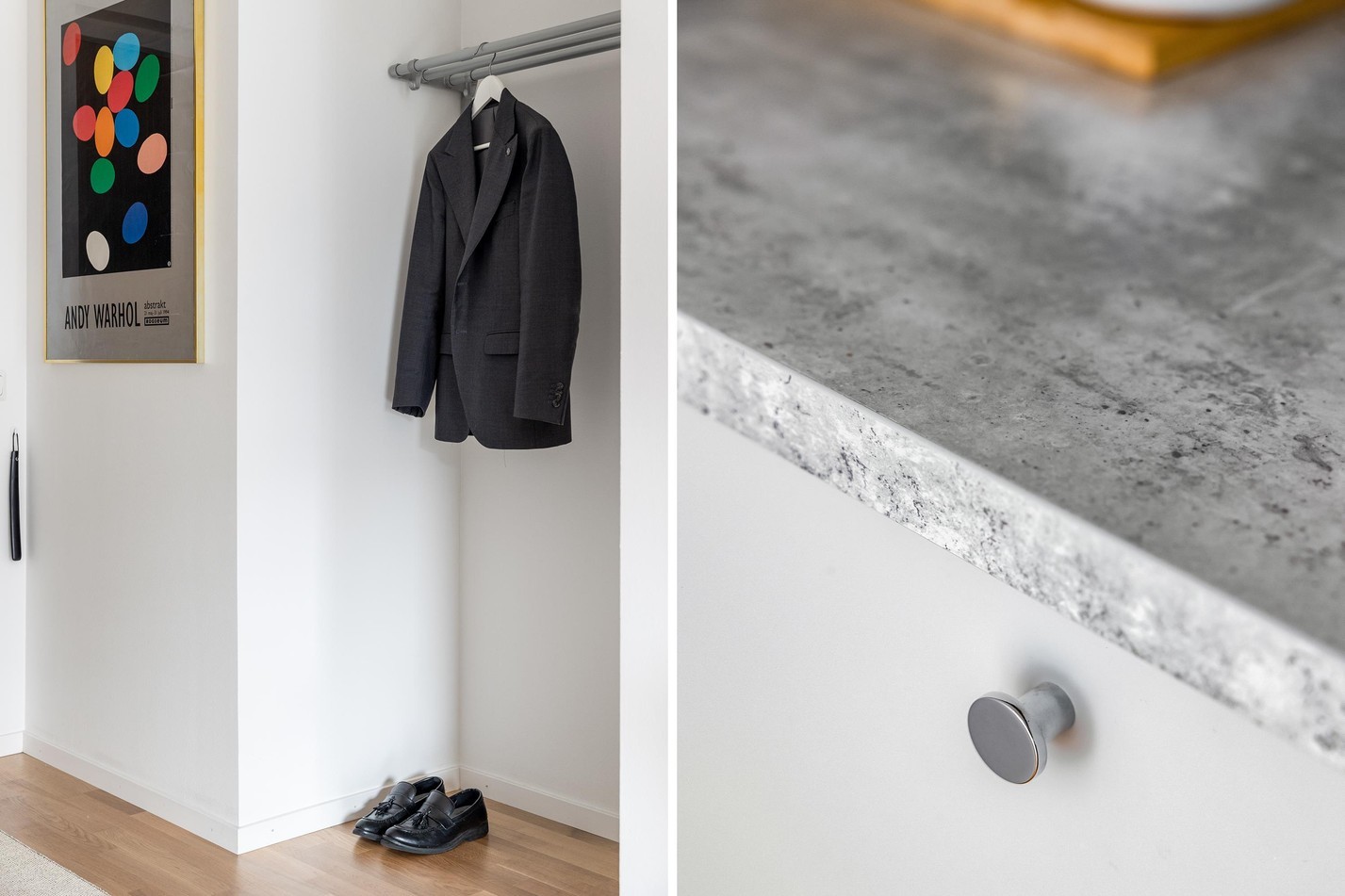 En stilren och praktisk hall med platsbyggd förvaring som skapar en organiserad och inbjudande entré. De ljusa väggarna och det vackra parkettgolvet ger ett stilrent första intryck och binder ihop bostadens moderna känsla. Här finns gott om plats för ytterkläder och skor – en hall som kombinerar funktion och design på bästa sätt!