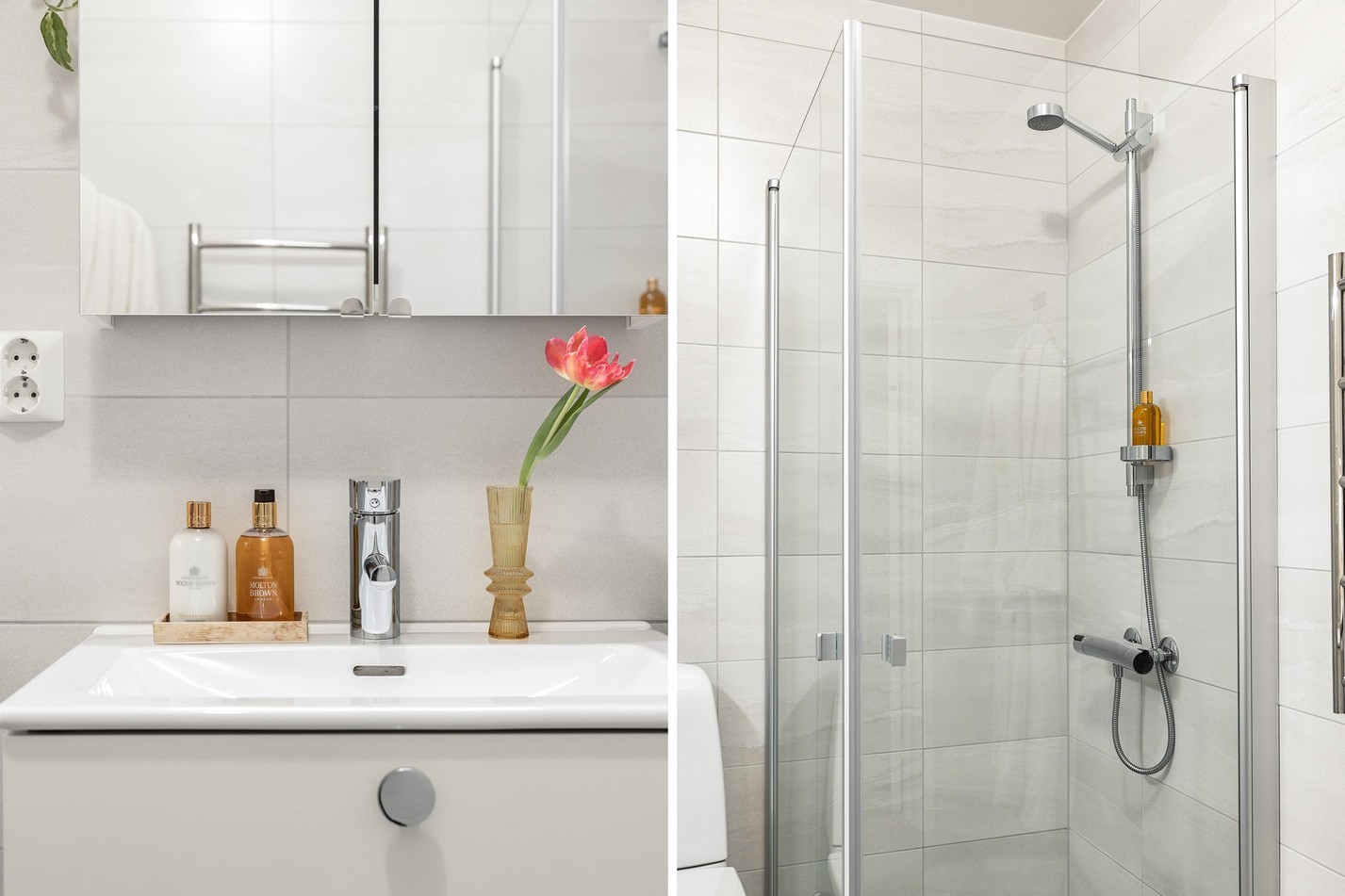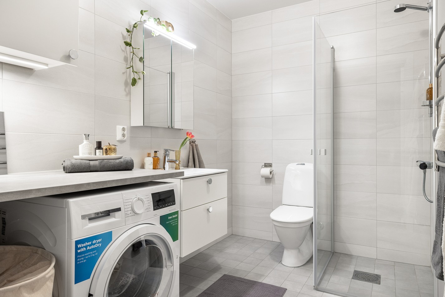 Ljust och smakfullt badrum med tidlösa materialval. Helkaklade väggar och klinkergolv skapar en exklusiv känsla, medan den smarta planlösningen ger gott om förvaring. Här finns en praktisk kombimaskin med både tvätt- och torkfunktion, dusch med glasvägg och handdukstork för extra komfort. Ett badrum som kombinerar funktionalitet med elegans!